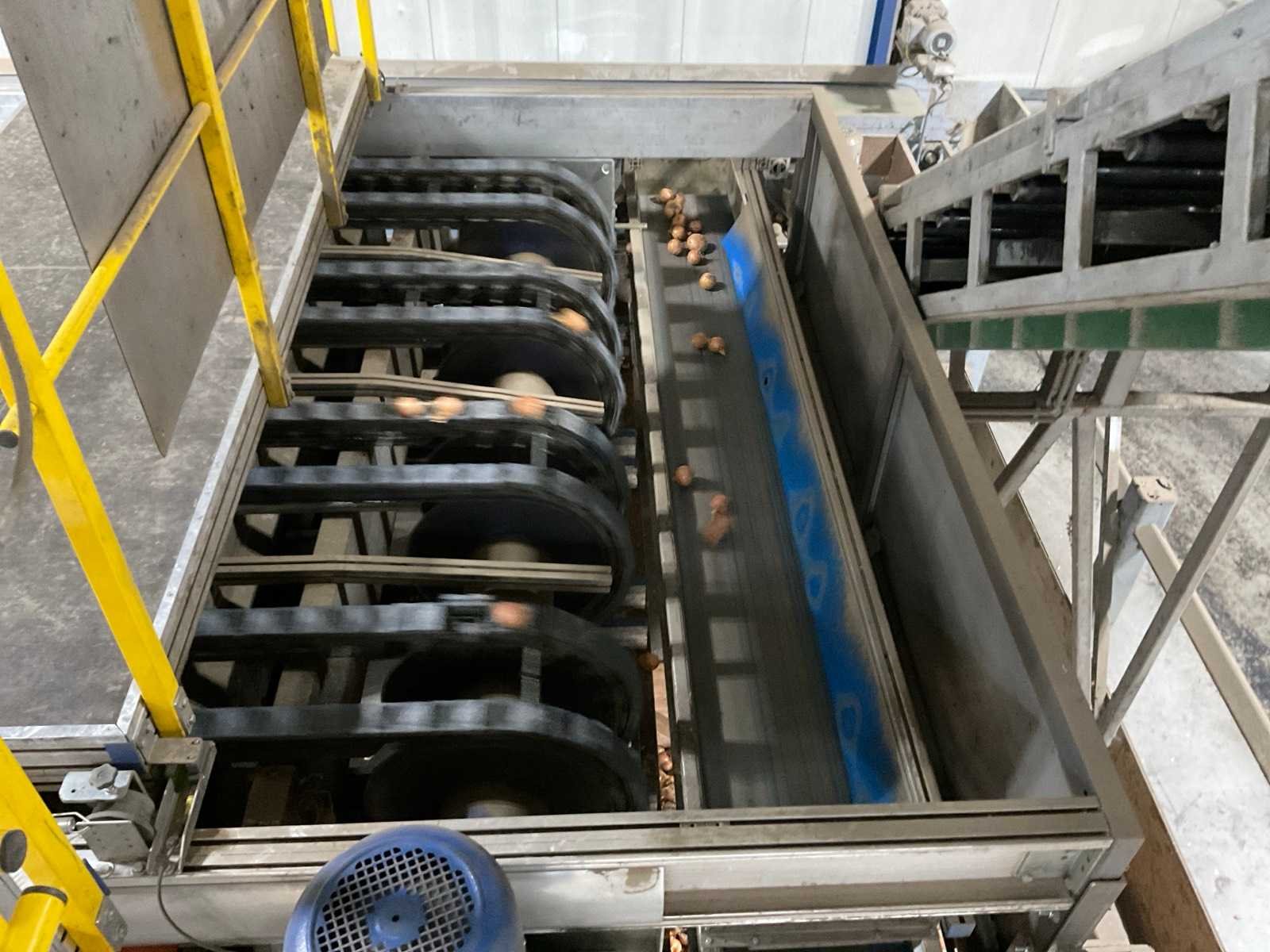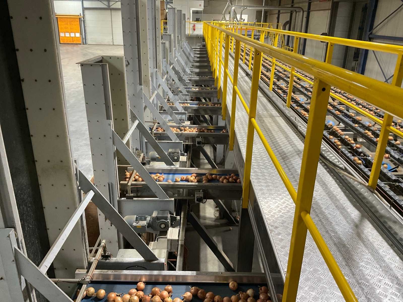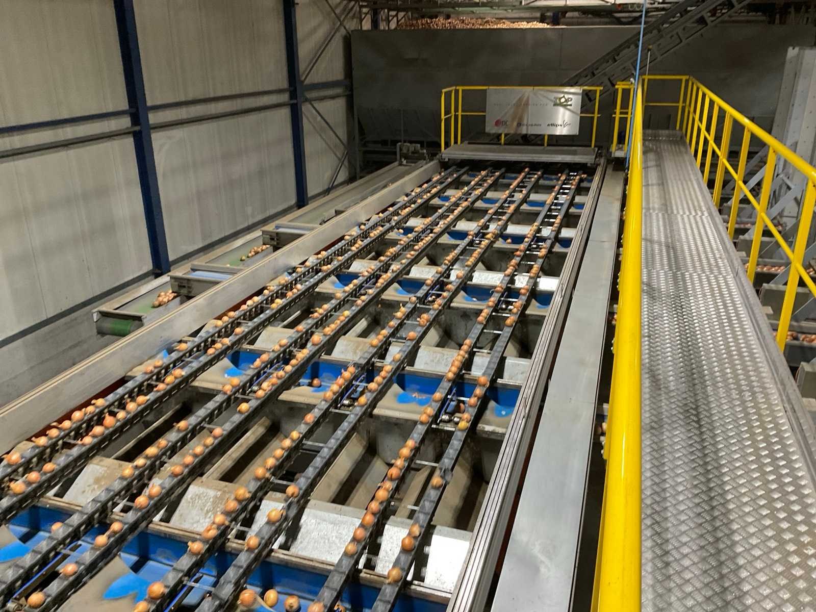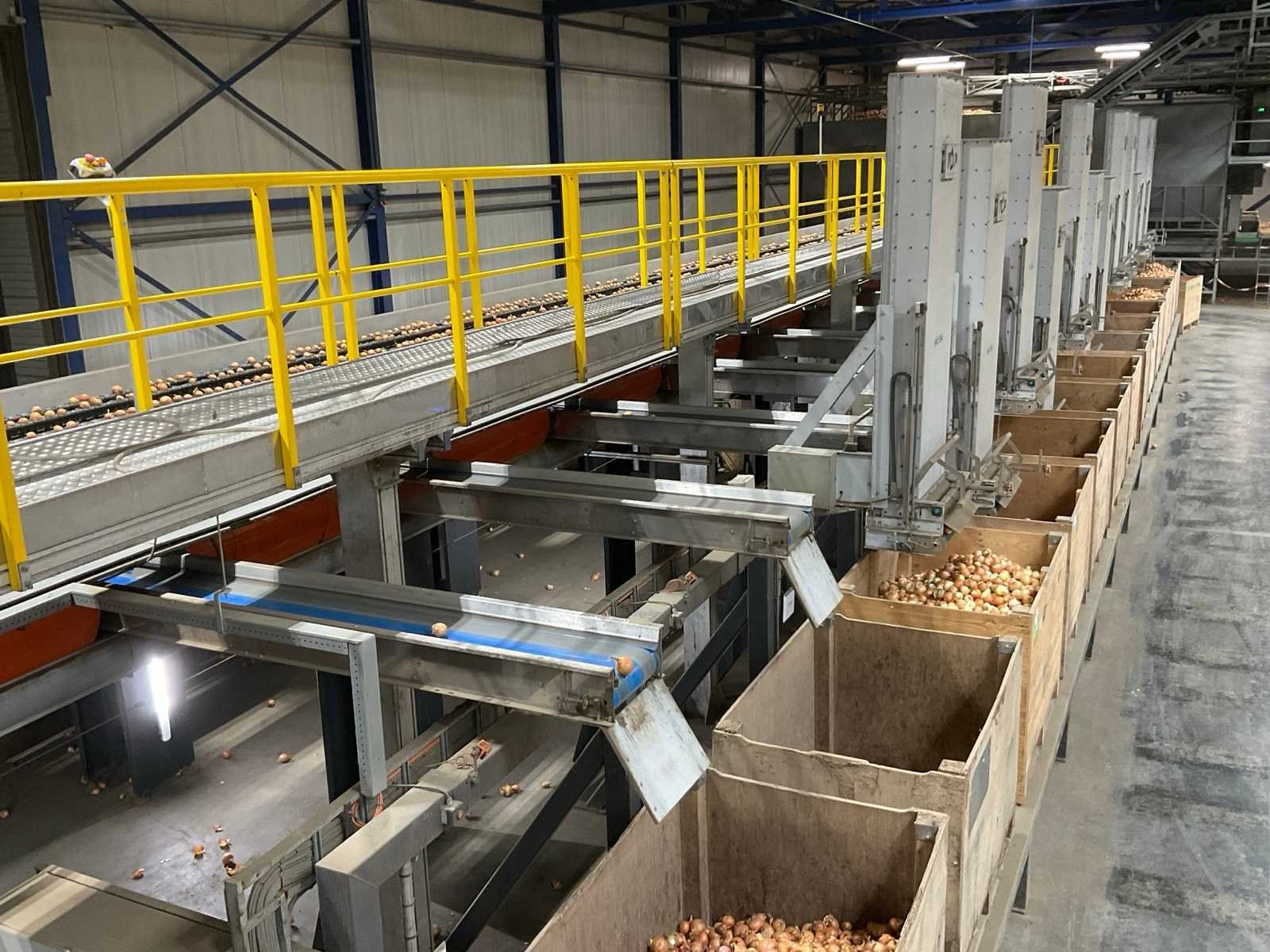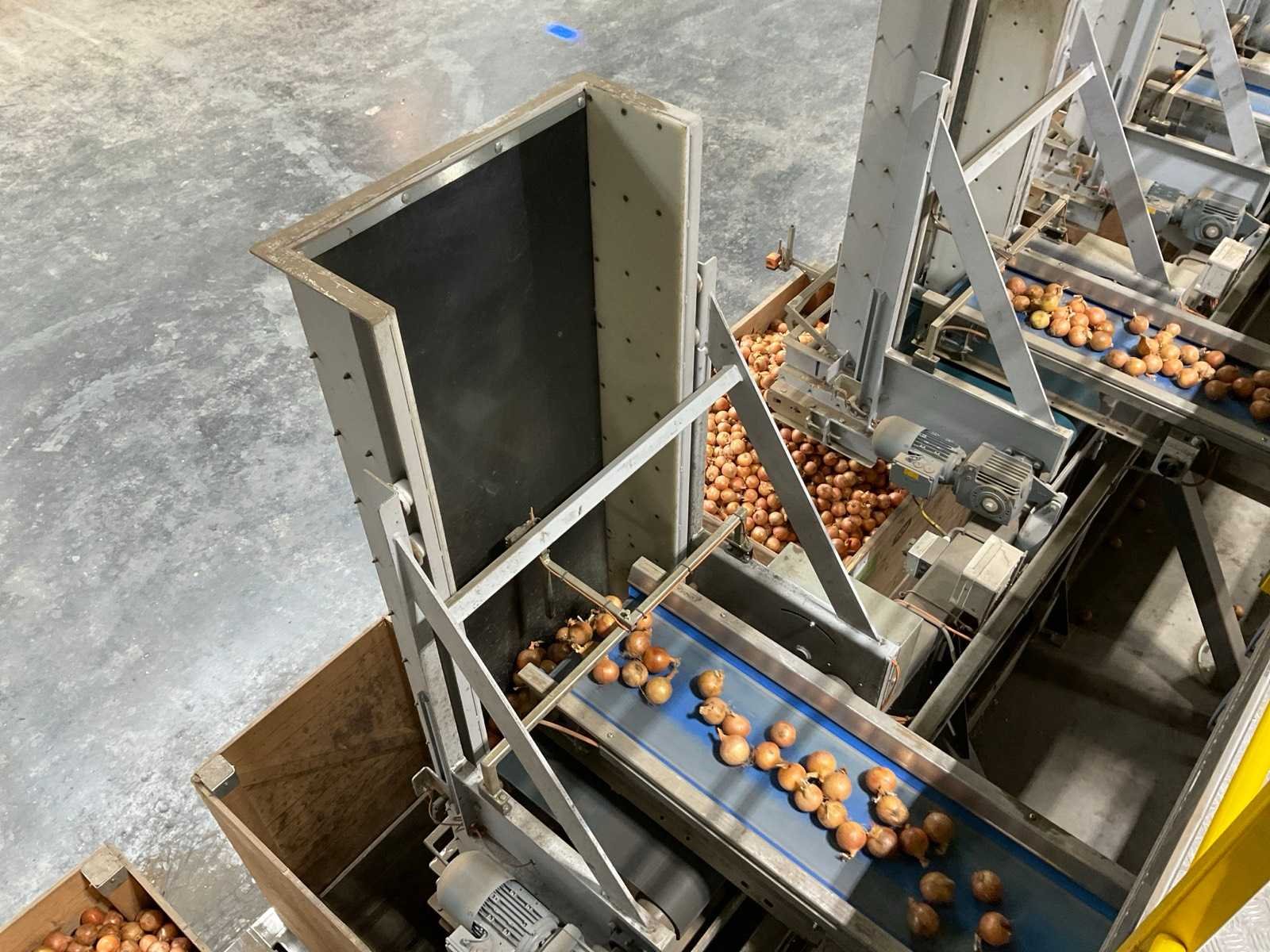 8-lijner optische uien sorteerlijn; cap. ca. 22.000 - 24.000 uien per uur; bij gemiddeld uien gewicht van 120 gram; cup snelheid 10 cups per seconde; TrueSort Ellips systeem voor gewicht; diameter; vorm; kleur en externe kwaliteit; NIR; met aanvoer rollenbaan en breedband; werkbreedte ca. 2600 mm; rollenbaan afm. ca. 2000x2250 mm; v.v. 8-lijner elektronische sorteerder met V-banden; type Gran Torino GTW; met 11 uitgangen; incl. vernenkelaar; min. Ø 75 mm; max. Ø 150 mm; (12x) kistenvuller met kistdetectie; uitvoerbreedte ca. 860 mm; (1x) uitvoer transportband voor monsters; band afm. ca. 4200x400 mm; (1x) transportband voor monsters; band afm. ca. 3500x500 mm; (10x) terugvoer transportbanden; band afm. ca. 4800x400 mm; (10x) uitvoer transportbanden; band afm. ca. 8500x400 mm; incl. kistenkantelaar; kisten maat 1700x1200x1250 mm; invoerbunker; bunker afm. ca. 2000x2300x3300 mm; met dwarsgelegen uitvoer transportband; bandbreedte ca. 600 mm; aluminium bordes; lengte ca. 60 meter; besturing; schakelkasten etc. LET OP! Kavel dient uiterlijk op 31 mei te zijn gedemonteerd en opgehaald. De koper dient dit zelf te organiseren. No Merk: Elisam Type: Ellips Bouwjaar: 2017 Aansluiting: 400V