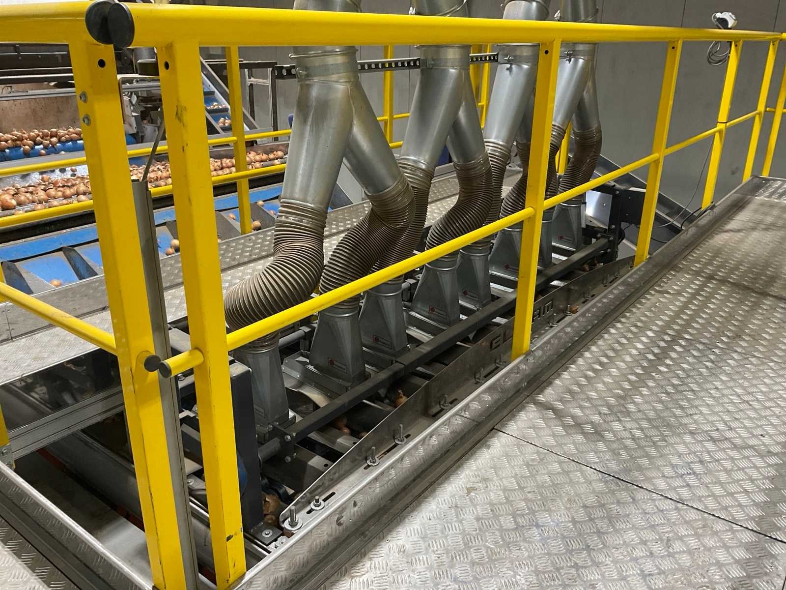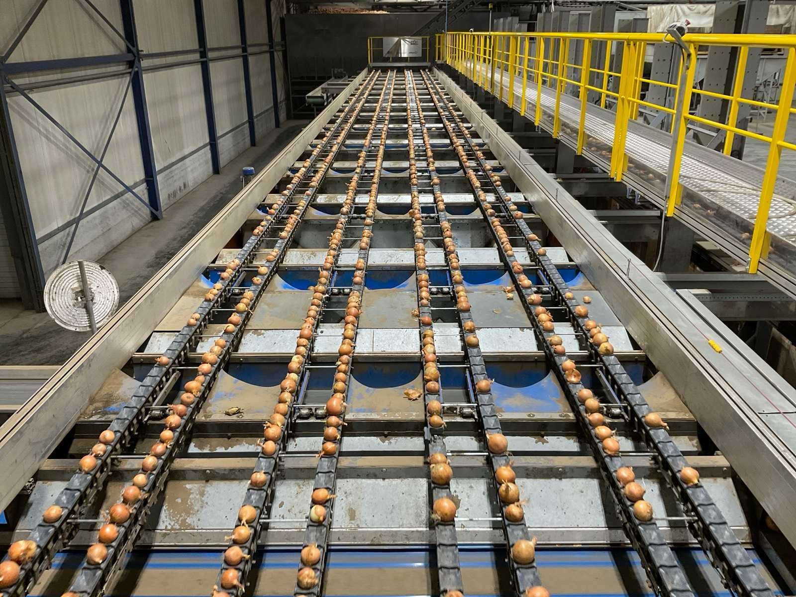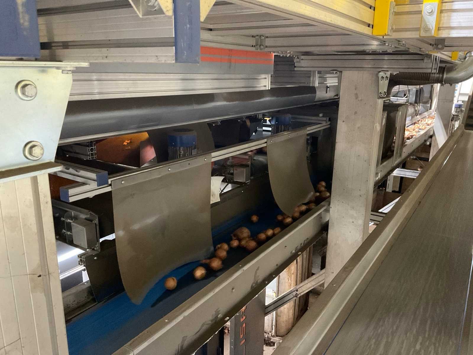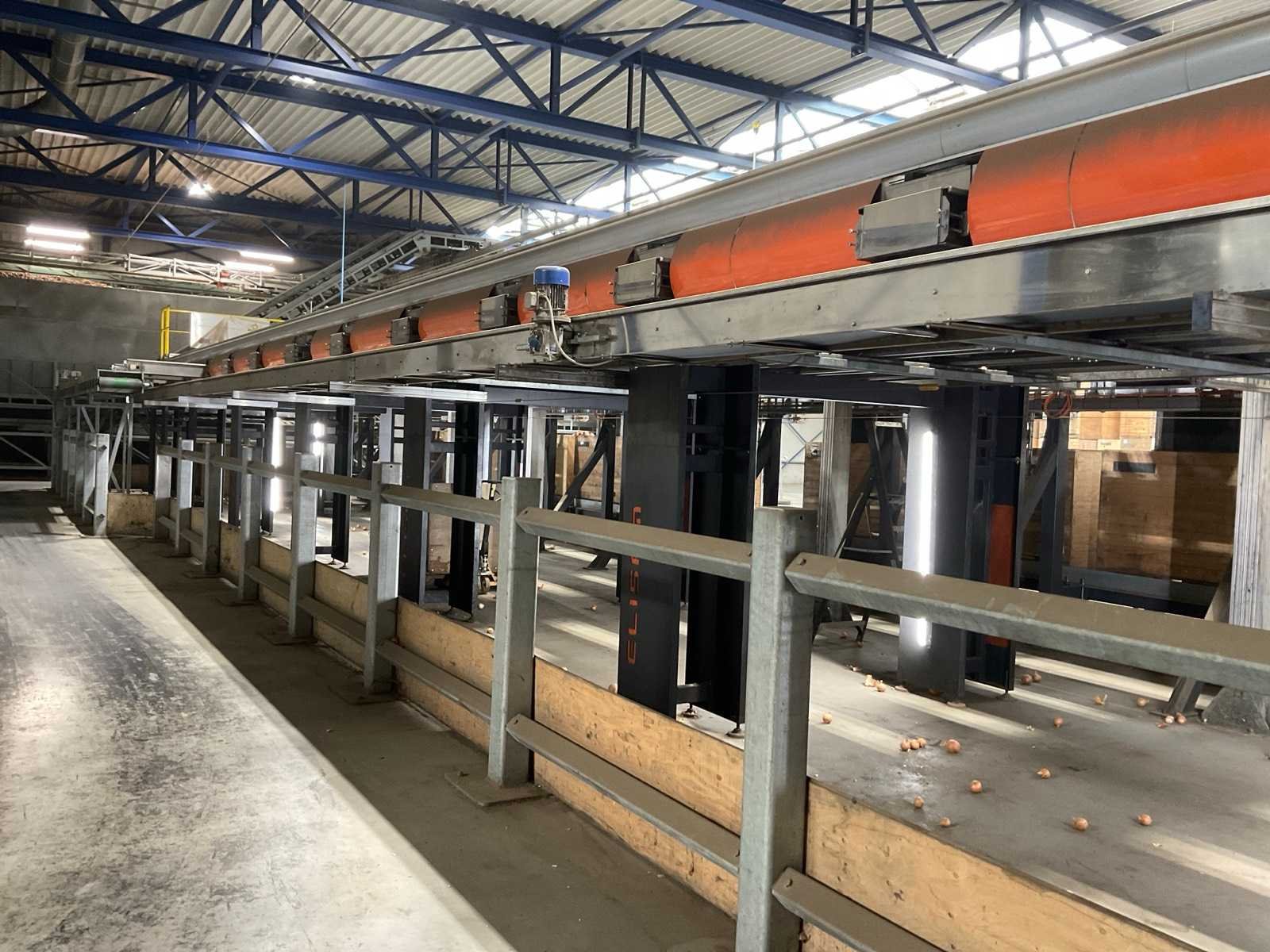8-lijner optische uien sorteerlijn; cap. ca. 22.000 - 24.000 uien per uur; bij gemiddeld uien gewicht van 120 gram; cup snelheid 10 cups per seconde; TrueSort Ellips systeem voor gewicht; diameter; vorm; kleur en externe kwaliteit; NIR; met aanvoer rollenbaan en breedband; werkbreedte ca. 2600 mm; rollenbaan afm. ca. 2000x2250 mm; v.v. 8-lijner elektronische sorteerder met V-banden; type Gran Torino GTW; met 11 uitgangen; incl. vernenkelaar; min. Ø 75 mm; max. Ø 150 mm; (12x) kistenvuller met kistdetectie; uitvoerbreedte ca. 860 mm; (1x) uitvoer transportband voor monsters; band afm. ca. 4200x400 mm; (1x) transportband voor monsters; band afm. ca. 3500x500 mm; (10x) terugvoer transportbanden; band afm. ca. 4800x400 mm; (10x) uitvoer transportbanden; band afm. ca. 8500x400 mm; incl. kistenkantelaar; kisten maat 1700x1200x1250 mm; invoerbunker; bunker afm. ca. 2000x2300x3300 mm; met dwarsgelegen uitvoer transportband; bandbreedte ca. 600 mm; aluminium bordes; lengte ca. 60 meter; besturing; schakelkasten etc. LET OP! Kavel dient uiterlijk op 31 mei te zijn gedemonteerd en opgehaald. De koper dient dit zelf te organiseren. No Merk: Elisam Type: Ellips Bouwjaar: 2017 Aansluiting: 400V