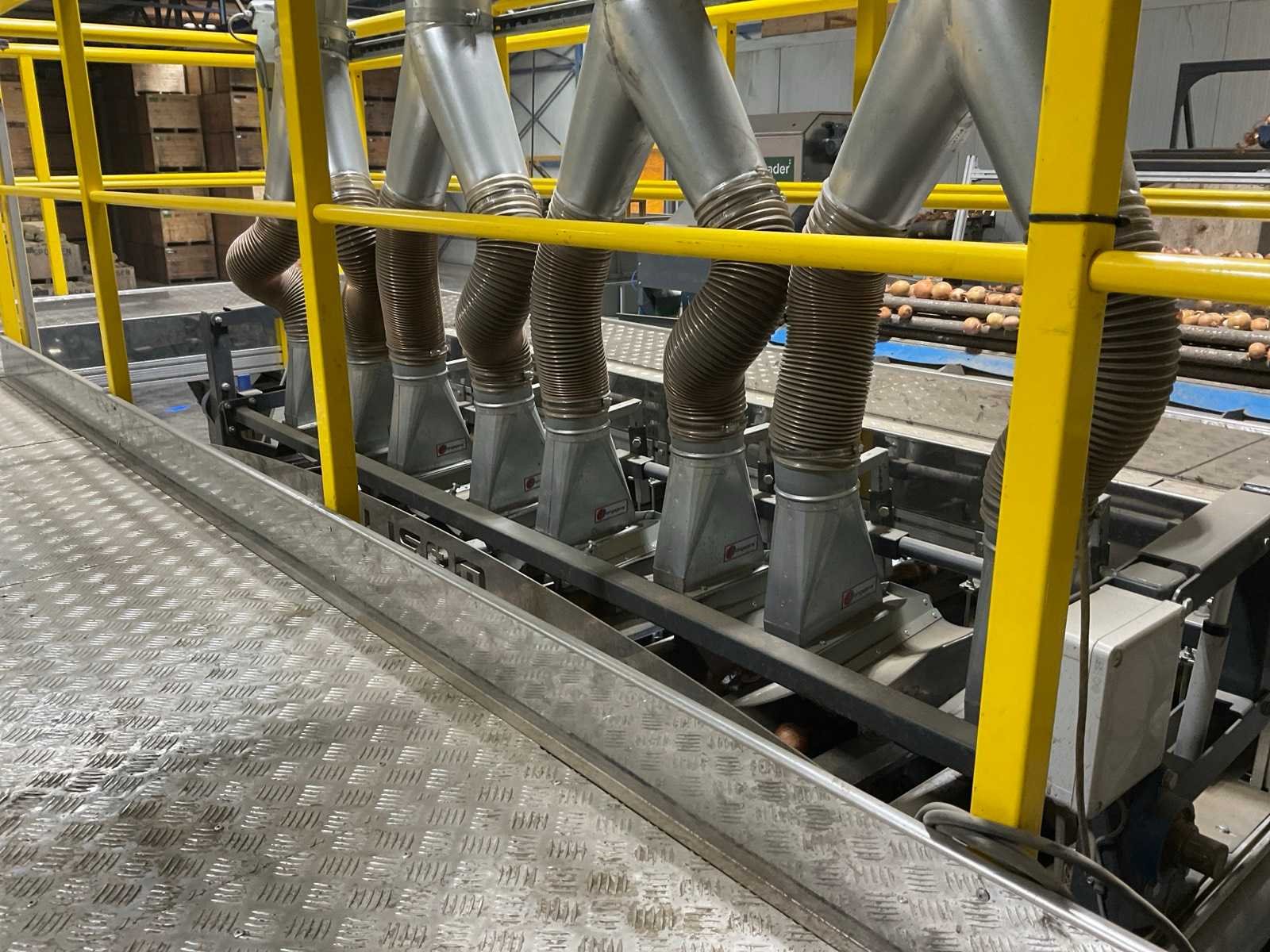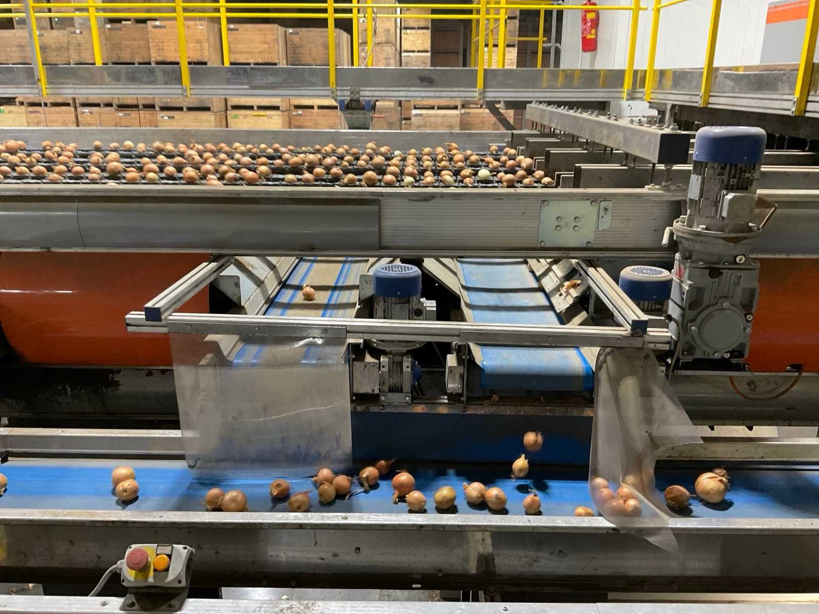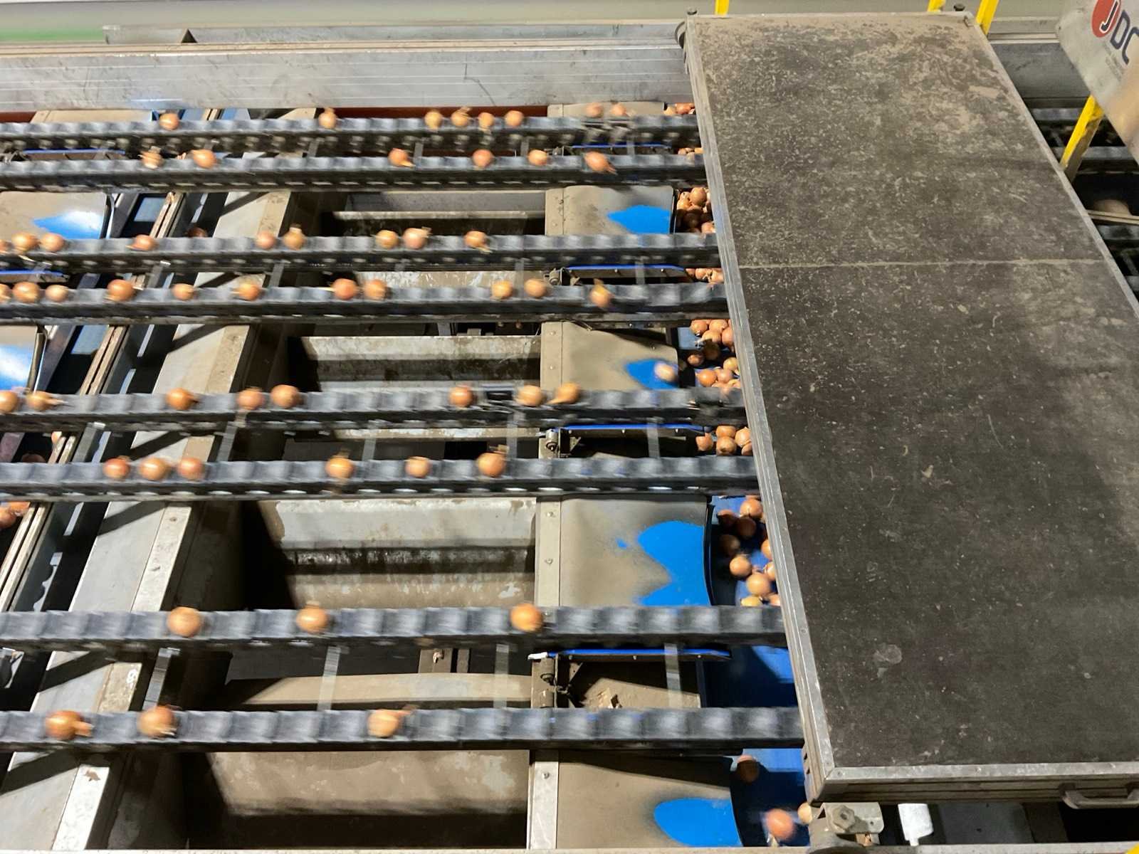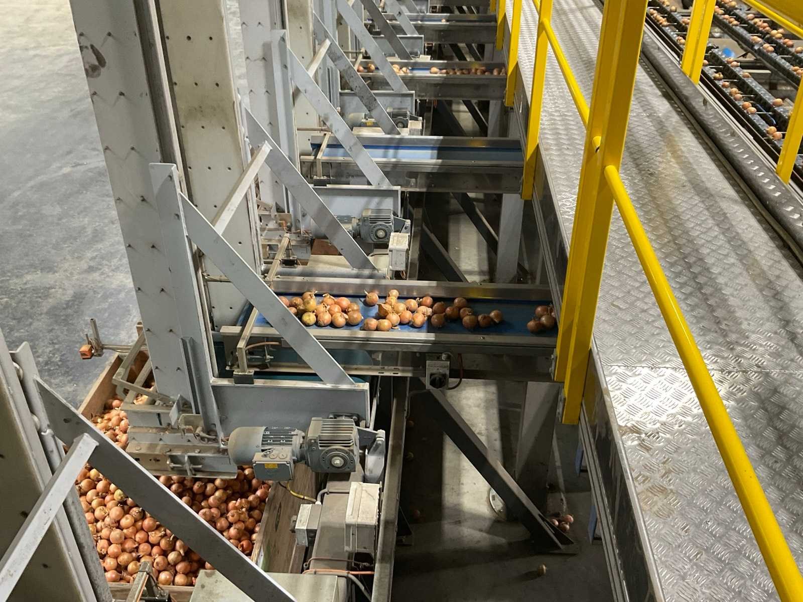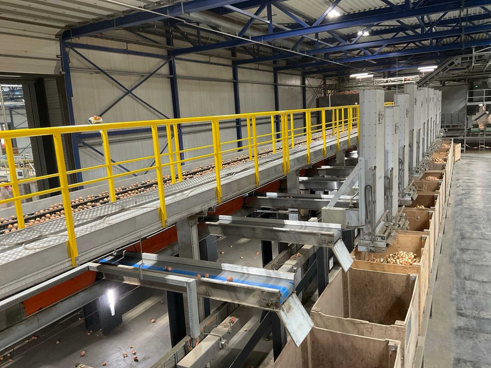8-lijner optische uien sorteerlijn; cap. ca. 22.000 - 24.000 uien per uur; bij gemiddeld uien gewicht van 120 gram; cup snelheid 10 cups per seconde; TrueSort Ellips systeem voor gewicht; diameter; vorm; kleur en externe kwaliteit; NIR; met aanvoer rollenbaan en breedband; werkbreedte ca. 2600 mm; rollenbaan afm. ca. 2000x2250 mm; v.v. 8-lijner elektronische sorteerder met V-banden; type Gran Torino GTW; met 11 uitgangen; incl. vernenkelaar; min. Ø 75 mm; max. Ø 150 mm; (12x) kistenvuller met kistdetectie; uitvoerbreedte ca. 860 mm; (1x) uitvoer transportband voor monsters; band afm. ca. 4200x400 mm; (1x) transportband voor monsters; band afm. ca. 3500x500 mm; (10x) terugvoer transportbanden; band afm. ca. 4800x400 mm; (10x) uitvoer transportbanden; band afm. ca. 8500x400 mm; incl. kistenkantelaar; kisten maat 1700x1200x1250 mm; invoerbunker; bunker afm. ca. 2000x2300x3300 mm; met dwarsgelegen uitvoer transportband; bandbreedte ca. 600 mm; aluminium bordes; lengte ca. 60 meter; besturing; schakelkasten etc. LET OP! Kavel dient uiterlijk op 31 mei te zijn gedemonteerd en opgehaald. De koper dient dit zelf te organiseren. No Merk: Elisam Type: Ellips Bouwjaar: 2017 Aansluiting: 400V