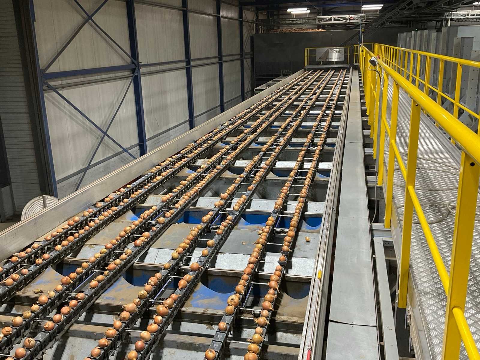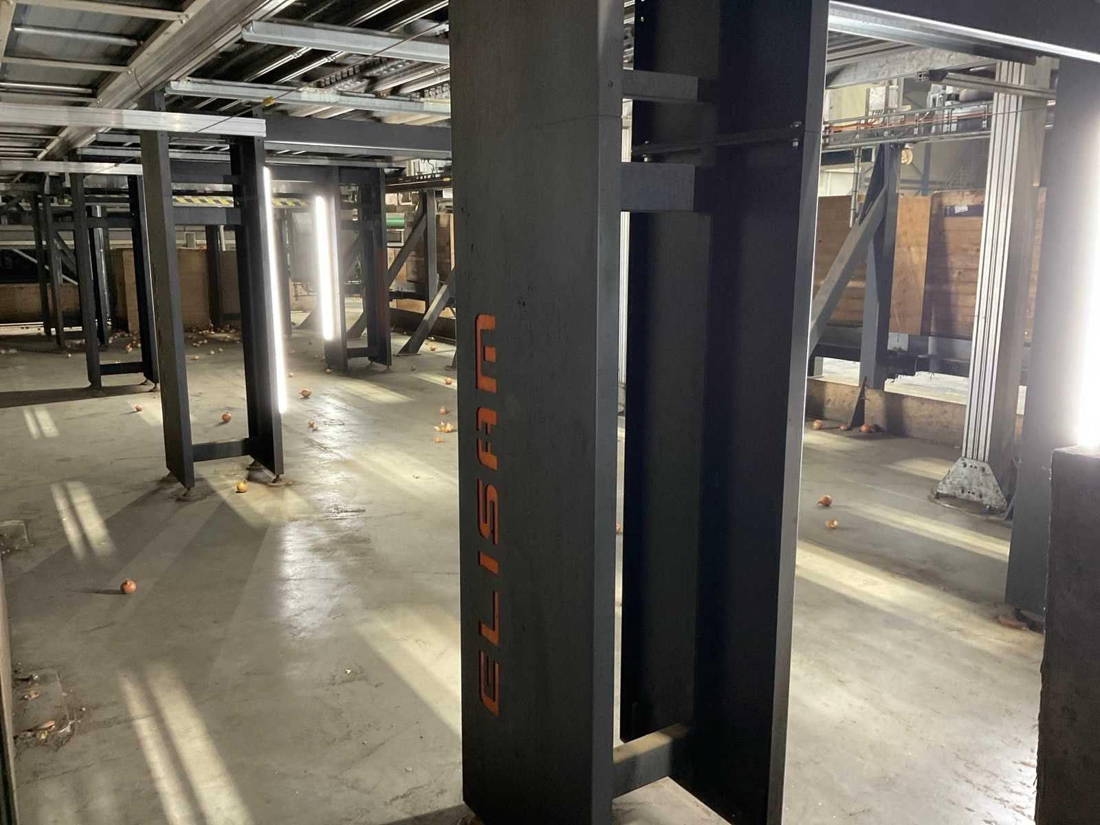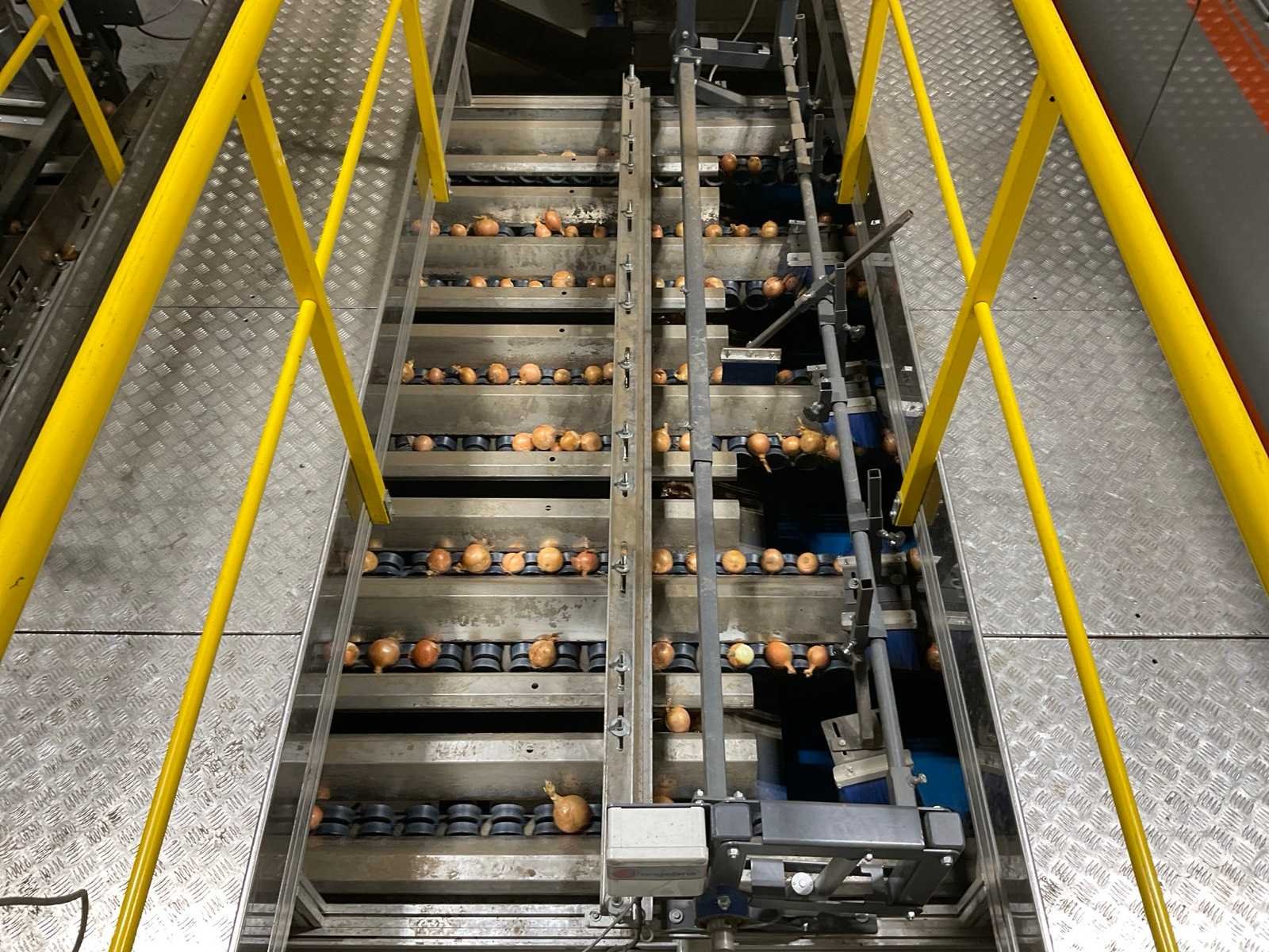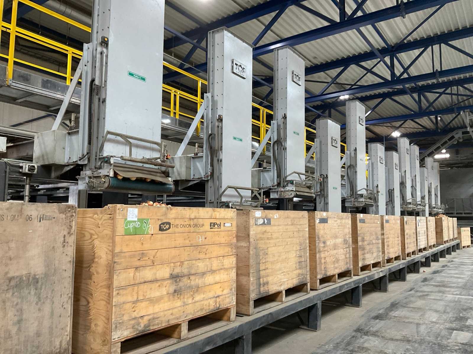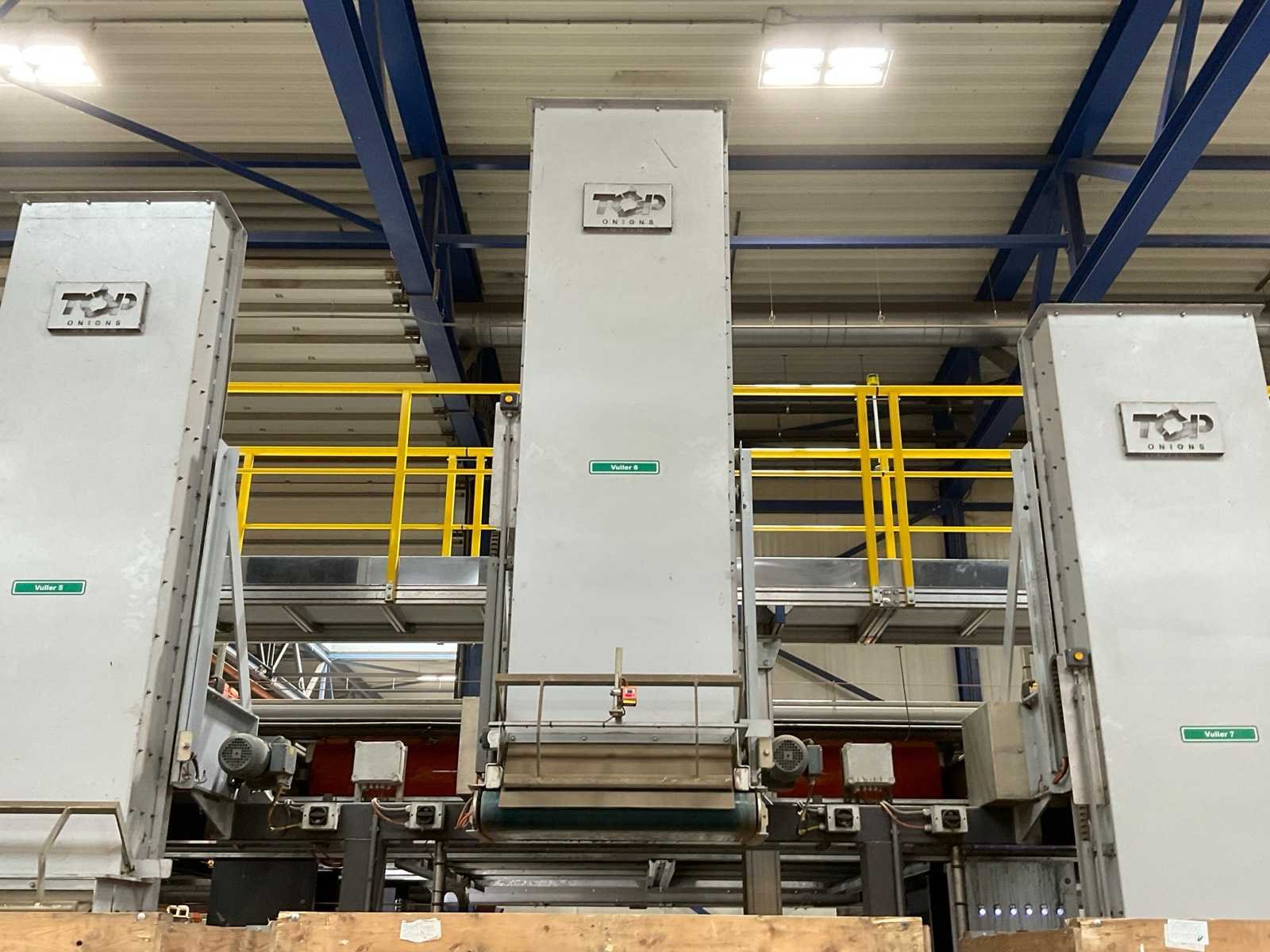8-lijner optische uien sorteerlijn; cap. ca. 22.000 - 24.000 uien per uur; bij gemiddeld uien gewicht van 120 gram; cup snelheid 10 cups per seconde; TrueSort Ellips systeem voor gewicht; diameter; vorm; kleur en externe kwaliteit; NIR; met aanvoer rollenbaan en breedband; werkbreedte ca. 2600 mm; rollenbaan afm. ca. 2000x2250 mm; v.v. 8-lijner elektronische sorteerder met V-banden; type Gran Torino GTW; met 11 uitgangen; incl. vernenkelaar; min. Ø 75 mm; max. Ø 150 mm; (12x) kistenvuller met kistdetectie; uitvoerbreedte ca. 860 mm; (1x) uitvoer transportband voor monsters; band afm. ca. 4200x400 mm; (1x) transportband voor monsters; band afm. ca. 3500x500 mm; (10x) terugvoer transportbanden; band afm. ca. 4800x400 mm; (10x) uitvoer transportbanden; band afm. ca. 8500x400 mm; incl. kistenkantelaar; kisten maat 1700x1200x1250 mm; invoerbunker; bunker afm. ca. 2000x2300x3300 mm; met dwarsgelegen uitvoer transportband; bandbreedte ca. 600 mm; aluminium bordes; lengte ca. 60 meter; besturing; schakelkasten etc. LET OP! Kavel dient uiterlijk op 31 mei te zijn gedemonteerd en opgehaald. De koper dient dit zelf te organiseren. No Merk: Elisam Type: Ellips Bouwjaar: 2017 Aansluiting: 400V