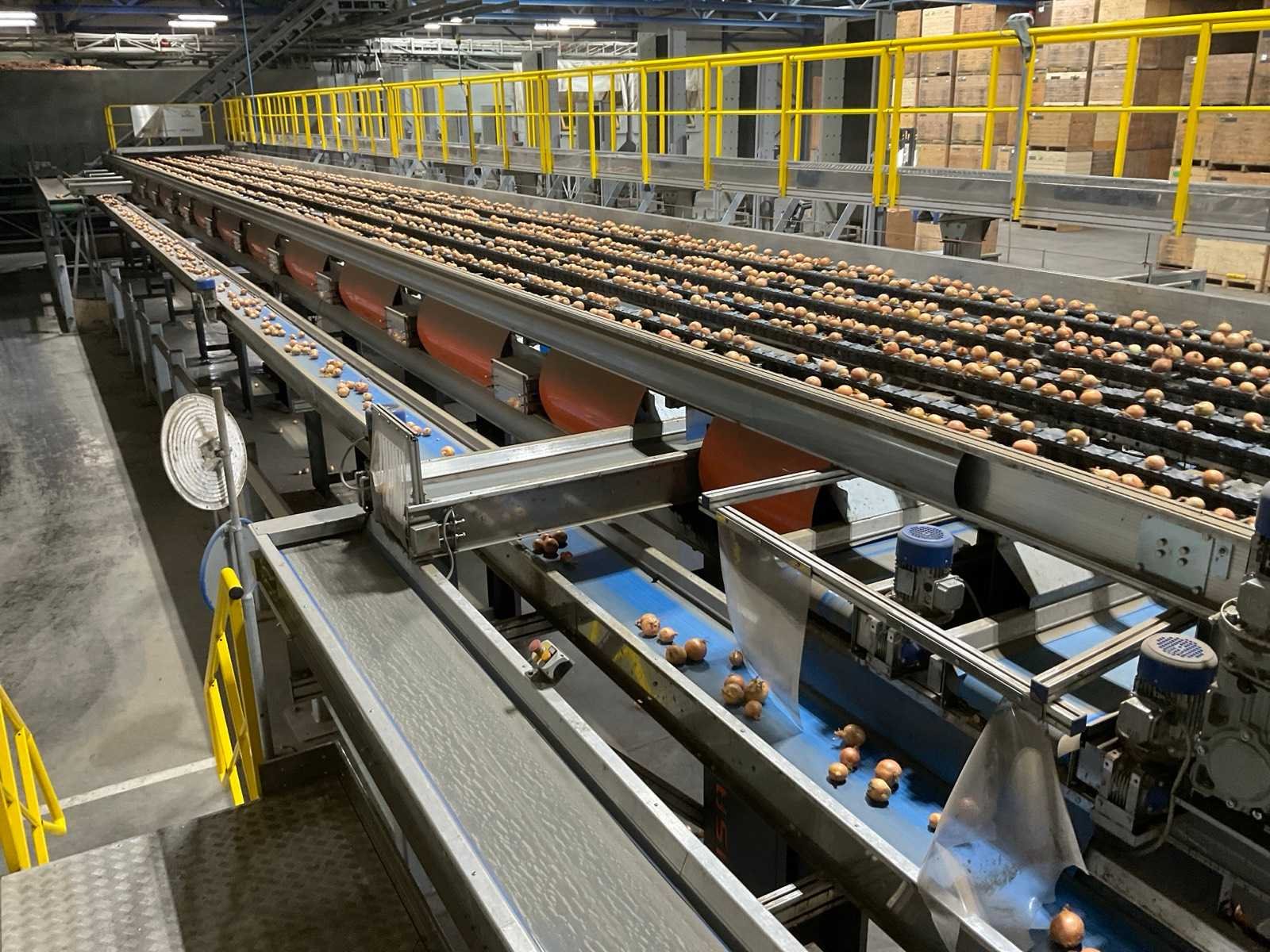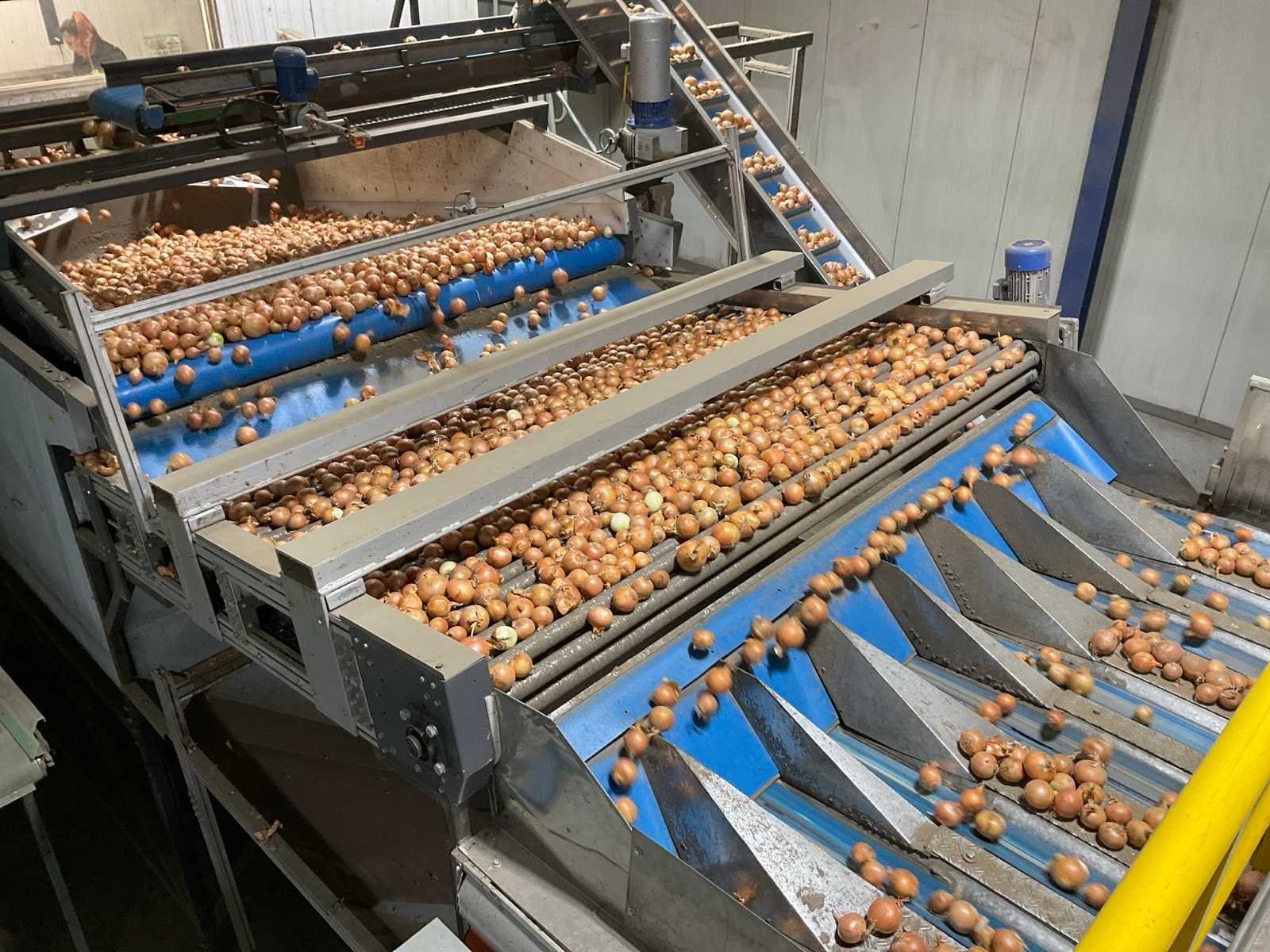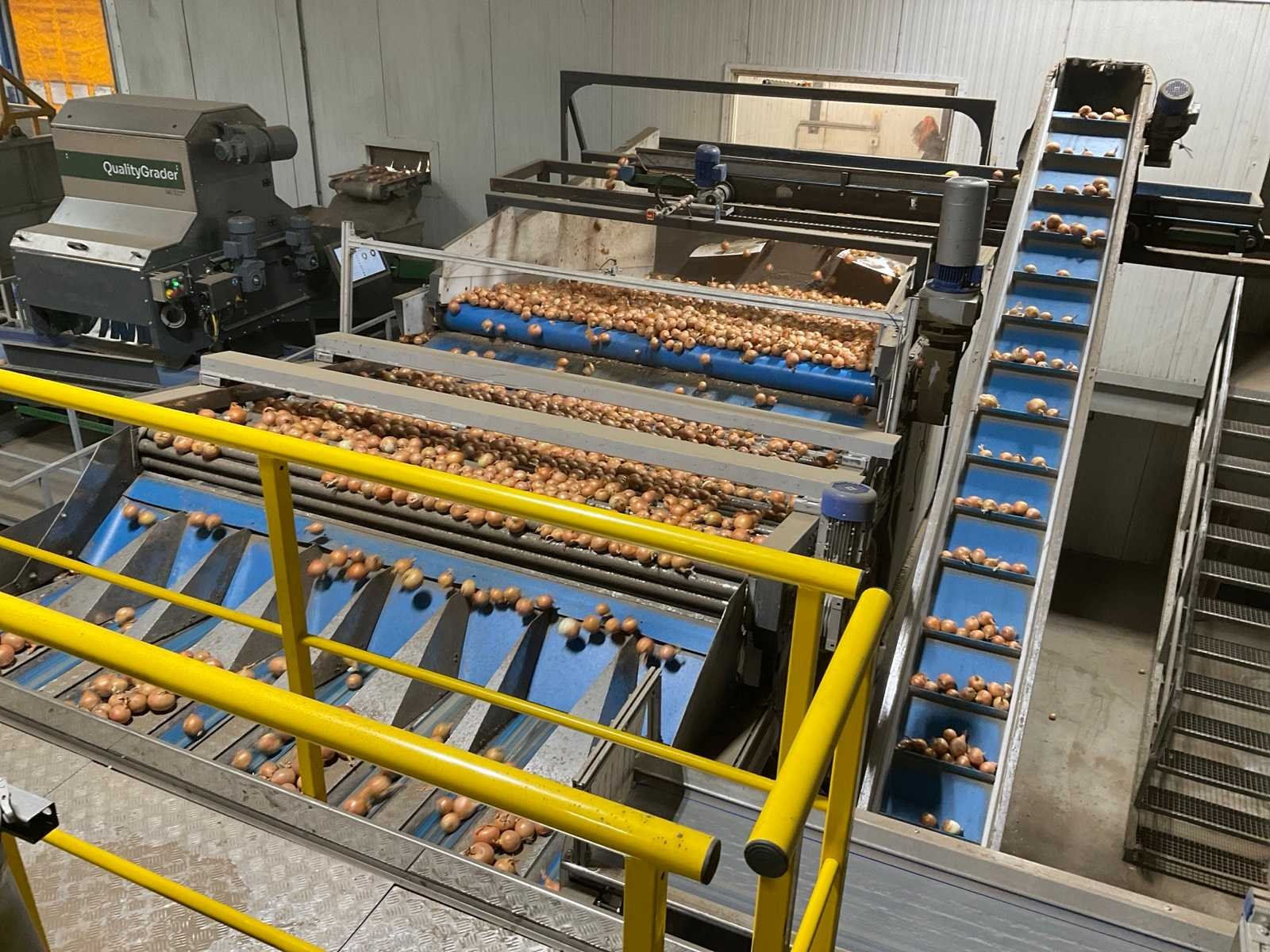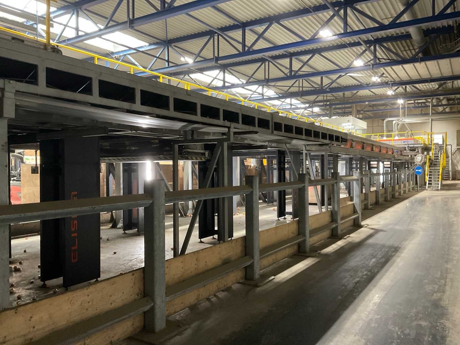 8-lijner optische uien sorteerlijn; cap. ca. 22.000 - 24.000 uien per uur; bij gemiddeld uien gewicht van 120 gram; cup snelheid 10 cups per seconde; TrueSort Ellips systeem voor gewicht; diameter; vorm; kleur en externe kwaliteit; NIR; met aanvoer rollenbaan en breedband; werkbreedte ca. 2600 mm; rollenbaan afm. ca. 2000x2250 mm; v.v. 8-lijner elektronische sorteerder met V-banden; type Gran Torino GTW; met 11 uitgangen; incl. vernenkelaar; min. Ø 75 mm; max. Ø 150 mm; (12x) kistenvuller met kistdetectie; uitvoerbreedte ca. 860 mm; (1x) uitvoer transportband voor monsters; band afm. ca. 4200x400 mm; (1x) transportband voor monsters; band afm. ca. 3500x500 mm; (10x) terugvoer transportbanden; band afm. ca. 4800x400 mm; (10x) uitvoer transportbanden; band afm. ca. 8500x400 mm; incl. kistenkantelaar; kisten maat 1700x1200x1250 mm; invoerbunker; bunker afm. ca. 2000x2300x3300 mm; met dwarsgelegen uitvoer transportband; bandbreedte ca. 600 mm; aluminium bordes; lengte ca. 60 meter; besturing; schakelkasten etc. LET OP! Kavel dient uiterlijk op 31 mei te zijn gedemonteerd en opgehaald. De koper dient dit zelf te organiseren. No Merk: Elisam Type: Ellips Bouwjaar: 2017 Aansluiting: 400V