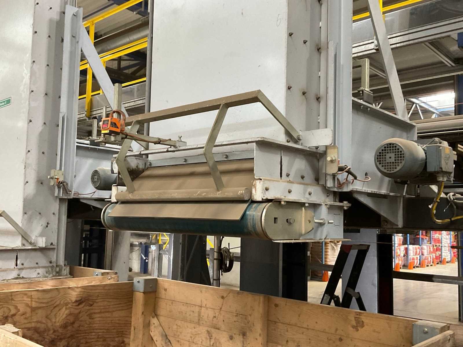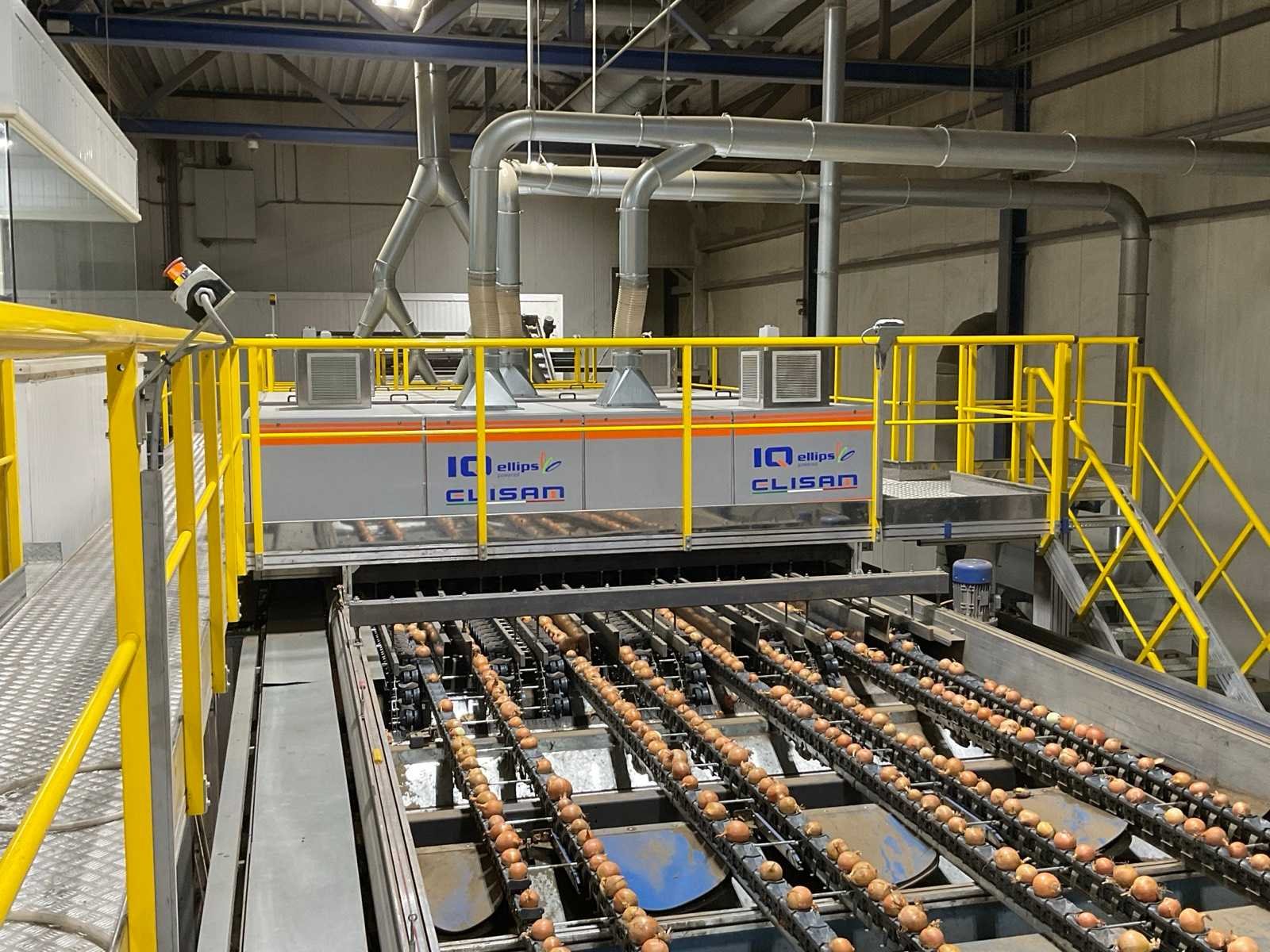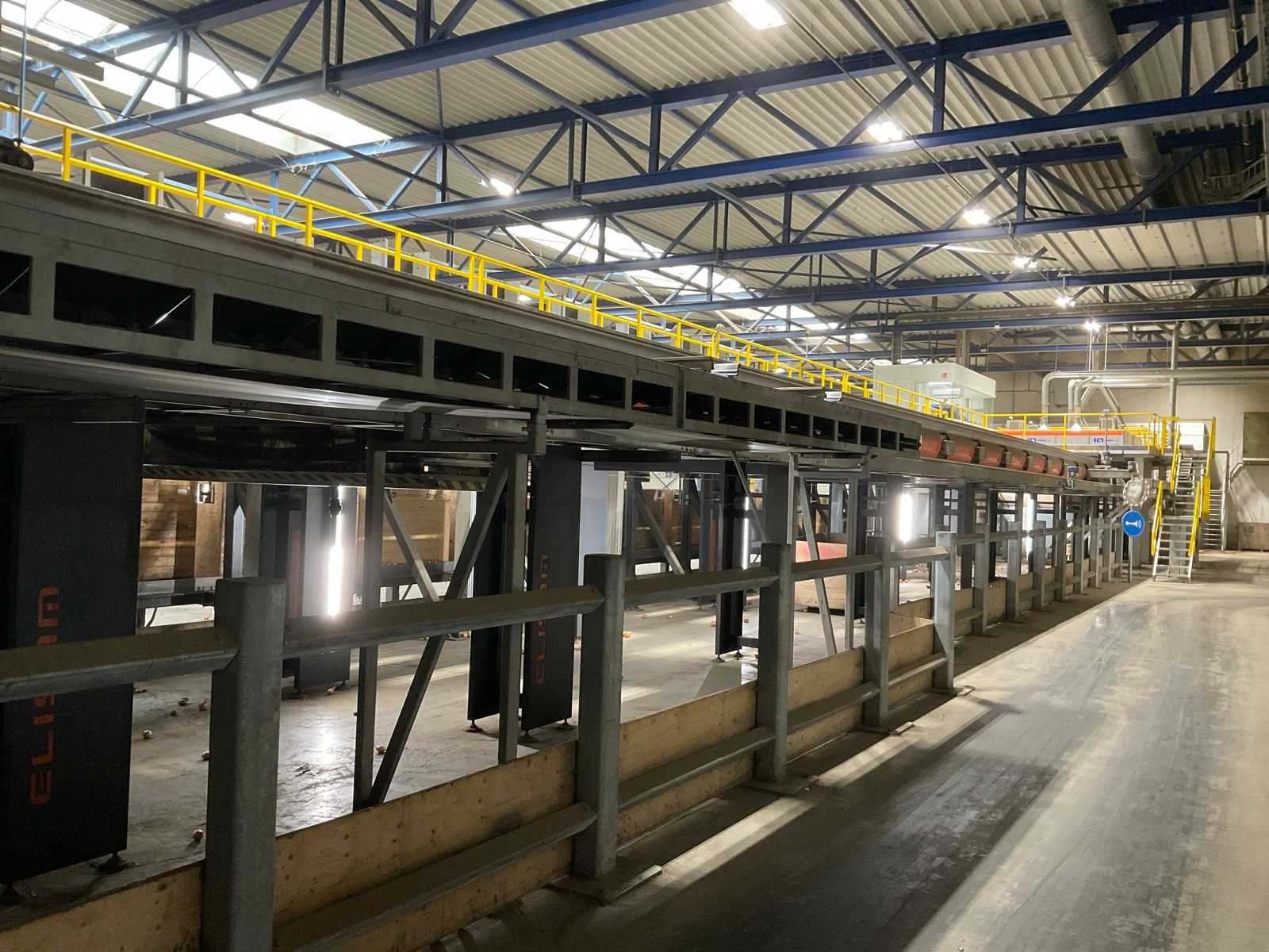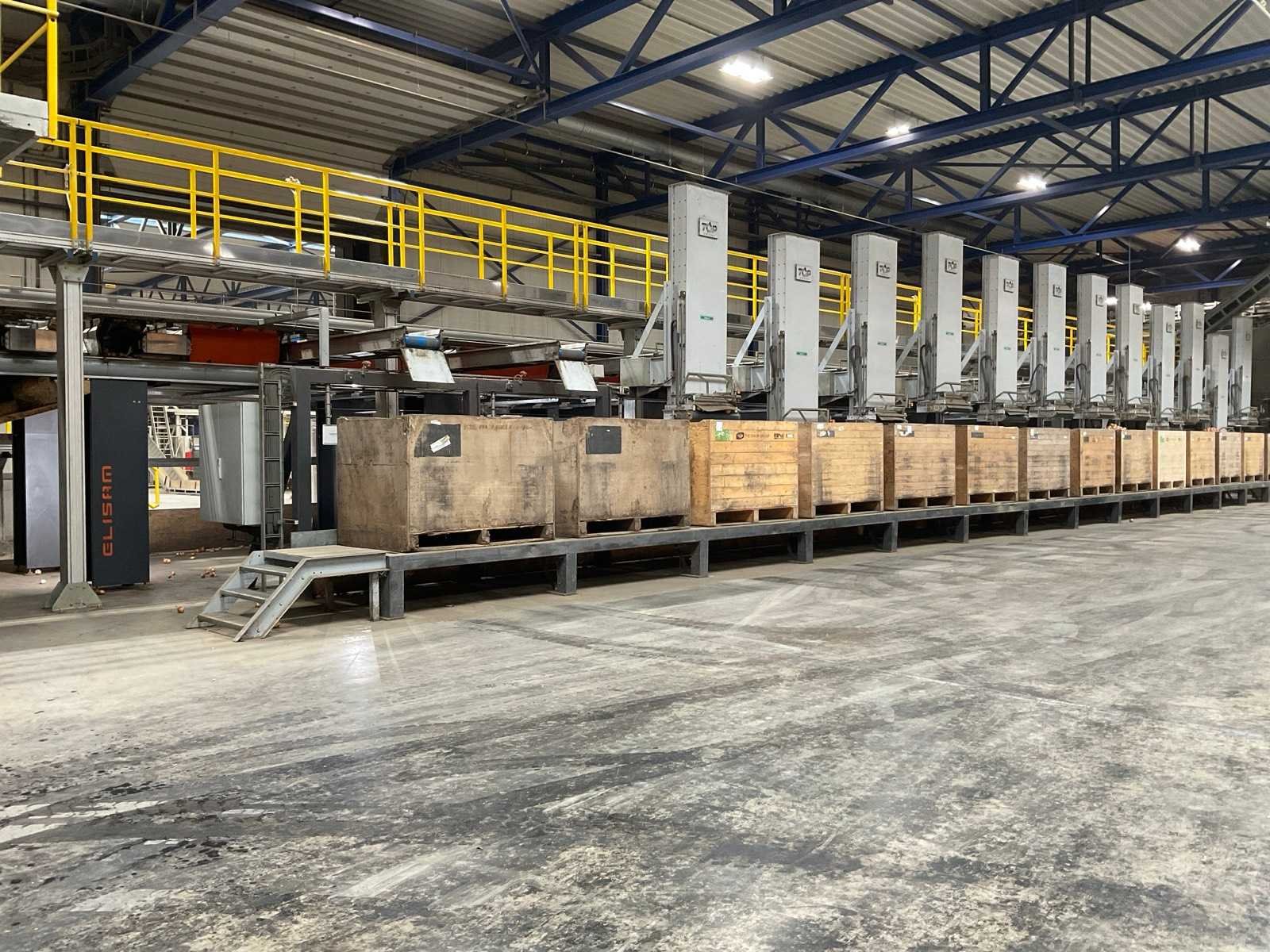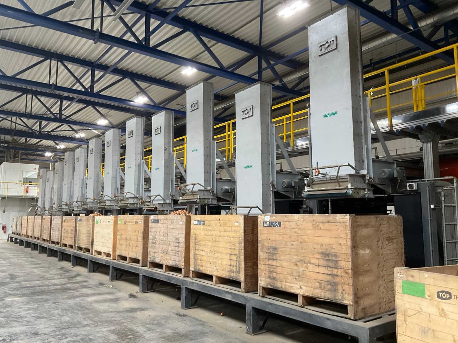 8-lijner optische uien sorteerlijn; cap. ca. 22.000 - 24.000 uien per uur; bij gemiddeld uien gewicht van 120 gram; cup snelheid 10 cups per seconde; TrueSort Ellips systeem voor gewicht; diameter; vorm; kleur en externe kwaliteit; NIR; met aanvoer rollenbaan en breedband; werkbreedte ca. 2600 mm; rollenbaan afm. ca. 2000x2250 mm; v.v. 8-lijner elektronische sorteerder met V-banden; type Gran Torino GTW; met 11 uitgangen; incl. vernenkelaar; min. Ø 75 mm; max. Ø 150 mm; (12x) kistenvuller met kistdetectie; uitvoerbreedte ca. 860 mm; (1x) uitvoer transportband voor monsters; band afm. ca. 4200x400 mm; (1x) transportband voor monsters; band afm. ca. 3500x500 mm; (10x) terugvoer transportbanden; band afm. ca. 4800x400 mm; (10x) uitvoer transportbanden; band afm. ca. 8500x400 mm; incl. kistenkantelaar; kisten maat 1700x1200x1250 mm; invoerbunker; bunker afm. ca. 2000x2300x3300 mm; met dwarsgelegen uitvoer transportband; bandbreedte ca. 600 mm; aluminium bordes; lengte ca. 60 meter; besturing; schakelkasten etc. LET OP! Kavel dient uiterlijk op 31 mei te zijn gedemonteerd en opgehaald. De koper dient dit zelf te organiseren. No Merk: Elisam Type: Ellips Bouwjaar: 2017 Aansluiting: 400V