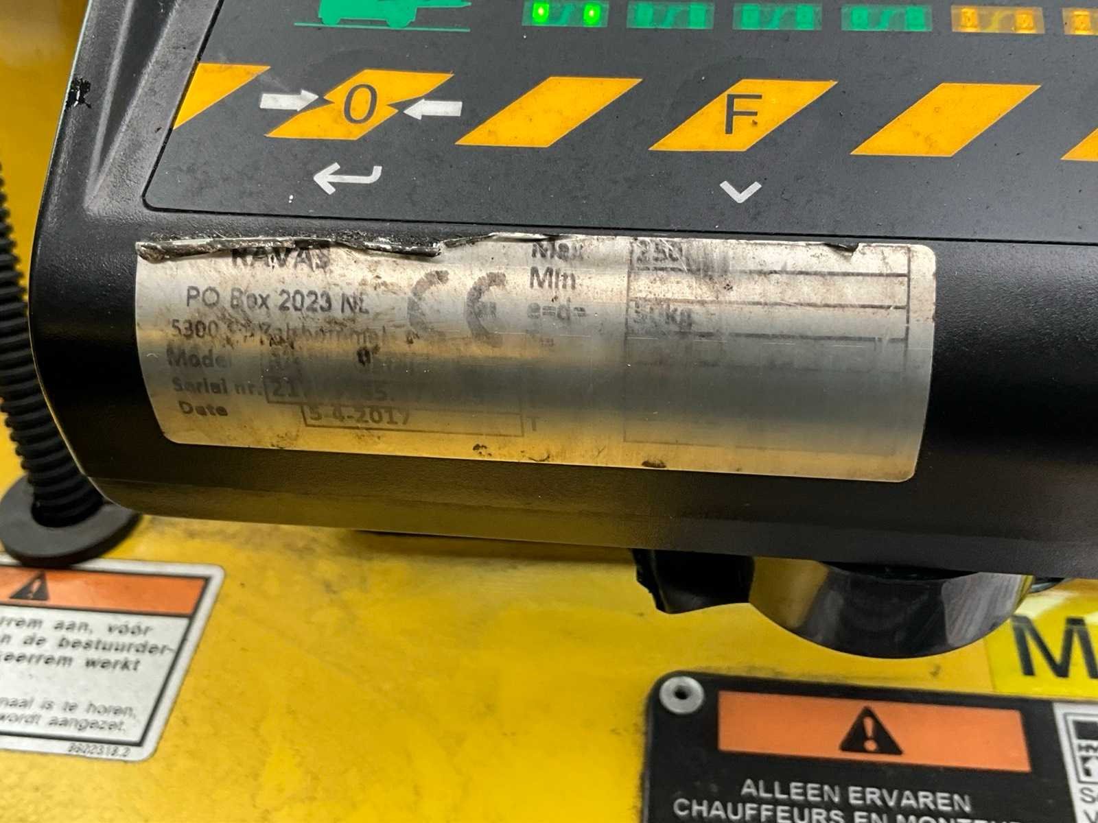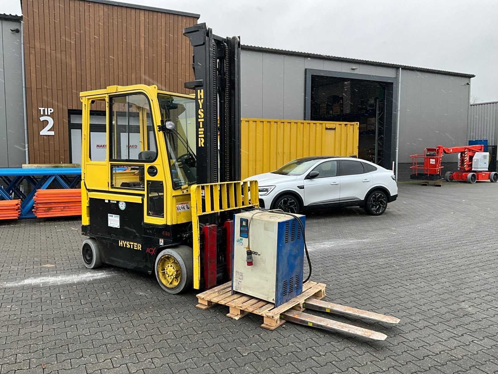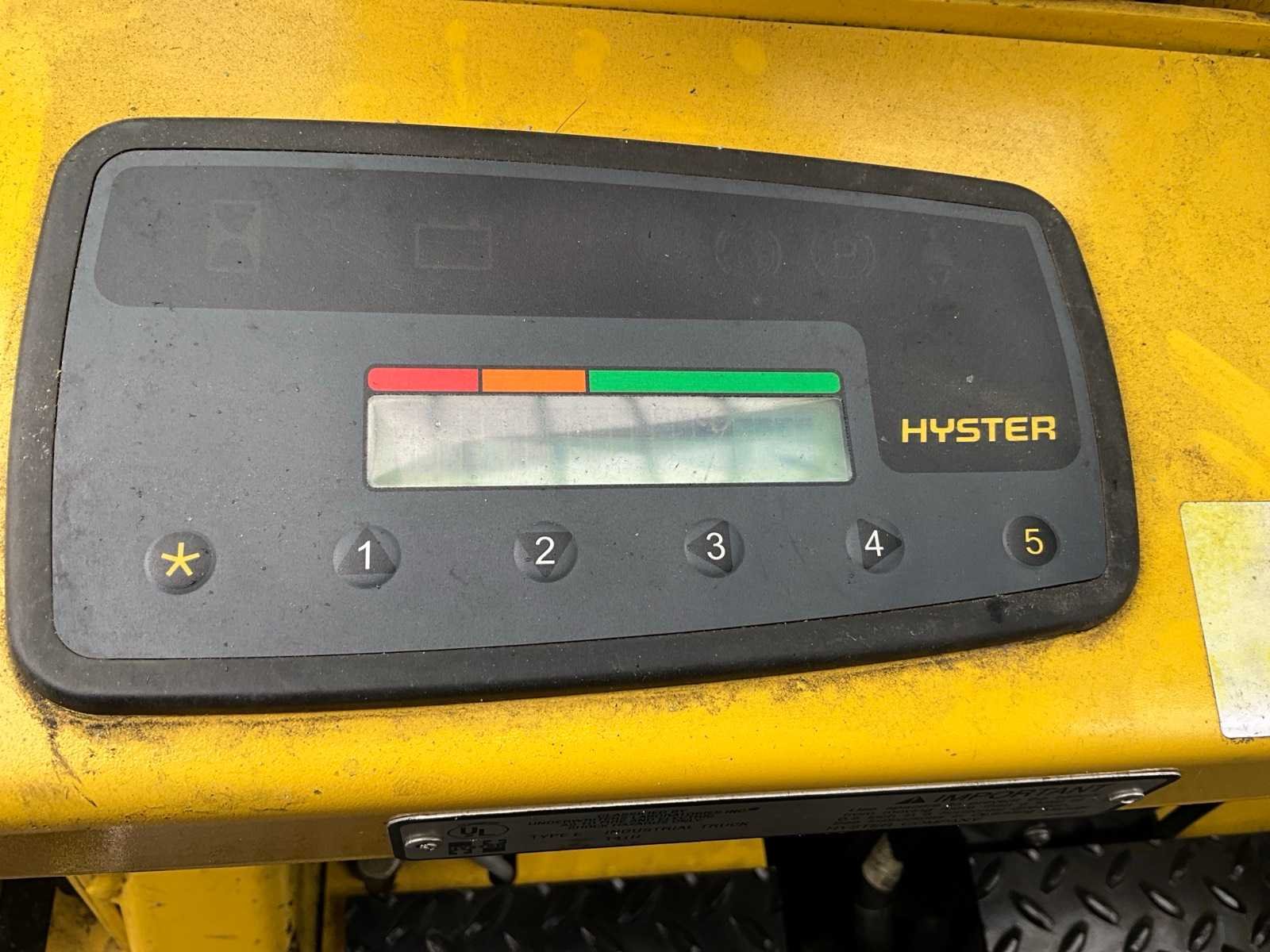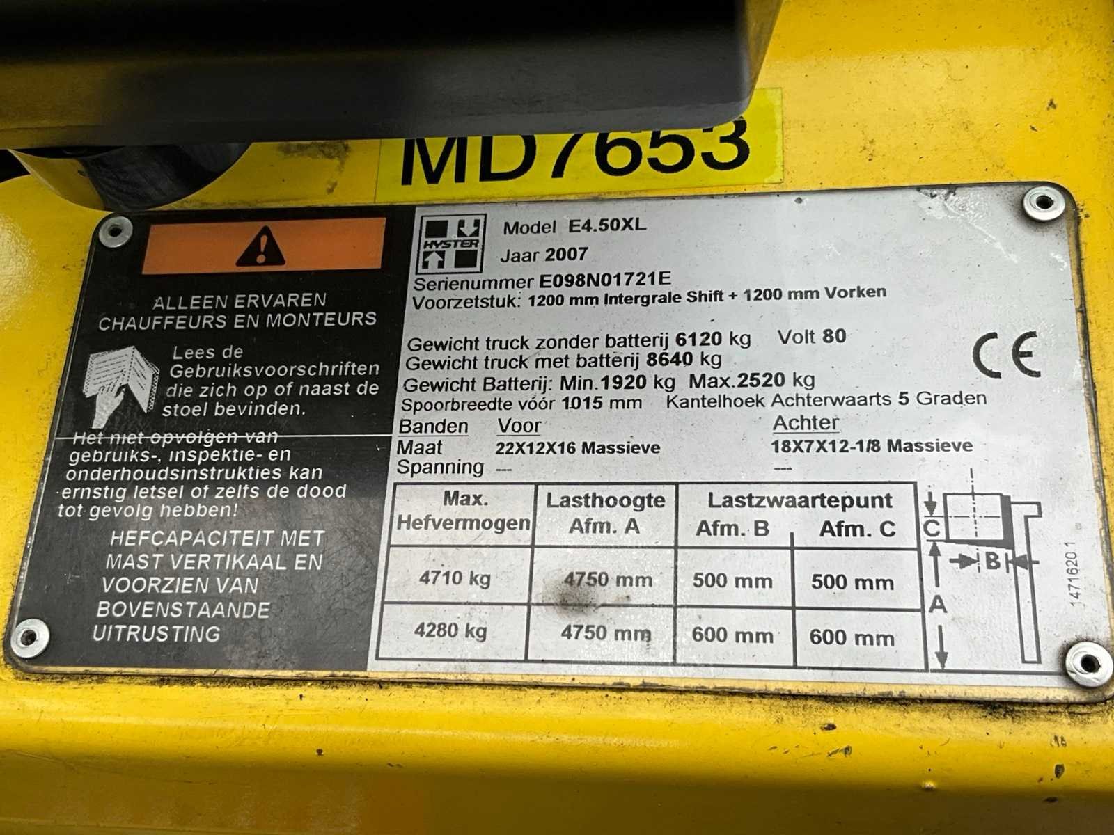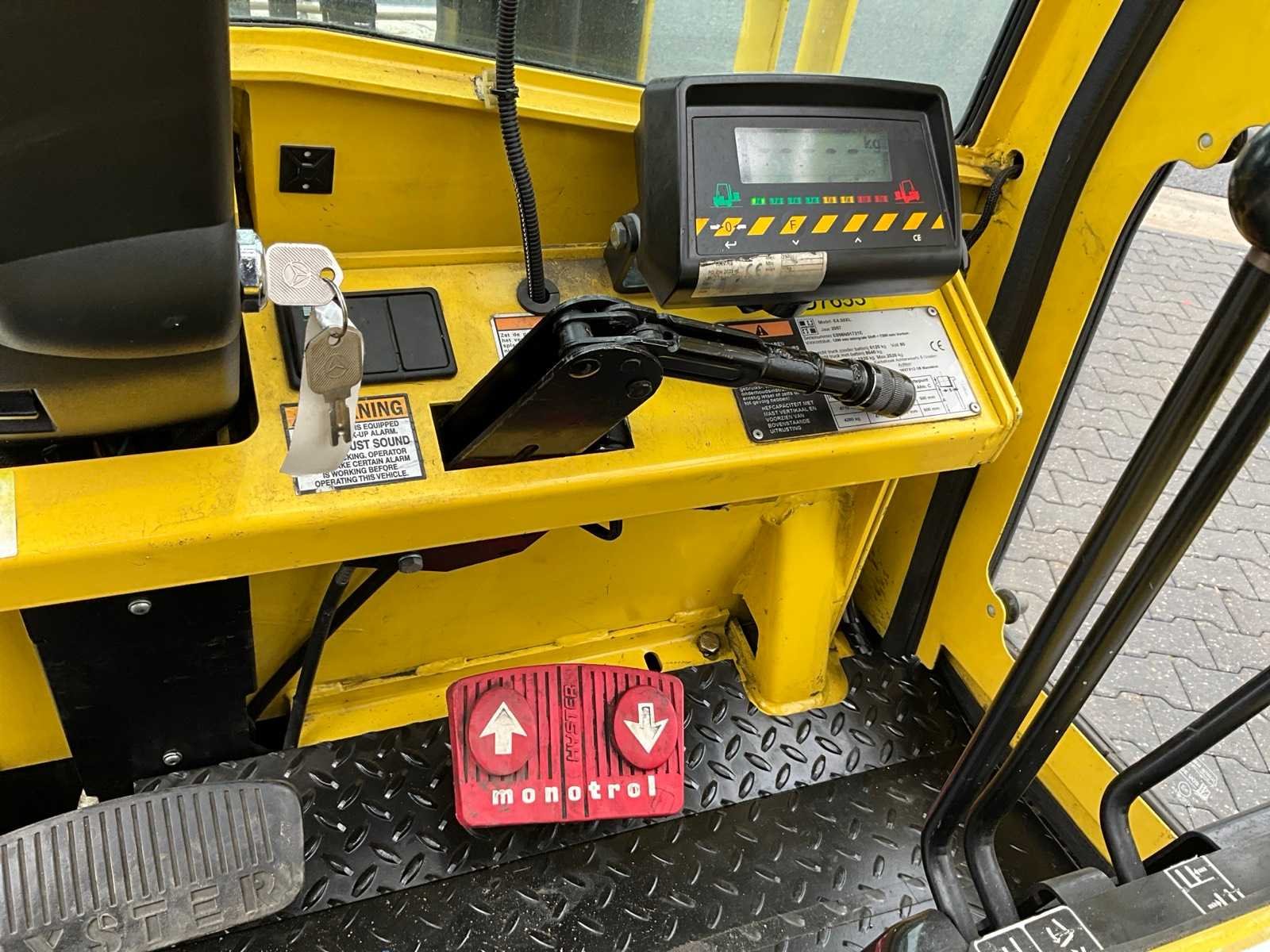 Voorzien van weegsysteem, verwarming. Nee Merk: Hyster Type: E4.50XL Bouwjaar: 2007 Serienummer: E098N01721E Aantal wielen: 4 Accu lader: true Duplex mast: true Eigen gewicht: 8640kg Hefvermogen: 4710kg Lepellengte: 2000mm Hefhoogte: 4750mm Vol rubber banden: true Minimale doorrijhoogte: 3160mm Totale afmeting L: 4700mm Totale afmeting Breedte: 1250mm Totale afmeting Hoogte: 3160mm