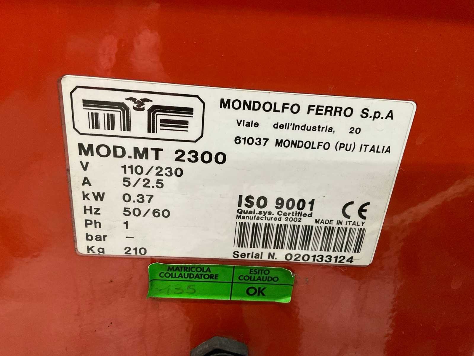 Nee Merk: Mondolfo Type: MT2300 Bouwjaar: 2002 Serienummer: 020133124 Aansluiting: 230V Eigen gewicht: 210kg Totale afmeting L: 1700mm Totale afmeting Breedte: 1200mm
