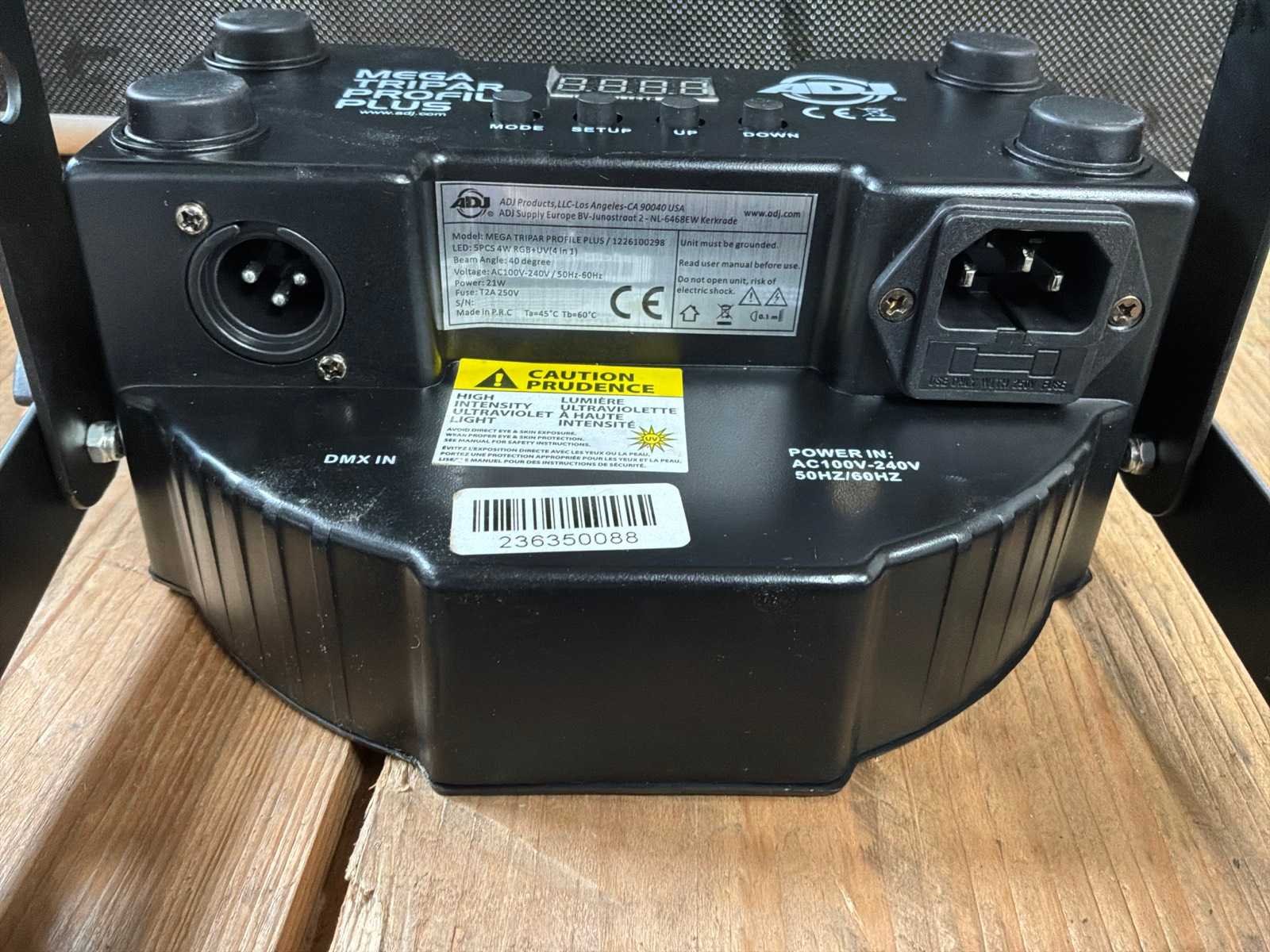 RGB+UV (4 in 1) Flightcase inbegrepen. Nee Merk: ADJ Type: Tripar profile plus DMX: true Vermogen: 21W Aansluiting: 230V Totale afmeting L: 75mm Totale afmeting Breedte: 240mm Totale afmeting Hoogte: 230mm