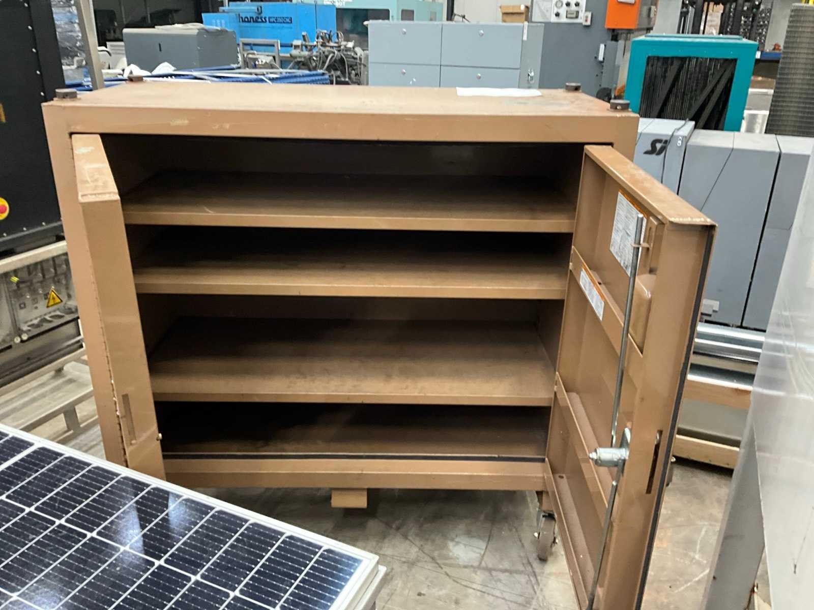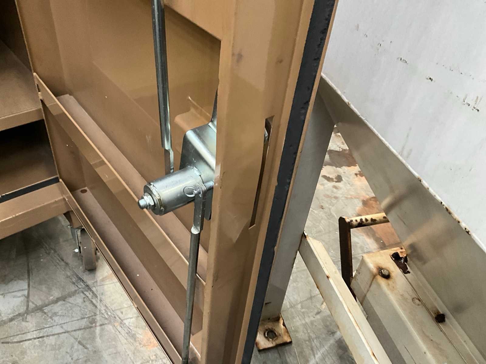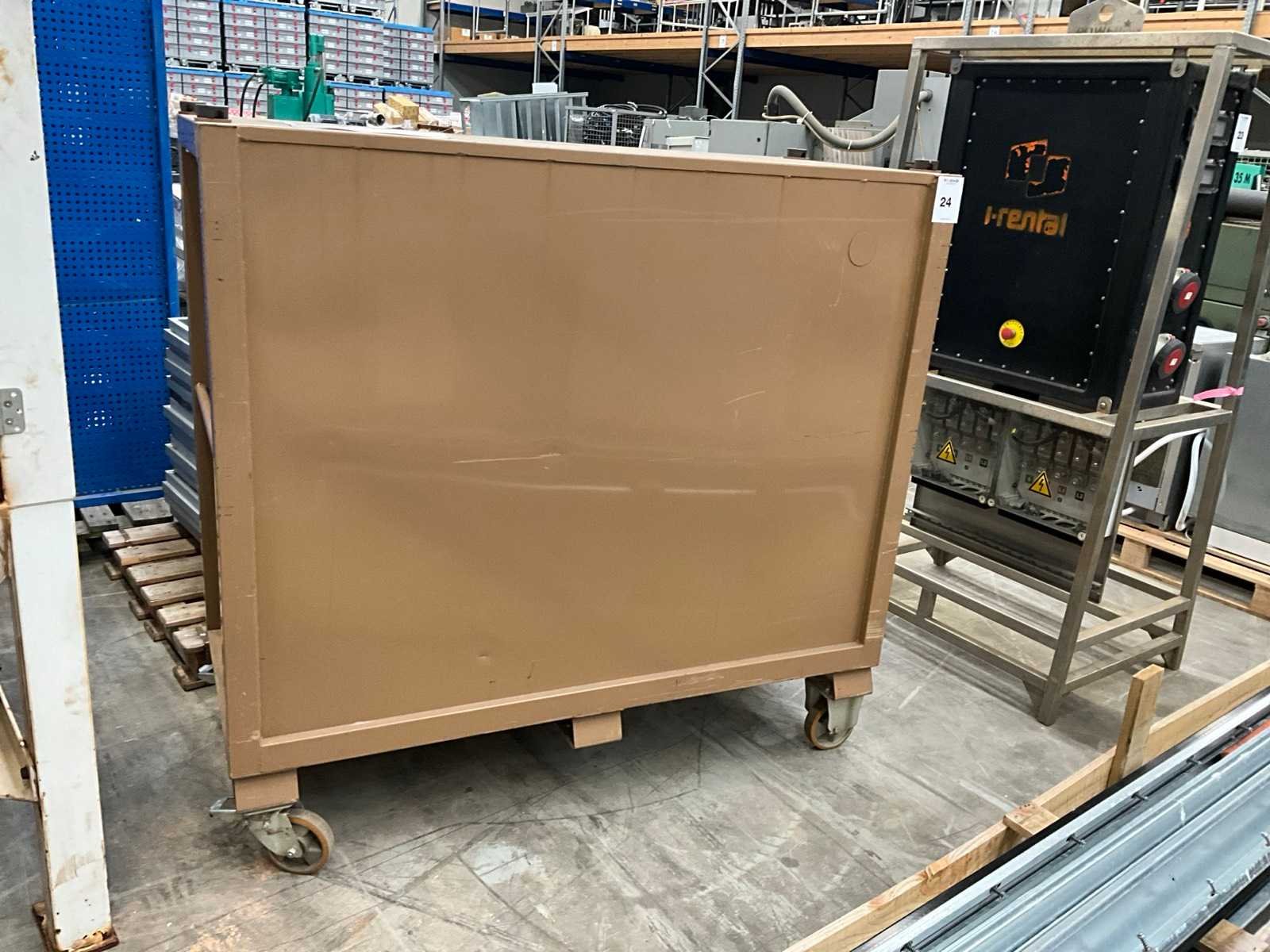 Voorzien van 4 wielen, 4 hijsaansluitingen Nee Merk: Ridgid Type: Monster Box model 1020R Serienummer: 2030213884 Totale afmeting L: 1680mm Totale afmeting Breedte: 760mm Totale afmeting Hoogte: 1630mm