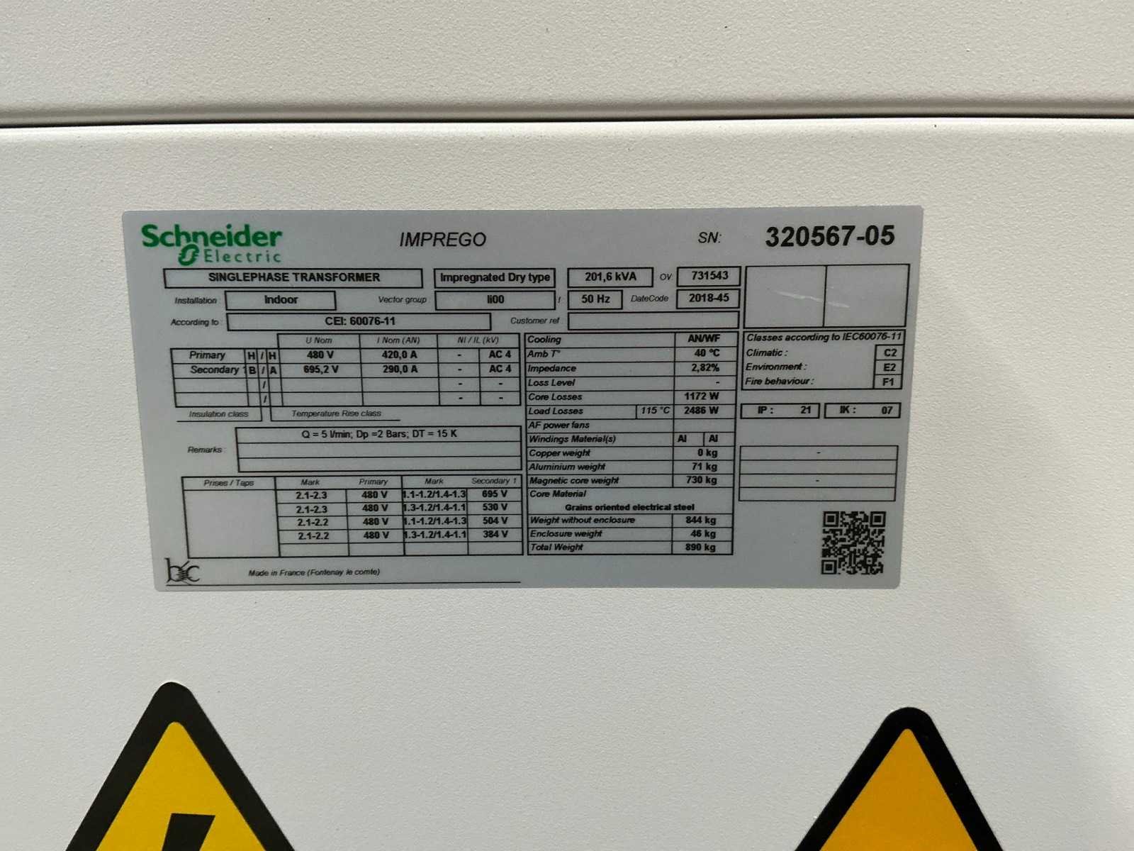 Afmeting transformator circa 950x1000x1100mm, ongebruikt, op en inclusief houte transportframe Nee Merk: Schneider Electric Type: Imprego Serienummer: 320567-05 Bouwjaar: 2018 Vermogen: 201.6kVA