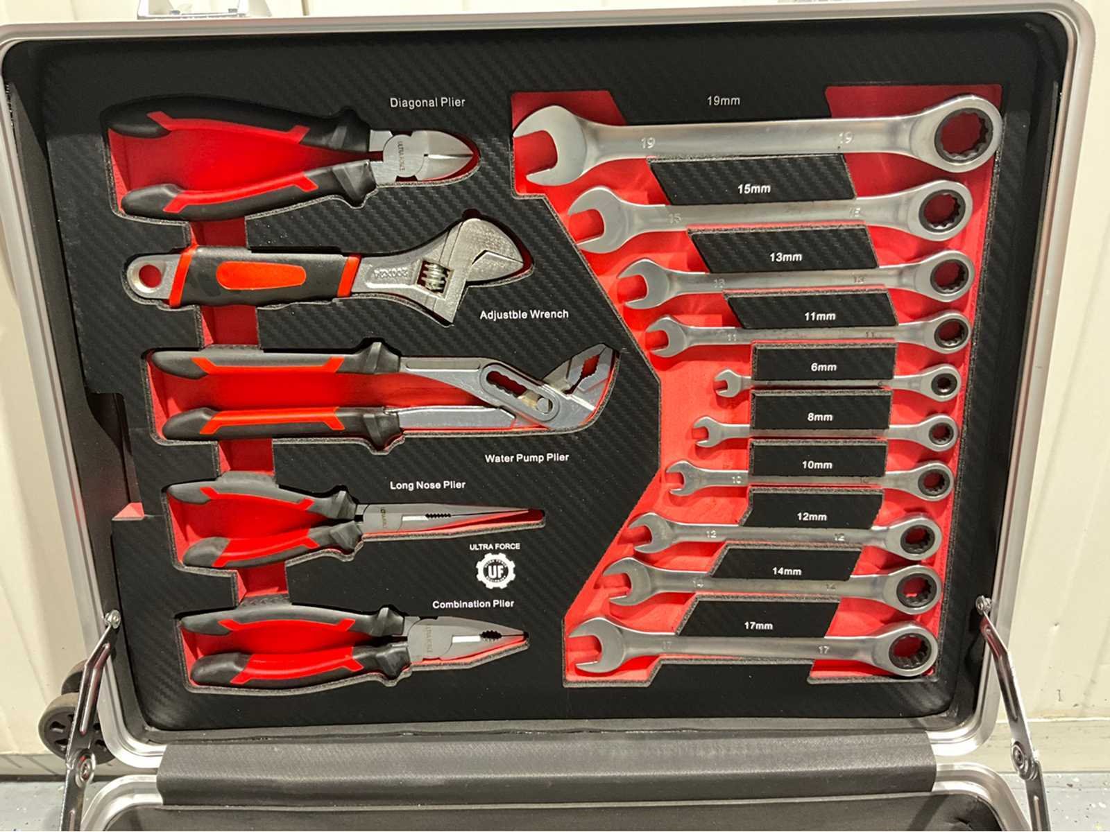 1 gereedschapswagen en 1 trolley. Gereedschapswagen 7 laden, 260-delige set, alle essentiële handgereedschappen direct binnen handbereik, incl 2 sleutels EN een degelijke gereedschapstrolley, 4 trays incl 238 pcs gereedschap, cijfersloten Nee Merk: Ultra Force Equipment Type: 260-Delig Bouwjaar: 2025 Aantal laden: 7 Met inhoud: true Eigen gewicht: 75kg Totale afmeting L: 470mm Totale afmeting Breedte: 790mm Totale afmeting Hoogte: 970mm