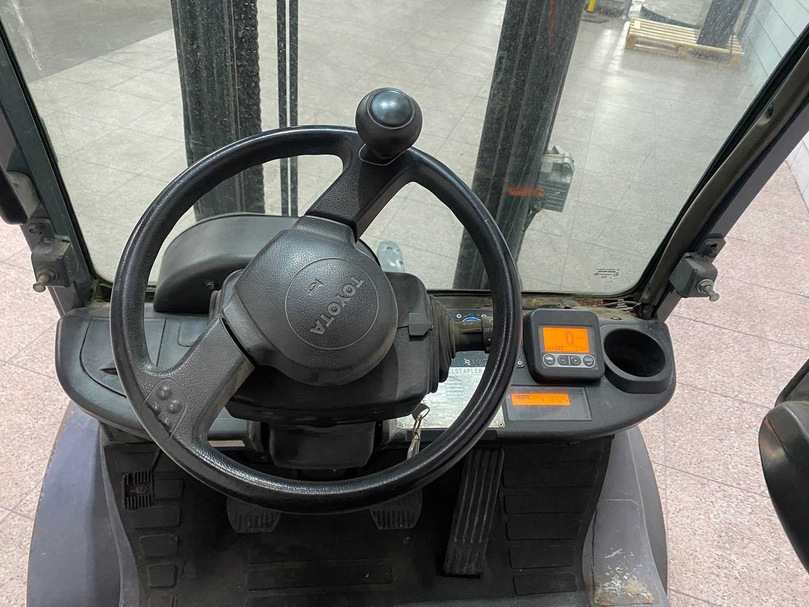 Nee Merk: Toyota Type: 02-8 FGF 25 Bouwjaar: 2008 Serienummer: 10555 Brandstof: LPG Mast: Duplex Soort band: Volrubber Aantal wielen: 4 Afgelezen urenstand: 7890 Side-shift: true Duplex mast: true Eigen gewicht: 3560kg Hefvermogen: 2500kg Lepellengte: 1100mm Hefhoogte: 4500mm Vol rubber banden: true Totale afmeting L: 3600mm Totale afmeting Breedte: 1150mm Totale afmeting Hoogte: 2820mm LPG: true