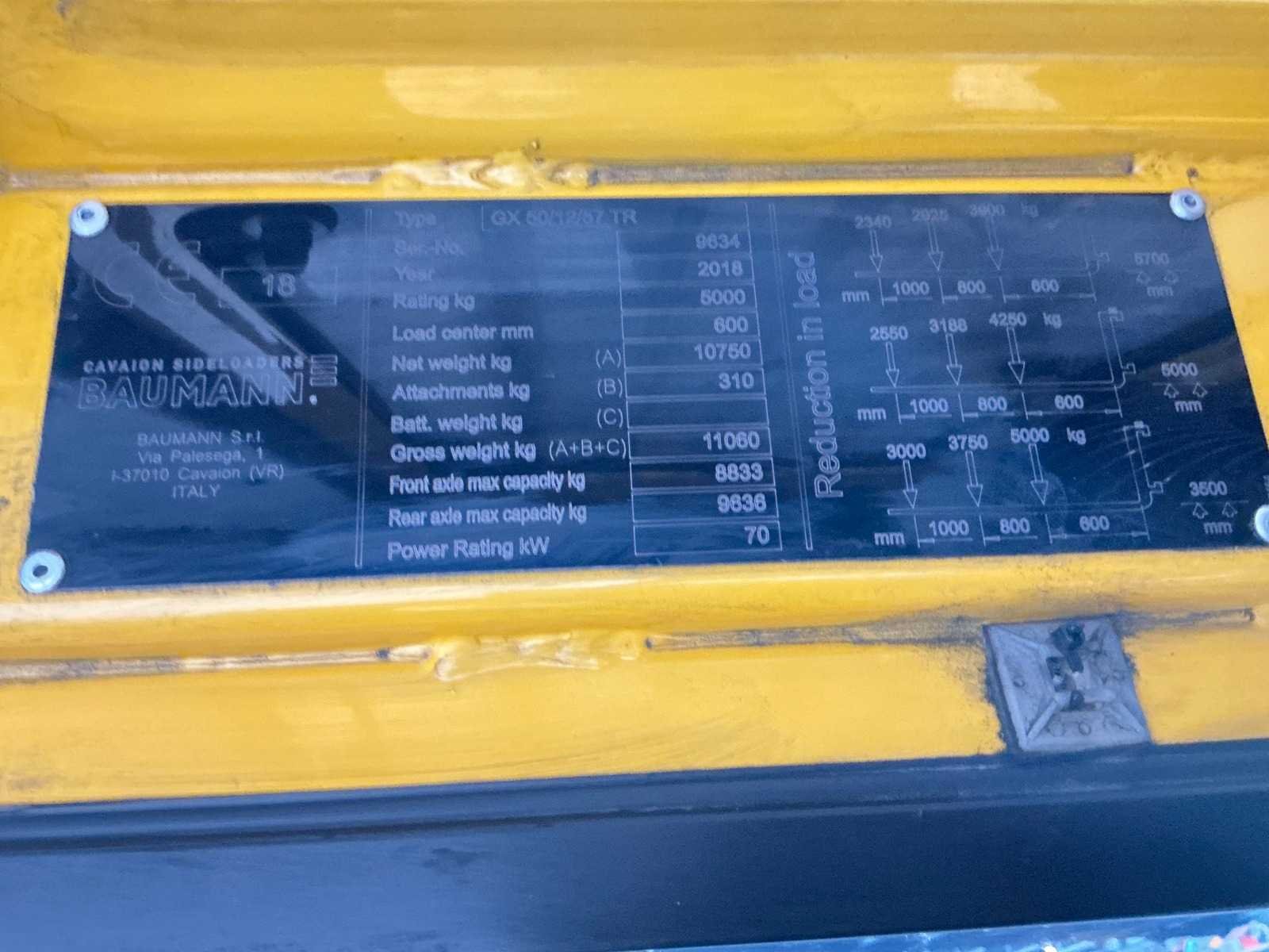 Nee Merk: Baumannn Type: GX50/12/57TR Bouwjaar: 2018 Serienummer: 9634 Diesel: true Hefvermogen: 5000kg Hefhoogte: 5700mm Lepellengte: 1190mm Afgelezen urenstand: 21894 Eigen gewicht: 11060kg Totale afmeting L: 5160mm Totale afmeting Breedte: 2070mm Totale afmeting Hoogte: 2880mm