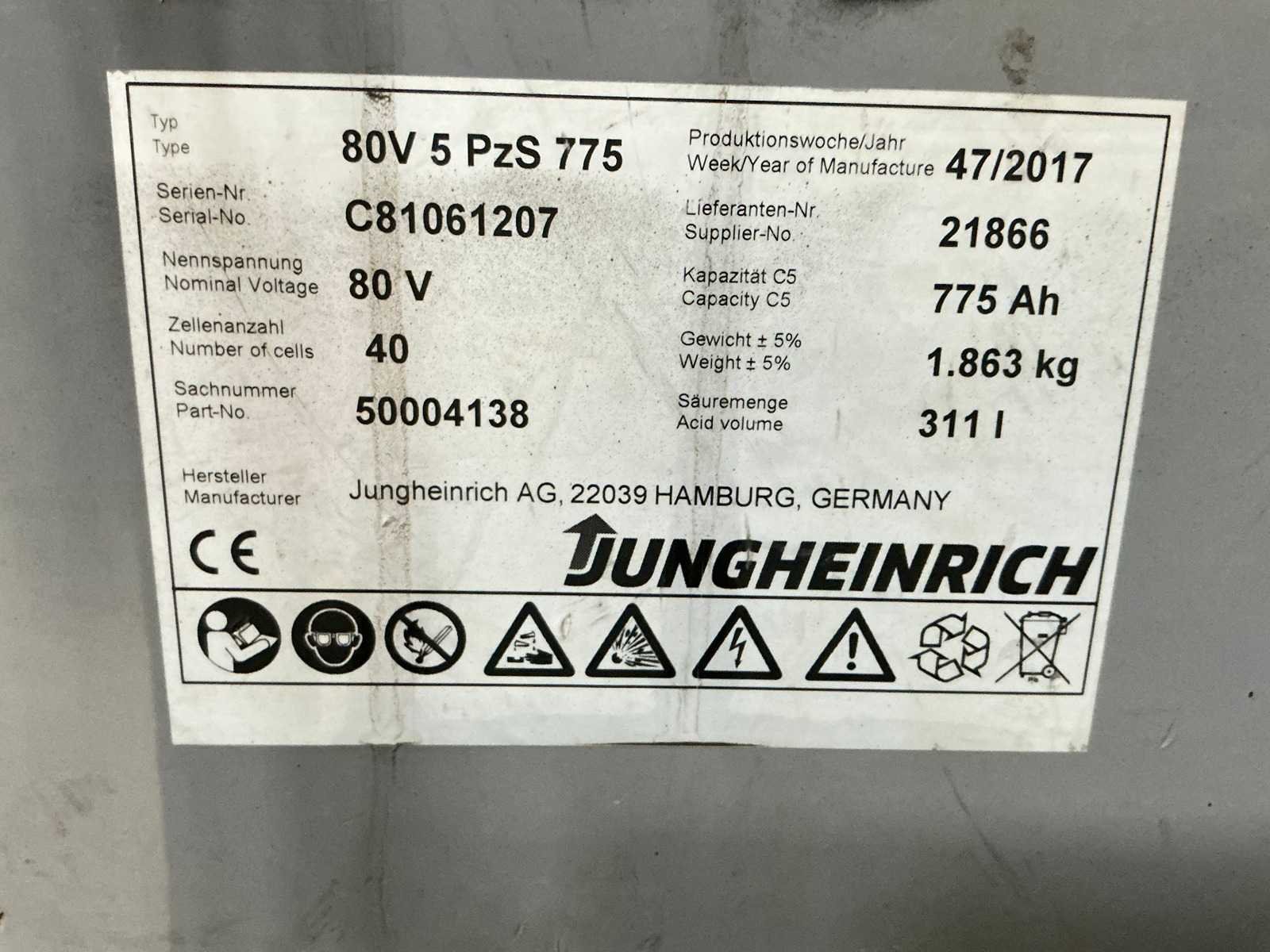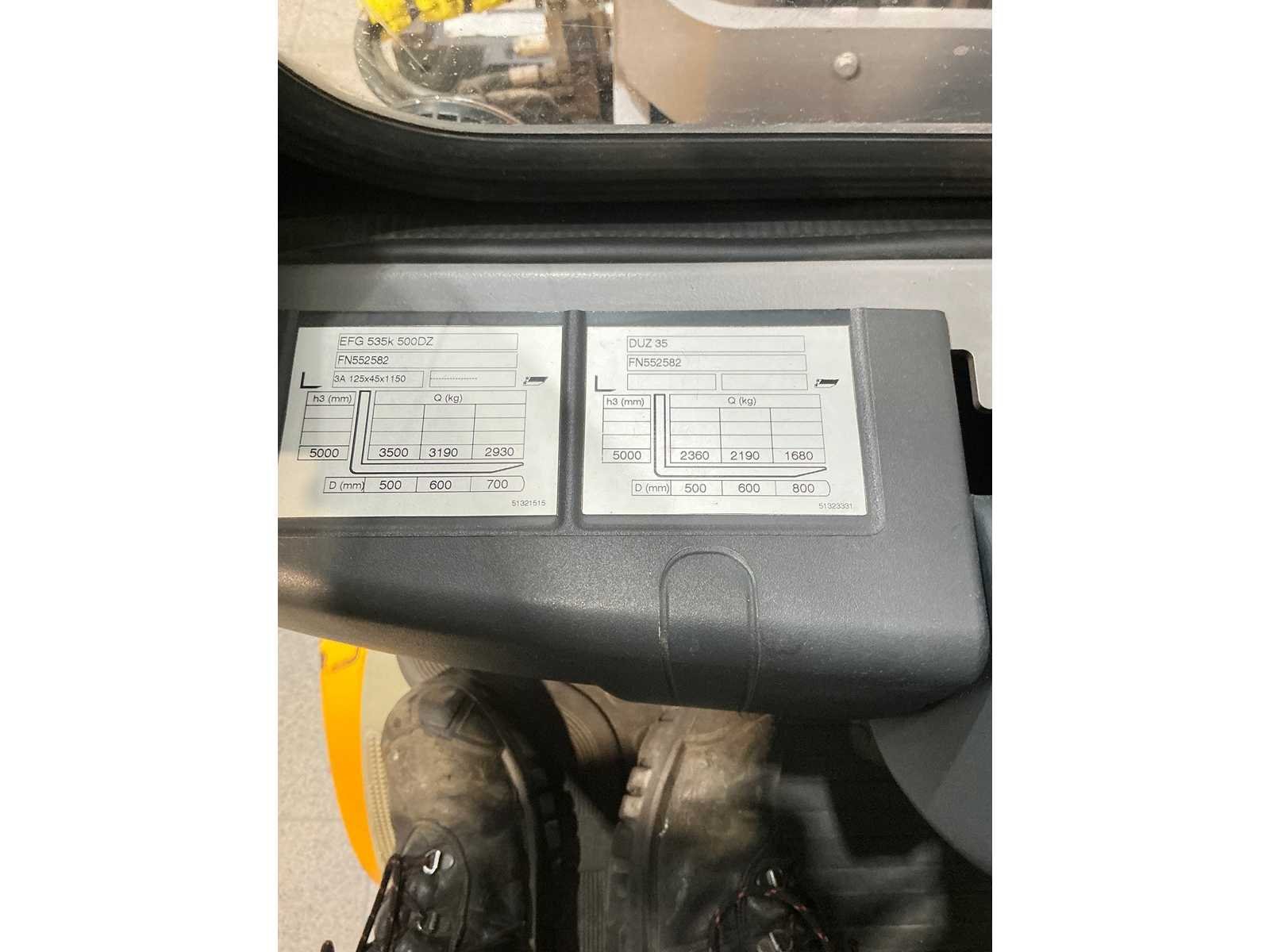 Nee Merk: Jungheinrich Type: ÈFG535K Bouwjaar: 2017 Serienummer: FN552582 Brandstof: Elektrisch Mast: Triplex mast Soort band: Volrubber Aantal wielen: 4 Afgelezen urenstand: 4812 Accu lader: true Free-lift: true Side-shift: false Roterend vorkenbord: true Hydraulisch verstelbare lepels: true Triple mast: true Eigen gewicht: 6171kg Hefvermogen: 3500kg Lepellengte: 1600mm Hefhoogte: 5010mm Vol rubber banden: true Totale afmeting L: 3805mm Totale afmeting Breedte: 1340mm Totale afmeting Hoogte: 2370mm