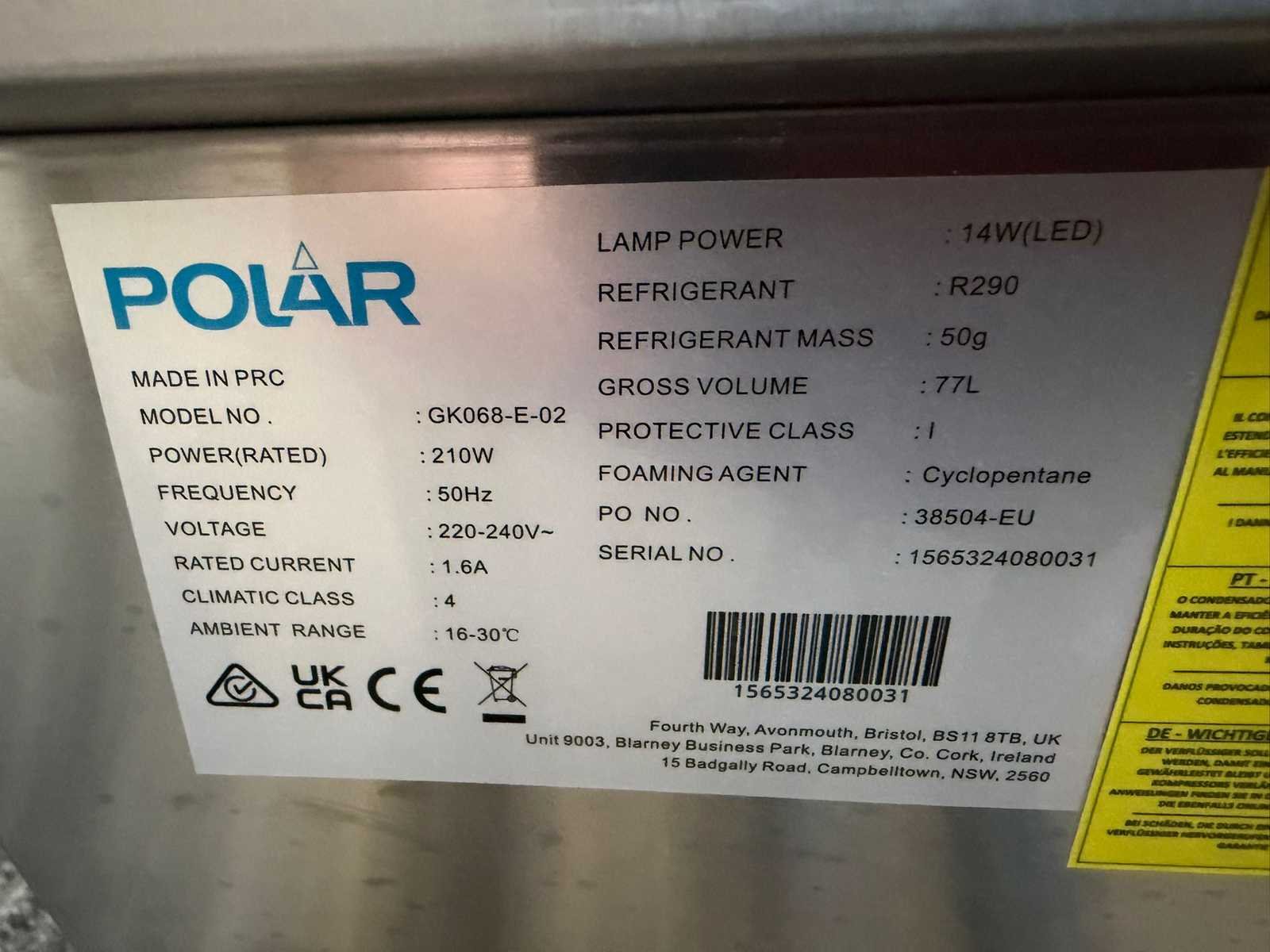 Ongebruikt, Schepijsvitrine Nee Merk: Polar Type: GK068-E-02 Ingebouwde koelcompressor: true Aansluiting: 230V Digitale uitlezing: true Rvs: true