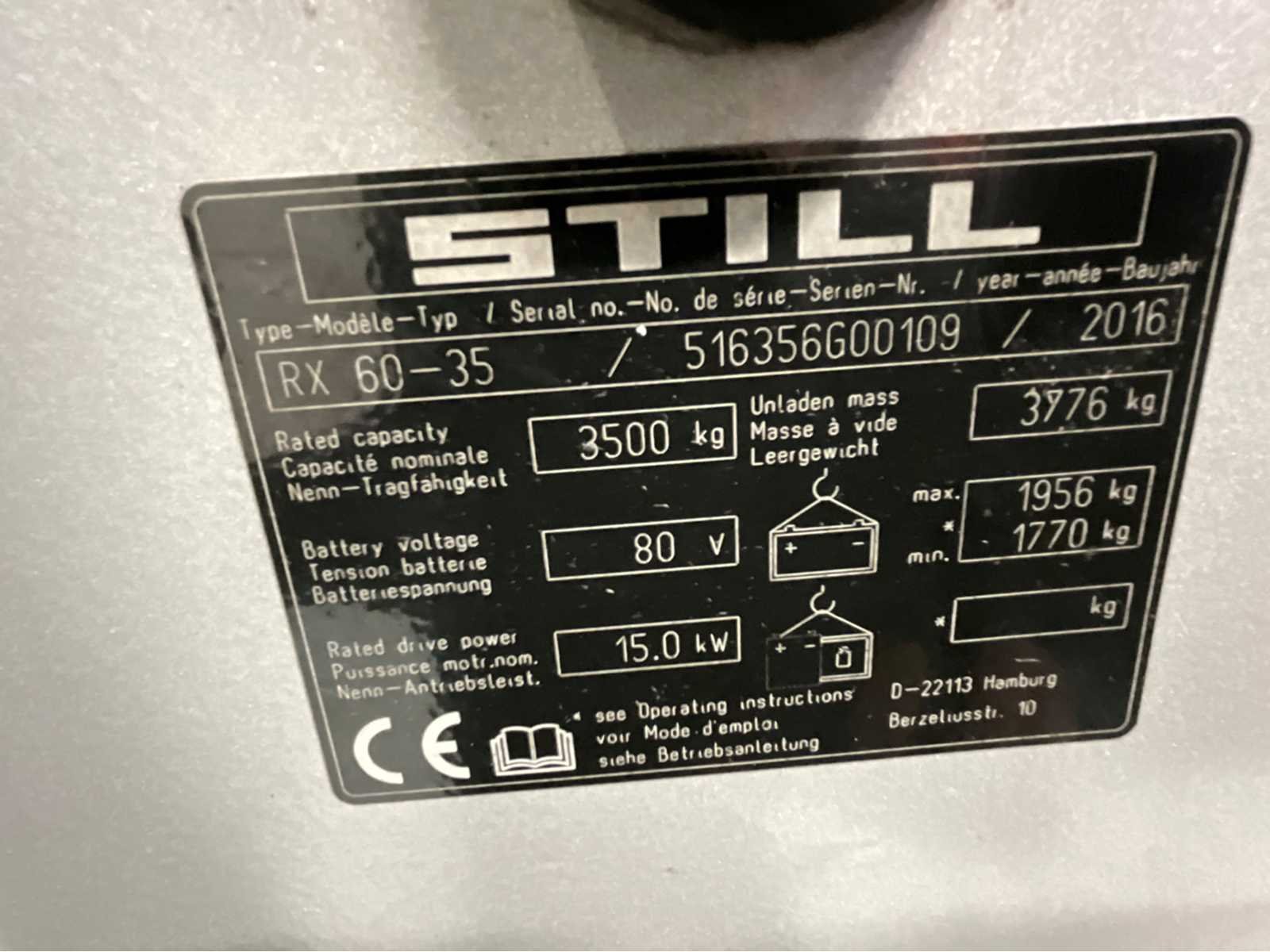 Bluespot, half gesloten cabine, 3e en 4e functie, non marking banden, accu 2024 Nee Merk: Still Type: RX60-35 Bouwjaar: 2016 Serienummer: 516356G00109 Brandstof: Elektrisch Soort band: Volrubber banden non marking Aantal wielen: 4 Free-lift: true Triple mast: true Eigen gewicht: 5732kg Hefvermogen: 3500kg Lepellengte: 1200mm Max. hefhoogte: 4900mm Hefhoogte: 4900mm Vol rubber banden: true Minimale doorrijhoogte: 2300mm Totale afmeting L: 4000mm Totale afmeting Breedte: 1500mm Totale afmeting Hoogte: 2300mm
