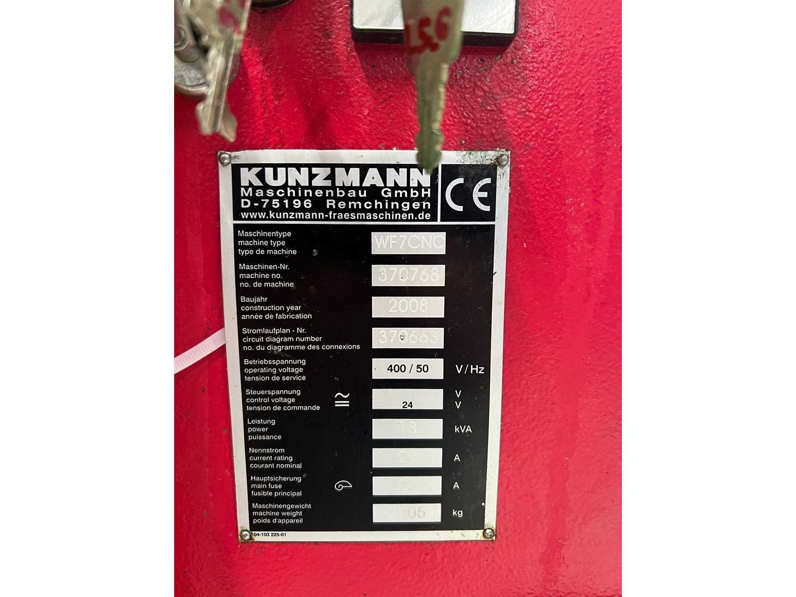 Machine reeds gereed voor transport en op kijkdag te beoordelen No Merk: Kunzmann Type: WF7CNC Bouwjaar: 2008 Serienummer: 370768 Verplaatsing x-as: 500mm Verplaatsing y-as: 400mm Verplaatsing z-as: 400mm Opname iso: 40 T-gleuf opspantafelafmeting L: 700mm T-gleuf opspantafelafmeting B: 425mm Koelmiddelpomp: true Aansluiting: 400V Machinegewicht: 2305kg Afmeting l: 2350mm Afmeting b: 2555mm Afmeting h: 2500mm