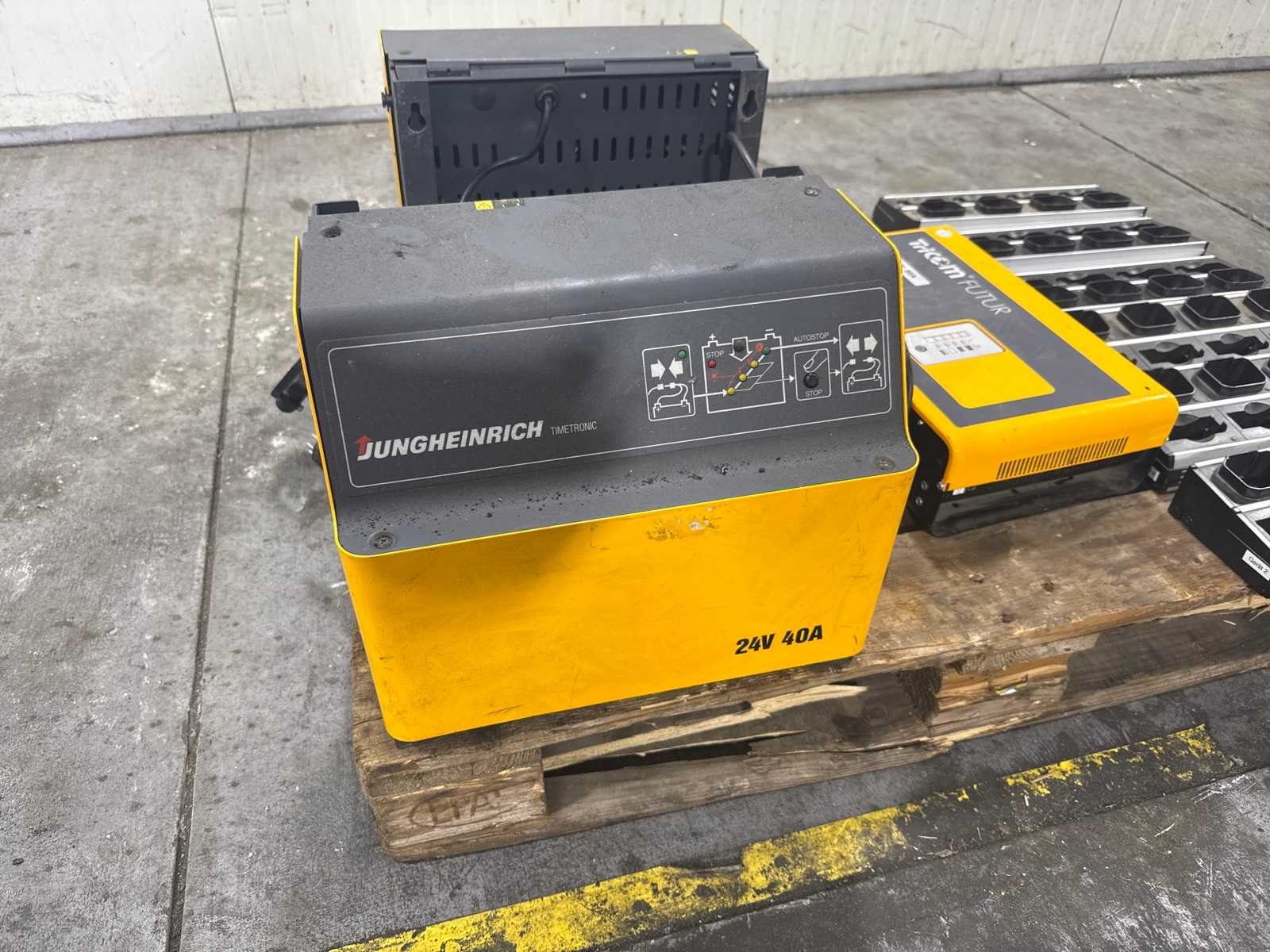 2 Stuks No Merk: Jungheinrich Spanning: 24V Laadstroom: 30A Aansluiting: 220V Eigen gewicht: 10kg Totale afmeting L: 400mm Totale afmeting Breedte: 300mm Totale afmeting Hoogte: 300mm