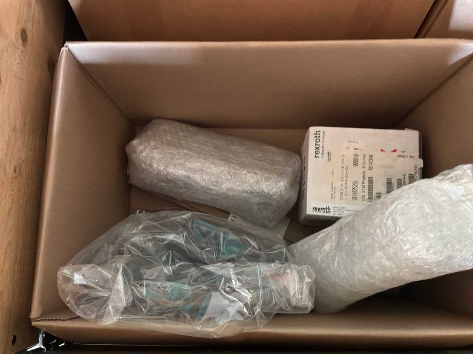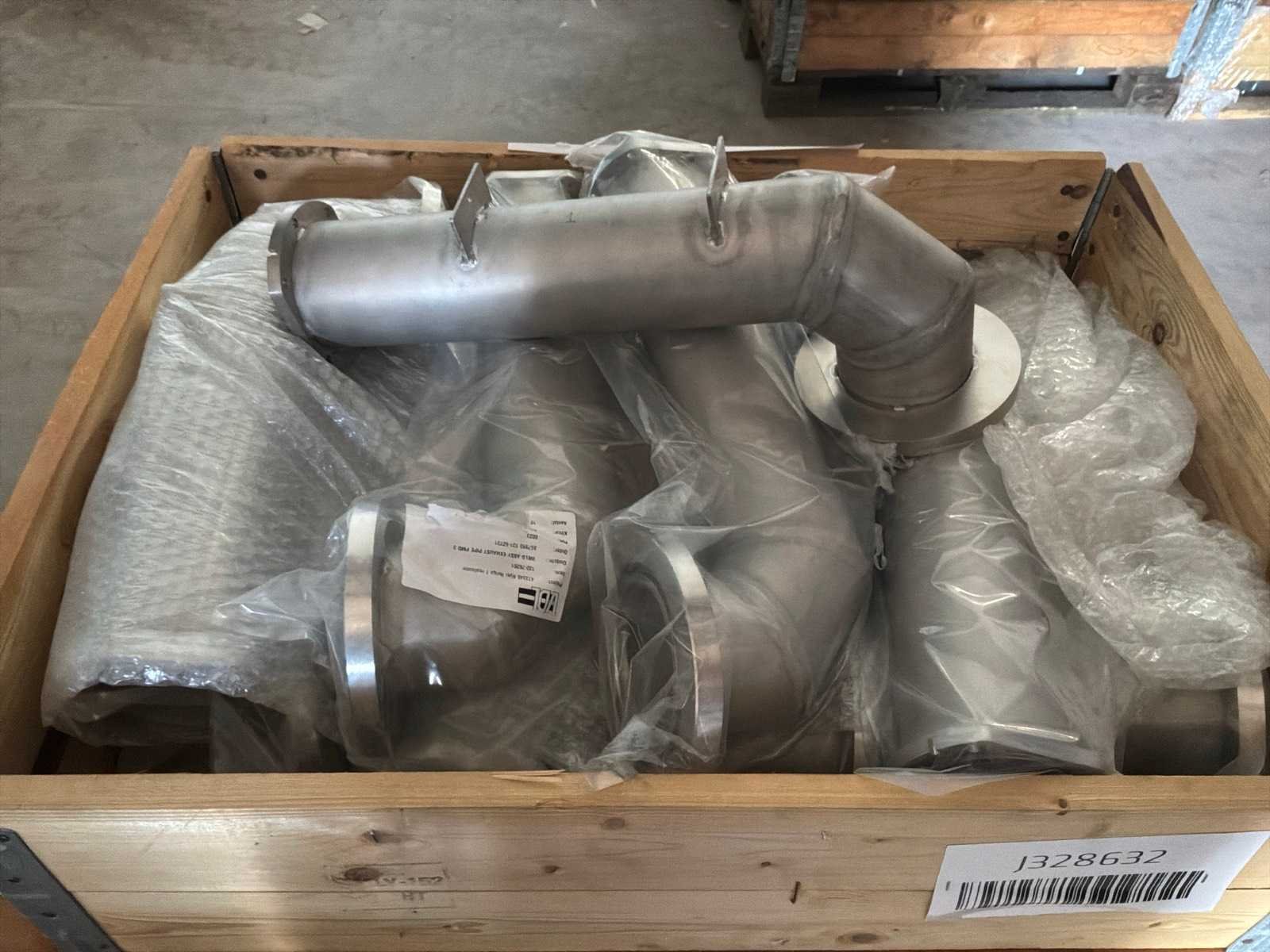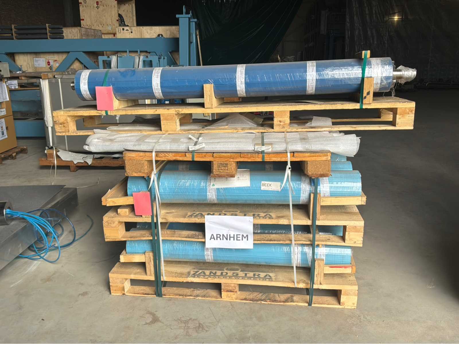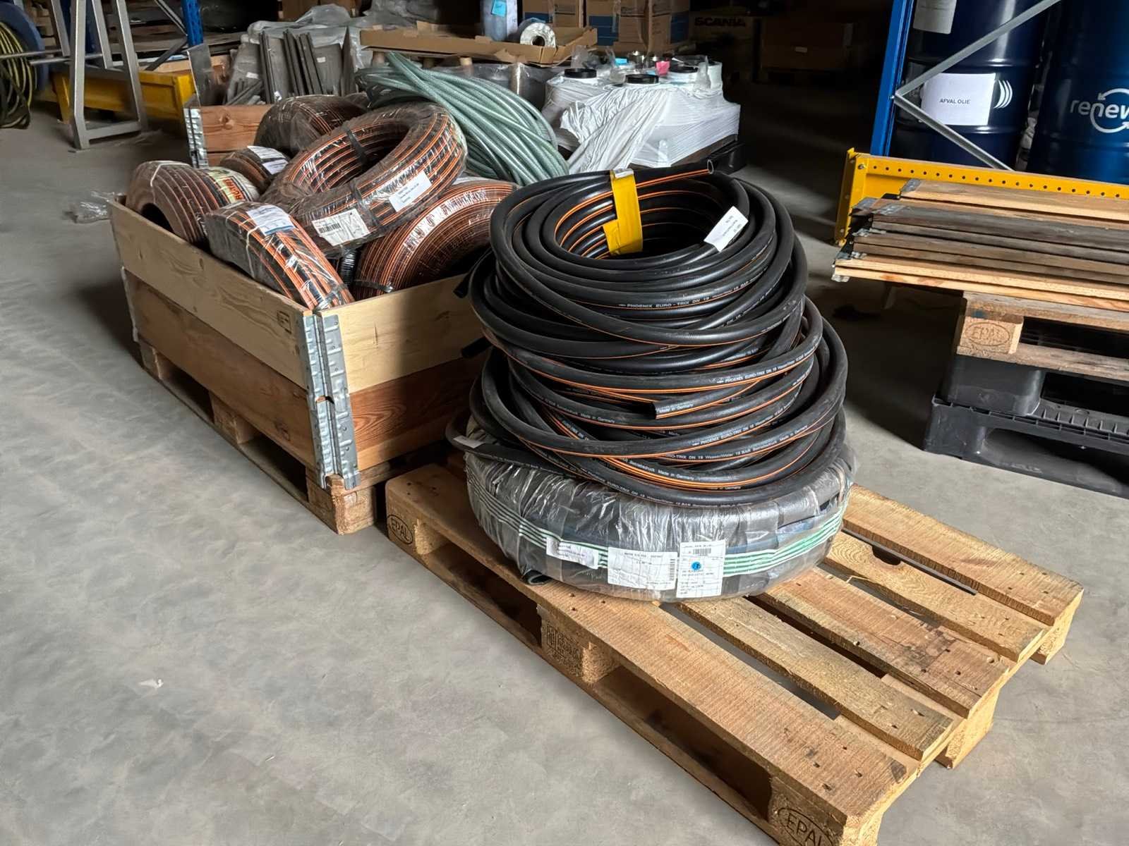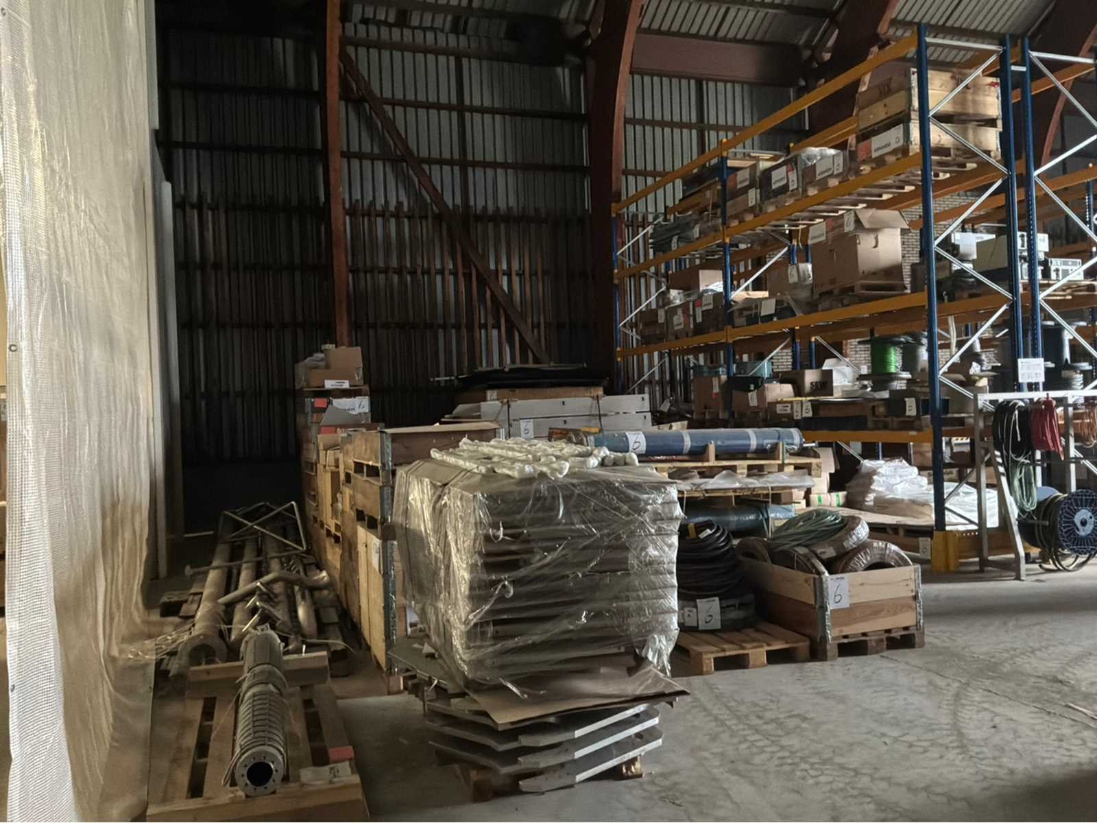 Diverse machineonderdelen behorend tot lot nr. 5, bestaande uit onder andere: roestvrijstalen onderdelen, diverse elektrische componenten, drukkleppen, klemmen, kabels, AC-aandrijvingen, flowmeter, aluminium buizen, diverse hozes, 2x mobiele opslagrekken. No