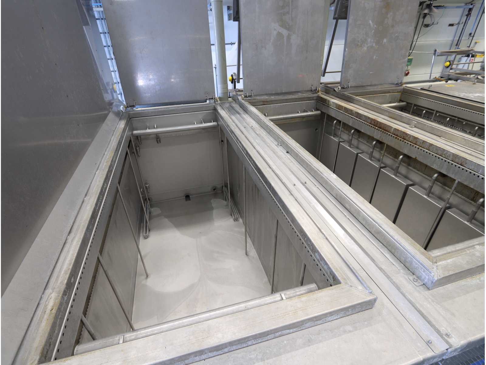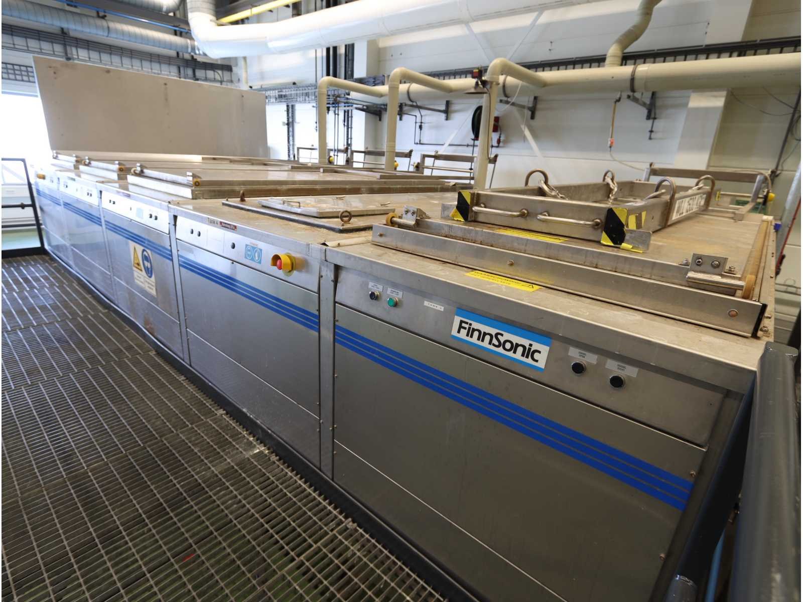 "Finnsonic" 5-voudig ultrasoon reinigingsbad, bestaande uit onder andere: 4 tanks die de volgende chemicaliën gebruikten, tank 1: fosforzuur ( 10%), tank 2: demi-water, tank 3: natriumhydroxide (5%), tank 4: natriumhydroxide (5%), tank 5 is een droogkamer met diverse hijsapparatuur, elk met pneumatisch bediend deksel, 2x reinigingsmand, 1x afzuigkap, diverse reserveonderdelen, 1x 4-deurs schakelkast, loopplatform met trap, gebruikte vloeroppervlakte ongeveer 7500x6500 mm No Merk: FinnSonic Type: V31 W-range Bouwjaar: 2010 Aansluiting: 400V