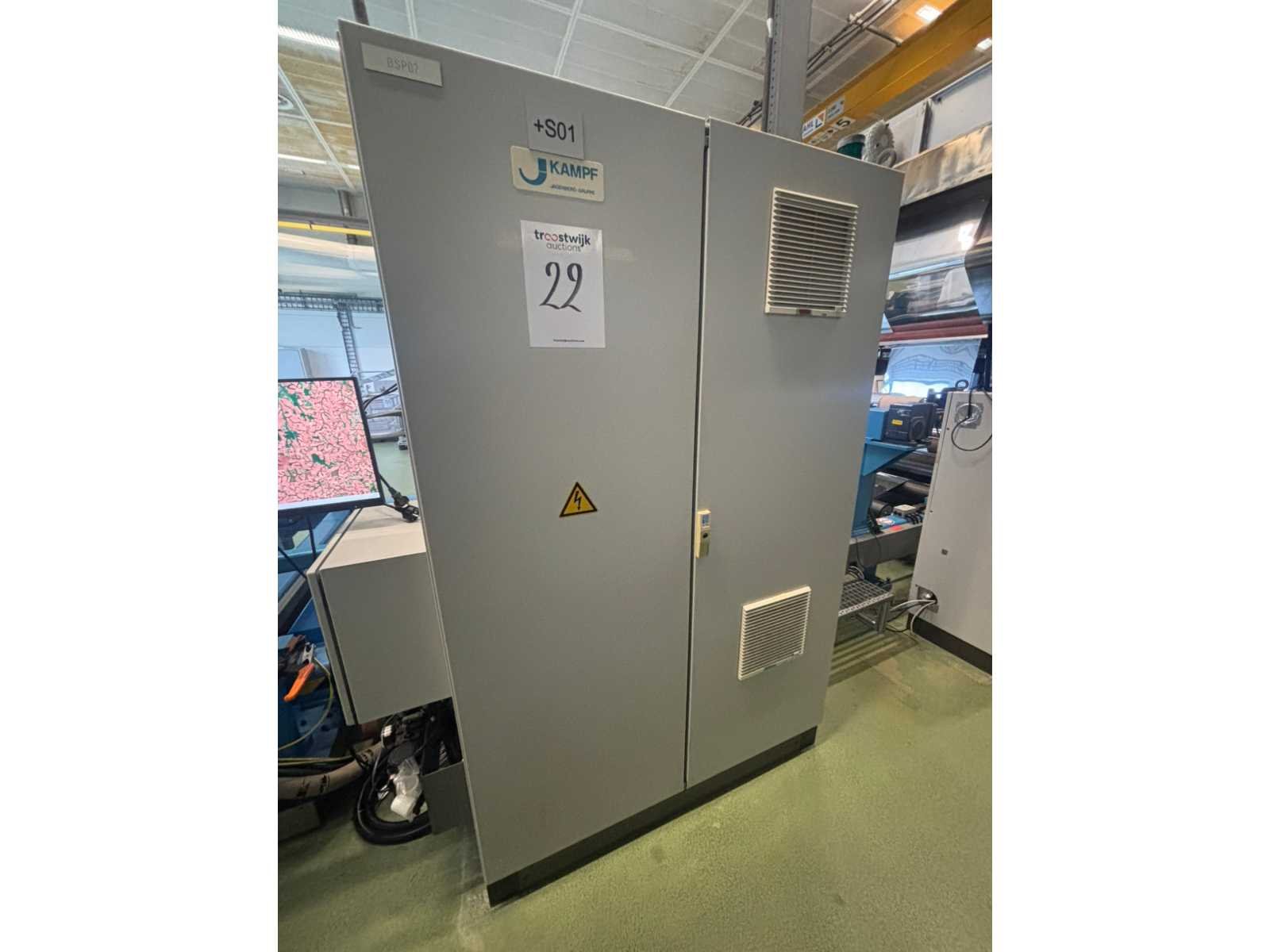 Bestaande uit: "Erhardt+Leimer" geleidingssysteem type DC 2340, "Boschert" veiligheidschucks type A40 & A50, "Siemens" simatec touchpaneel, 2x "Blisten" cirkelvormige cutter type quadron, "Avantes" multikanaals spectrometer, 2x "Labelmate" labelontvouwer, 1x "Kampf" 2-deurs schakelkast, 1x 1-deurs schakelkast, gebruikte vloeroppervlakte ongeveer 6500x3000 mm. No Merk: Kampf Bouwjaar: 2008 Productgrootte l: 1400mm