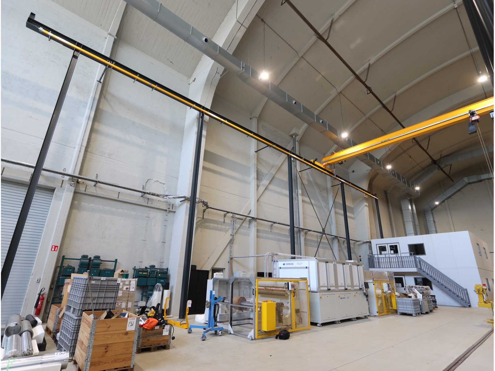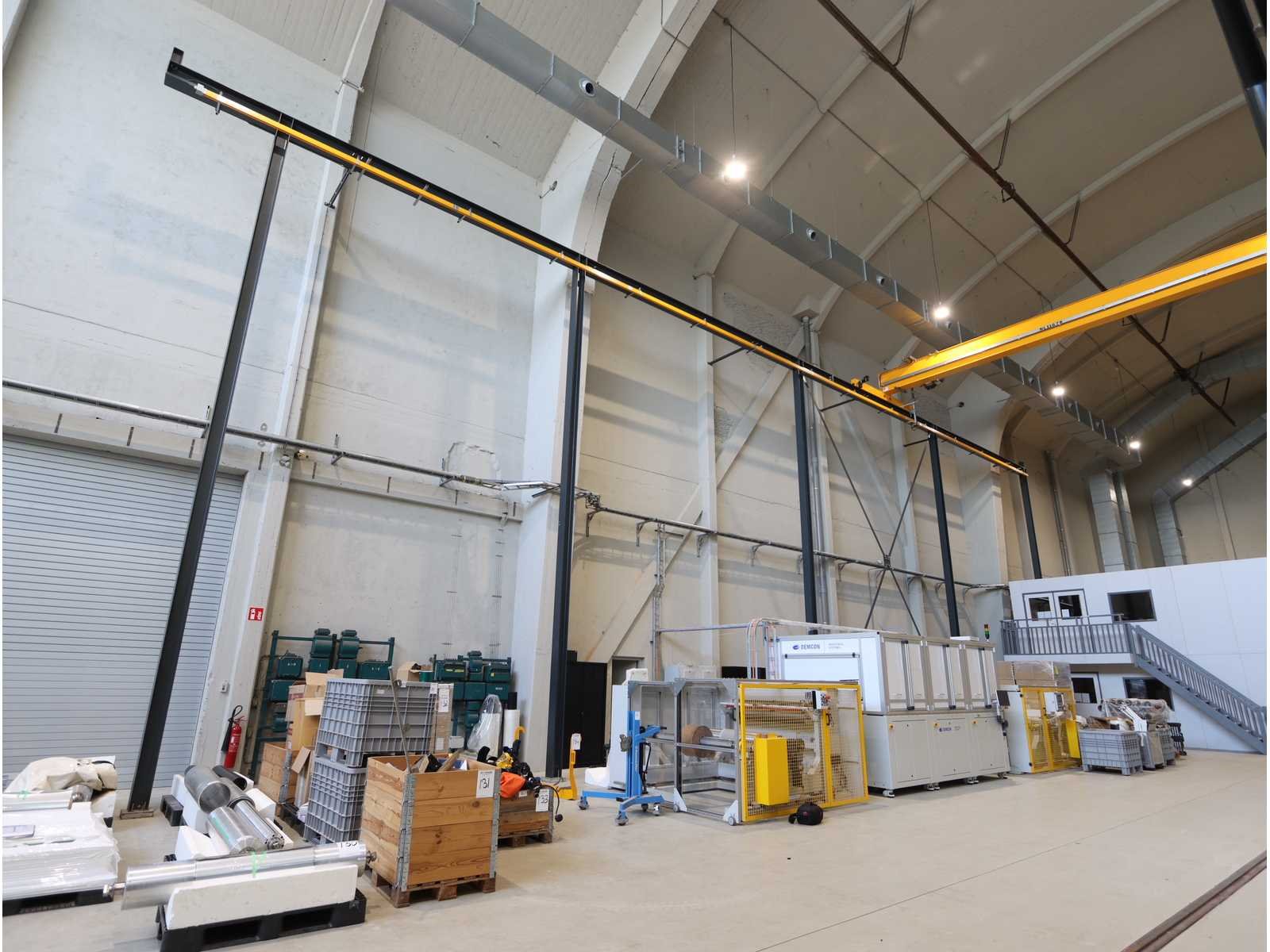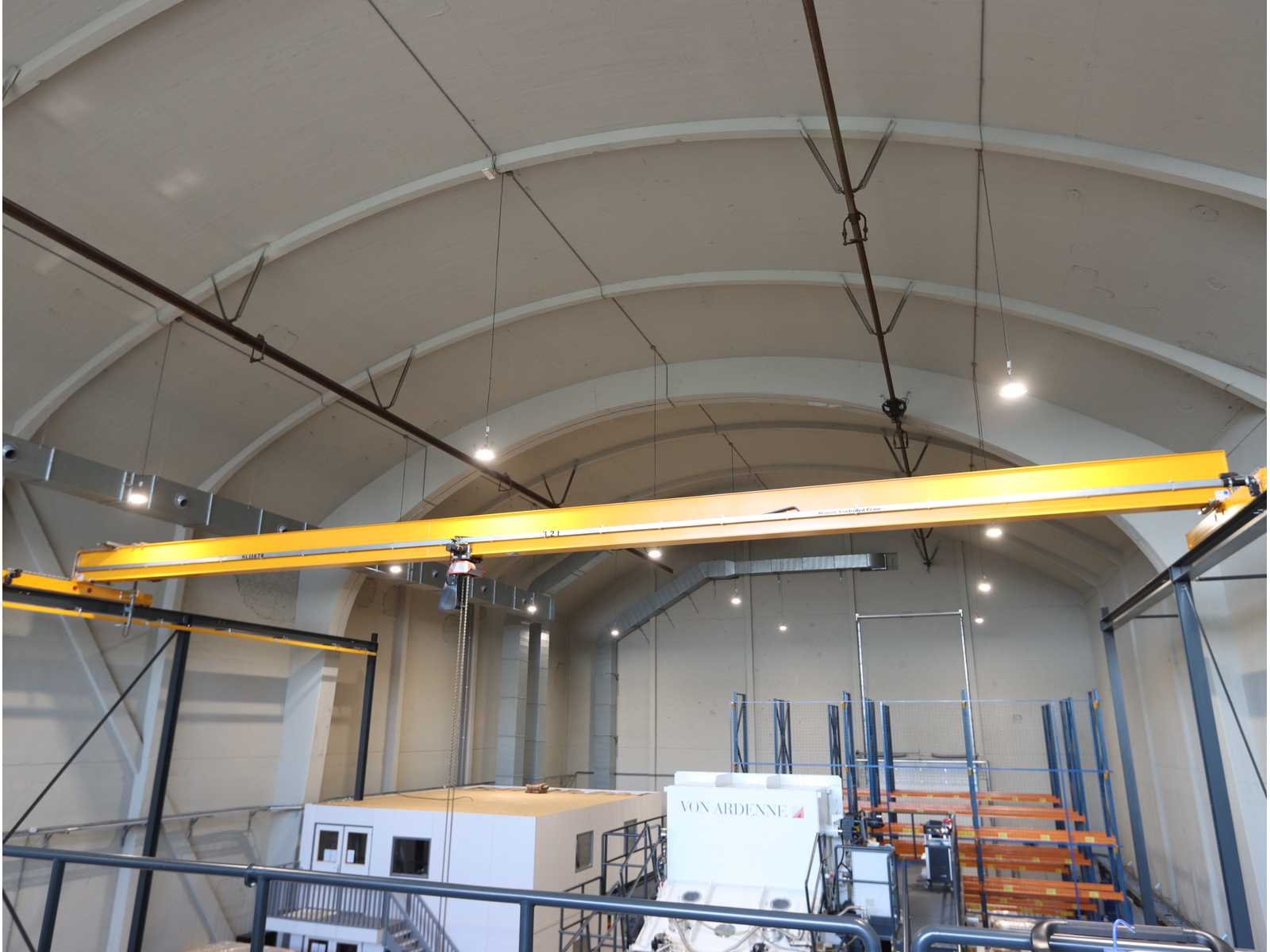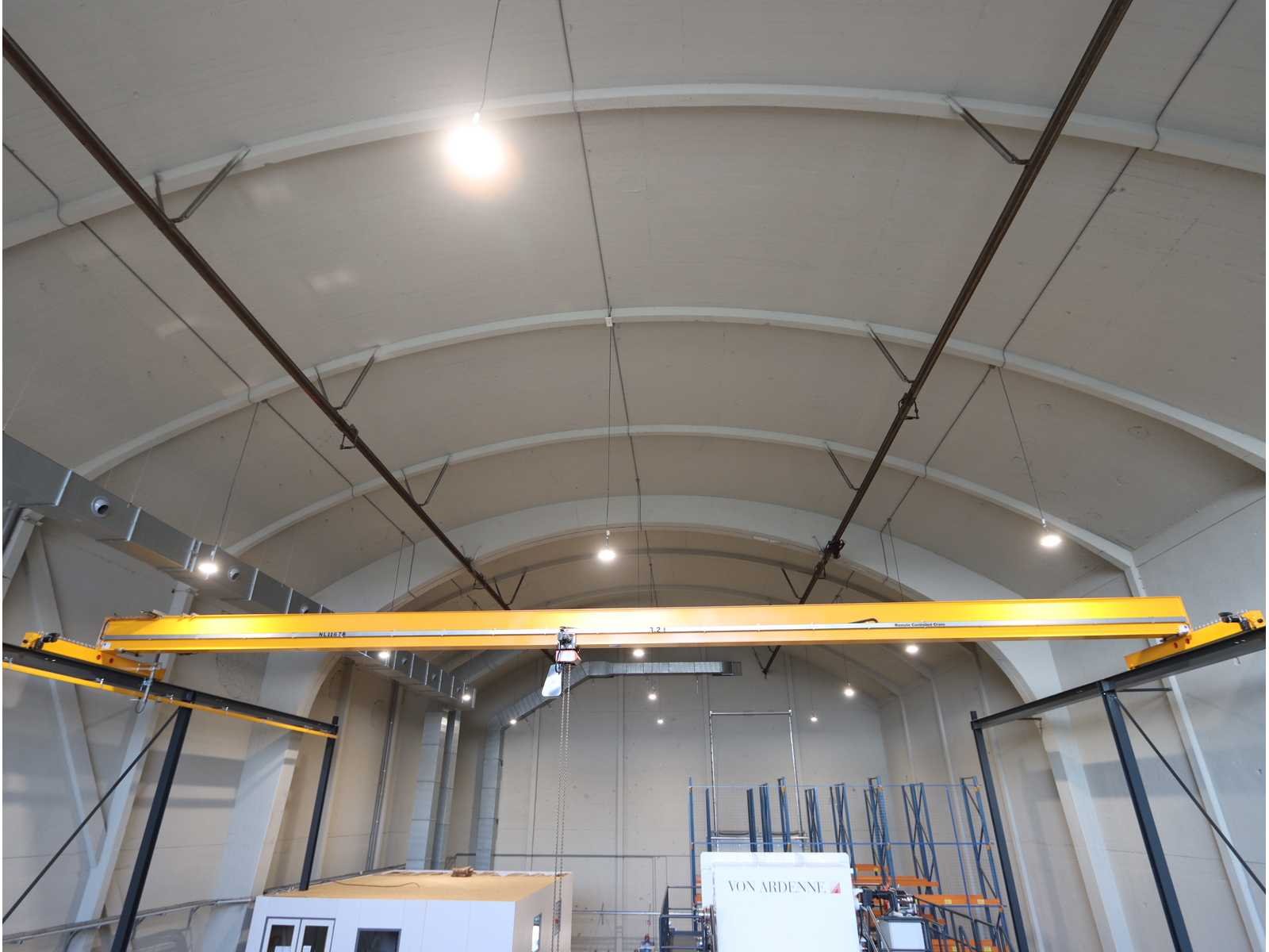 Met elektrische kettingtakel, op afstand bediend, 10 stalen kolommen, hoogte ongeveer 9,500 mm, voortbewegingsbalk ongeveer 27,500 mm en stroomrail No Merk: Konecranes Overspanning: 21m Hijsvermogen: 3200kg Draadloze afstandsbediening: true Met kraanbalk: true
