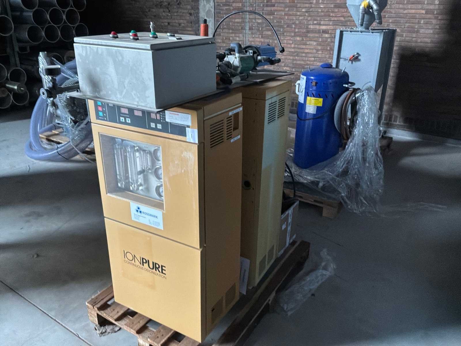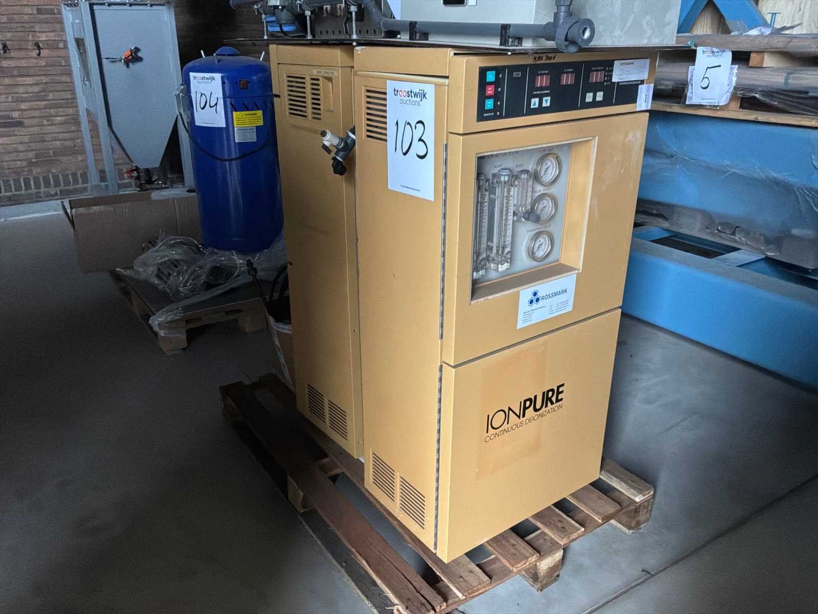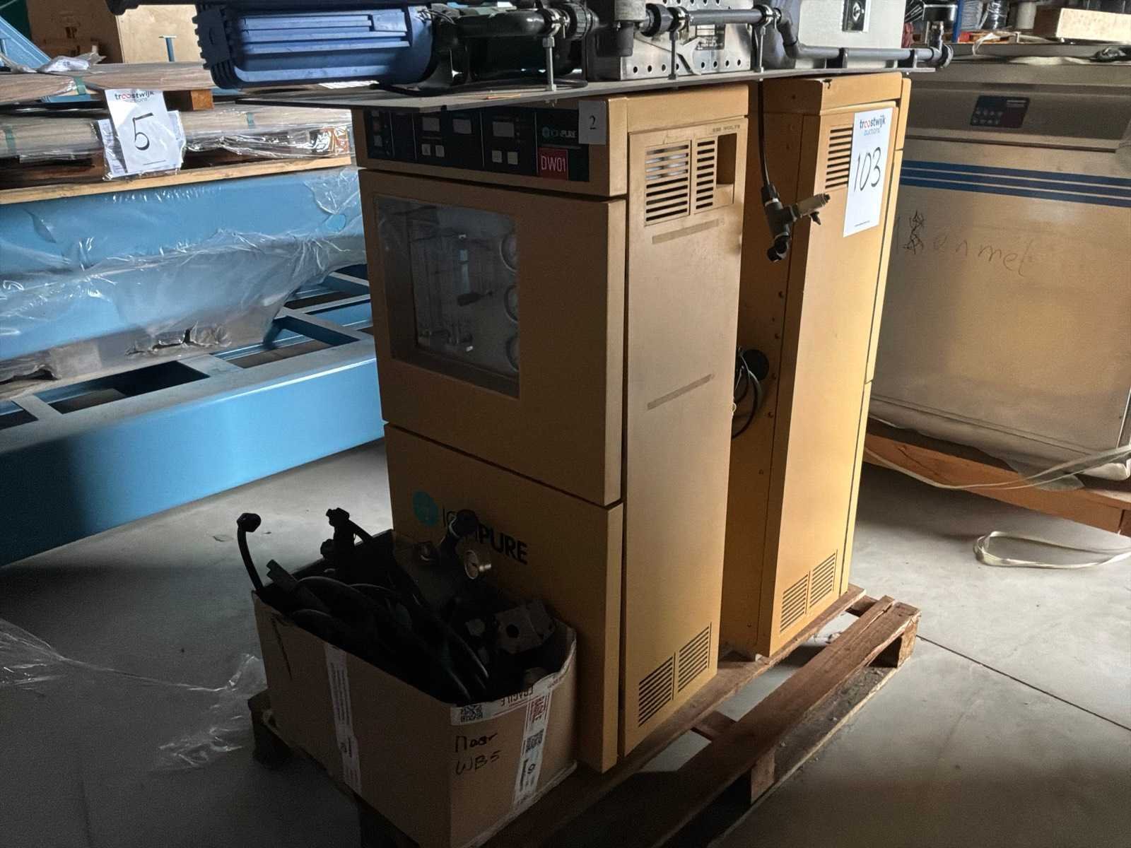 Bestaande uit: 2x "Ionpure" de-ionazatieunits, 1x schakelkast, 1x "Aquafine" UV-licht No Merk: Ionpure Aansluiting: 230V