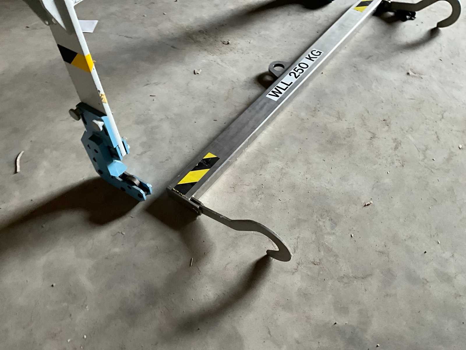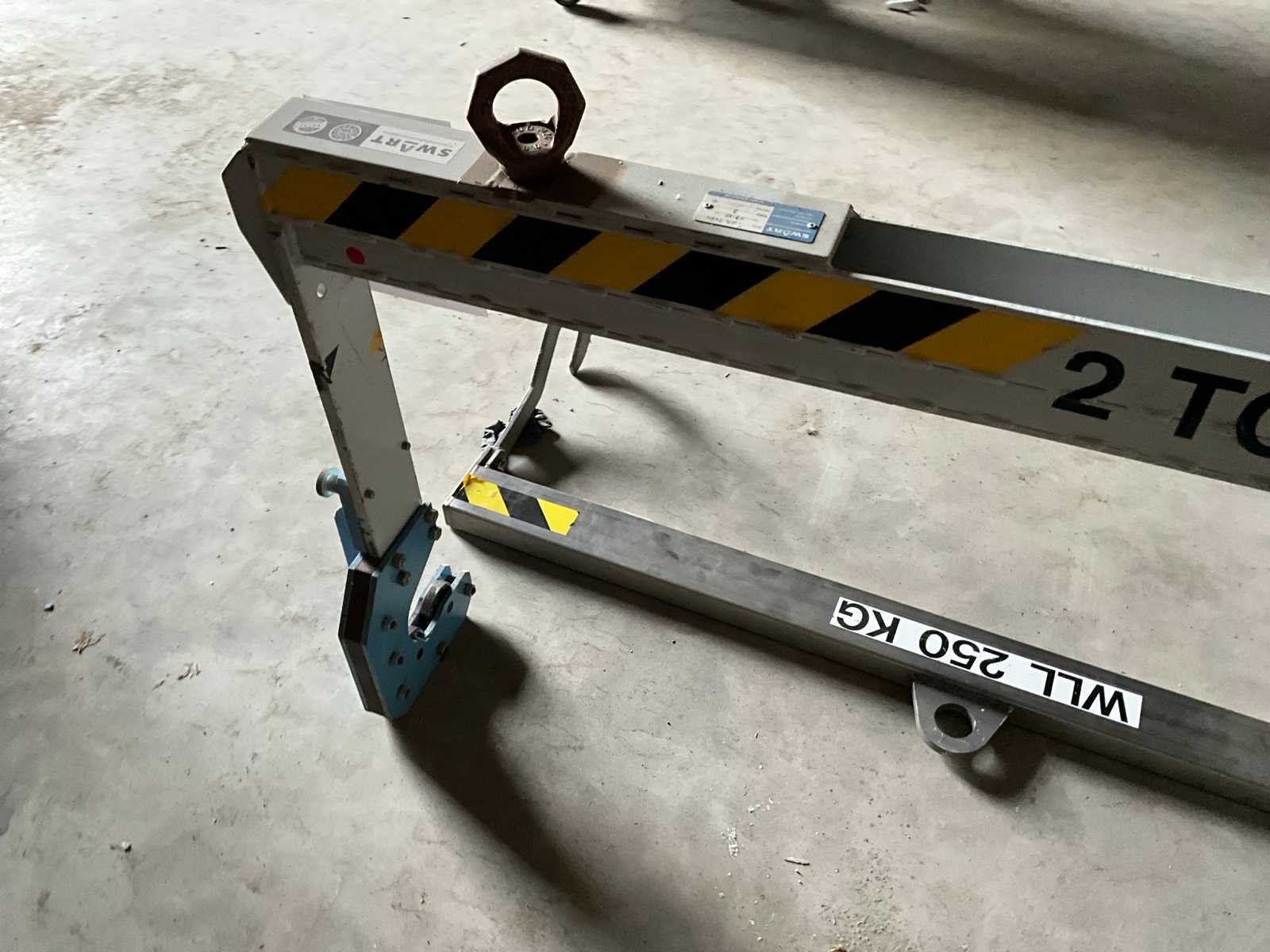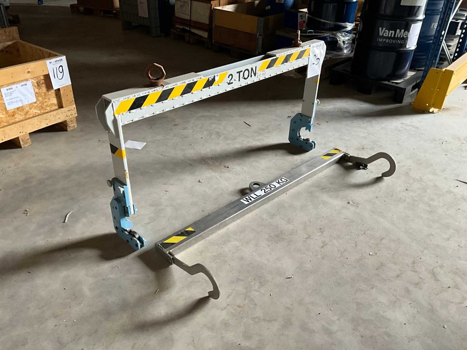 1x roestvrijstalen hefbalk, capaciteit 250 kilogram, breedte 1600 millimeter, 1x hefbalk, capaciteit 2000 kilogram, breedte 1660 millimeter. No