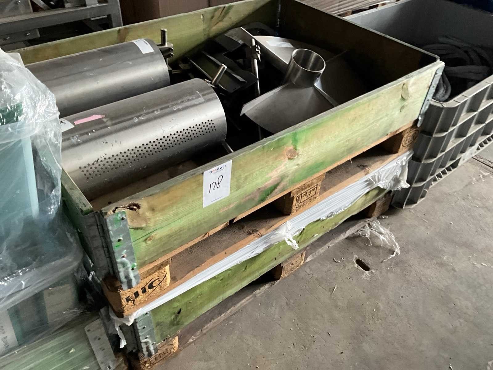 Bestaande uit ongeveer 30 pallets, waaronder kratten met reserveonderdelen, roestvrijstalen onderdelen, molens, frames, elektrische onderdelen, blowers, defecte machines No