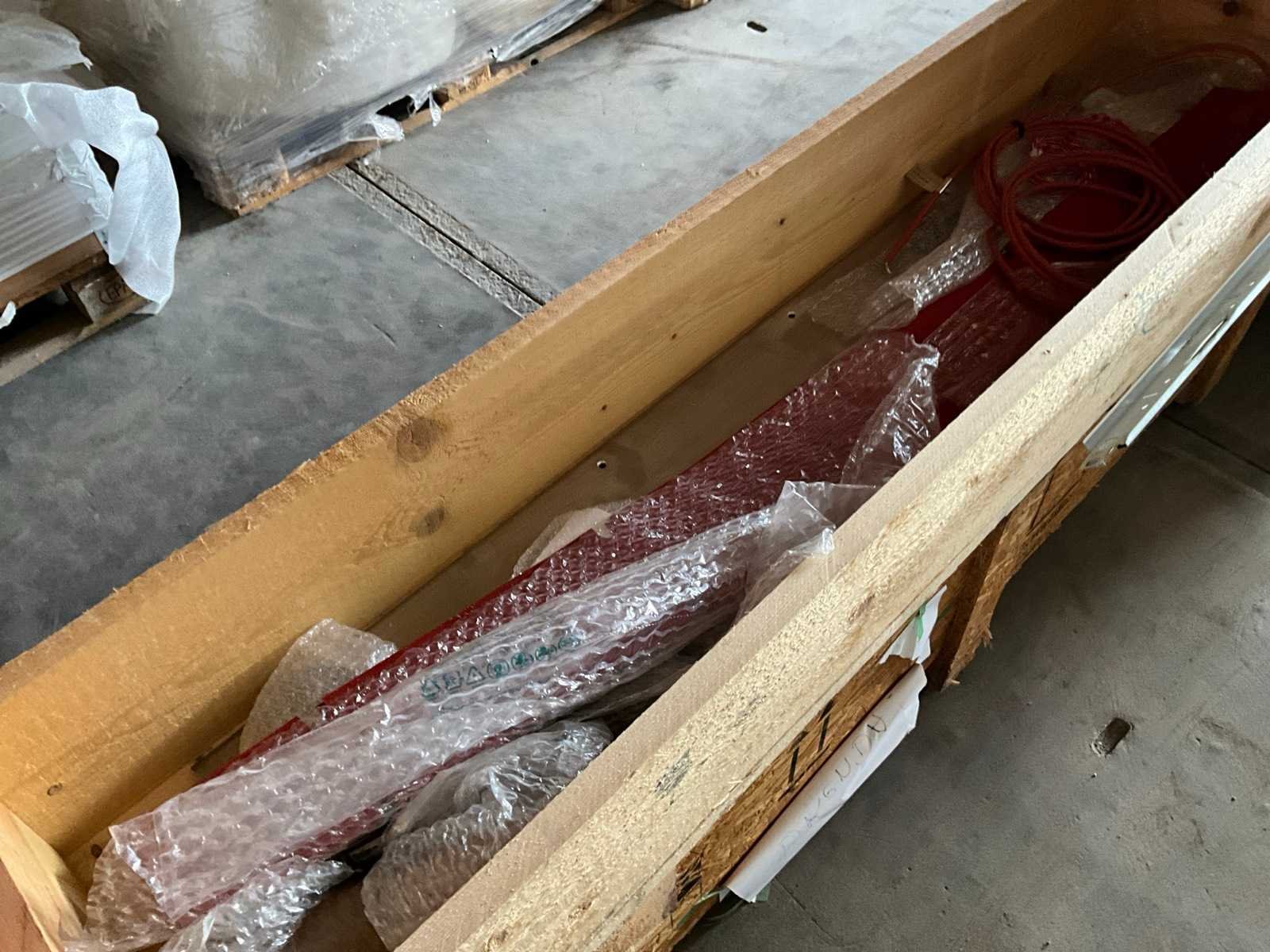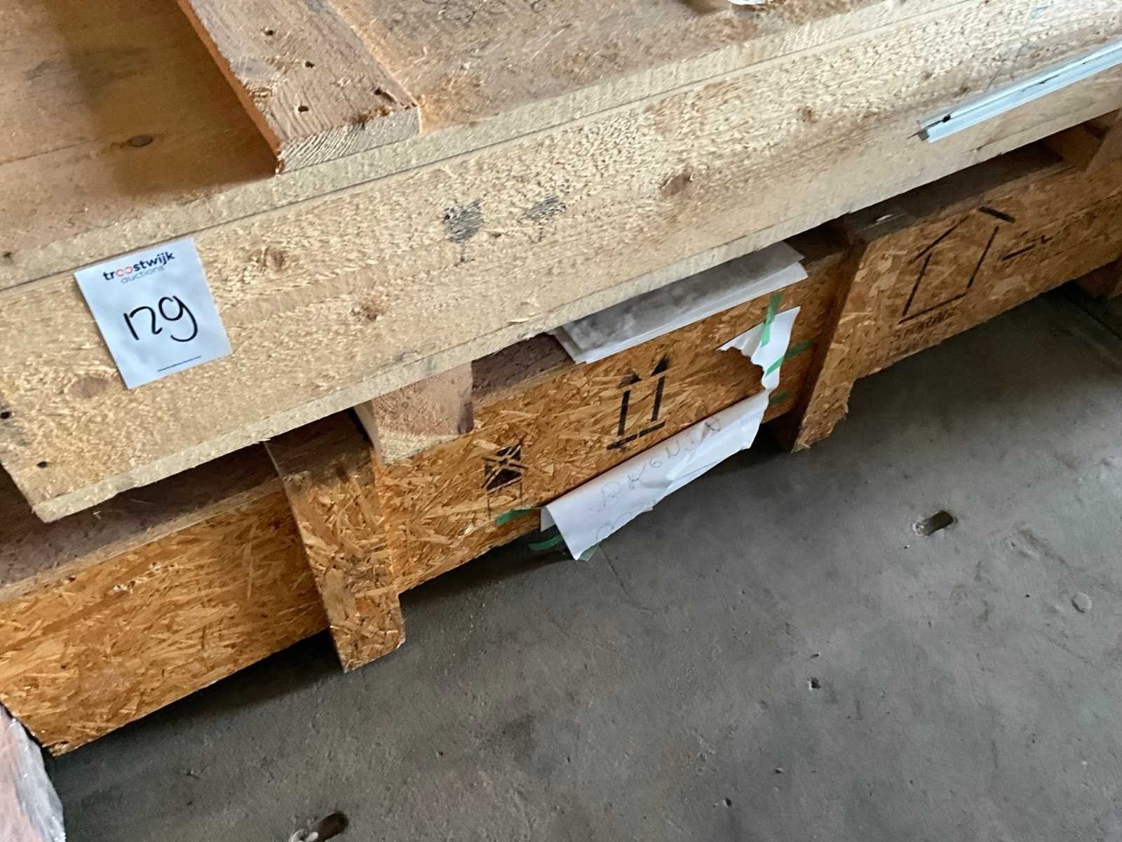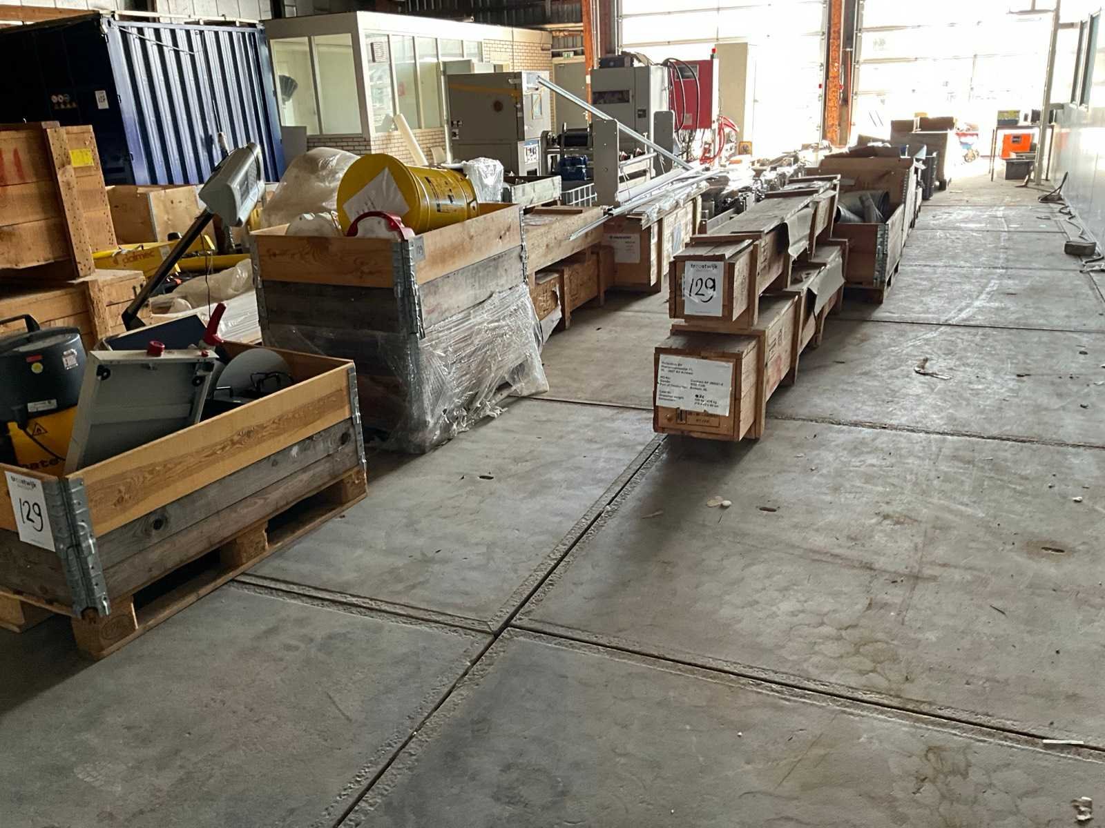 Bestaande uit 21 pallets, waaronder aluminium frameonderdelen, roestvrijstalen machineonderdelen, elektrische componenten, kabels, buizen, houten kratten met mouwen, schaal, barrièrematerialen, enzovoort No