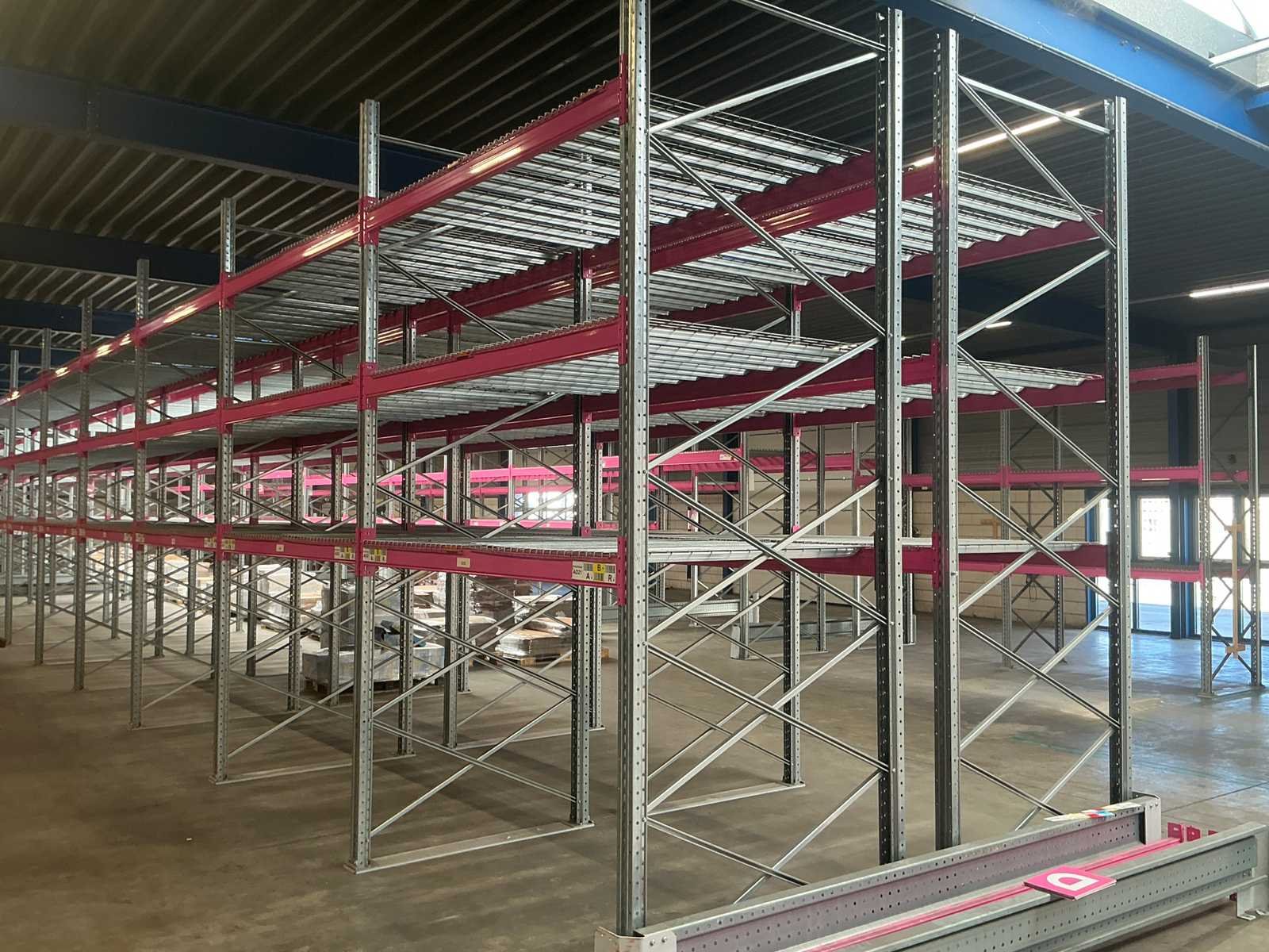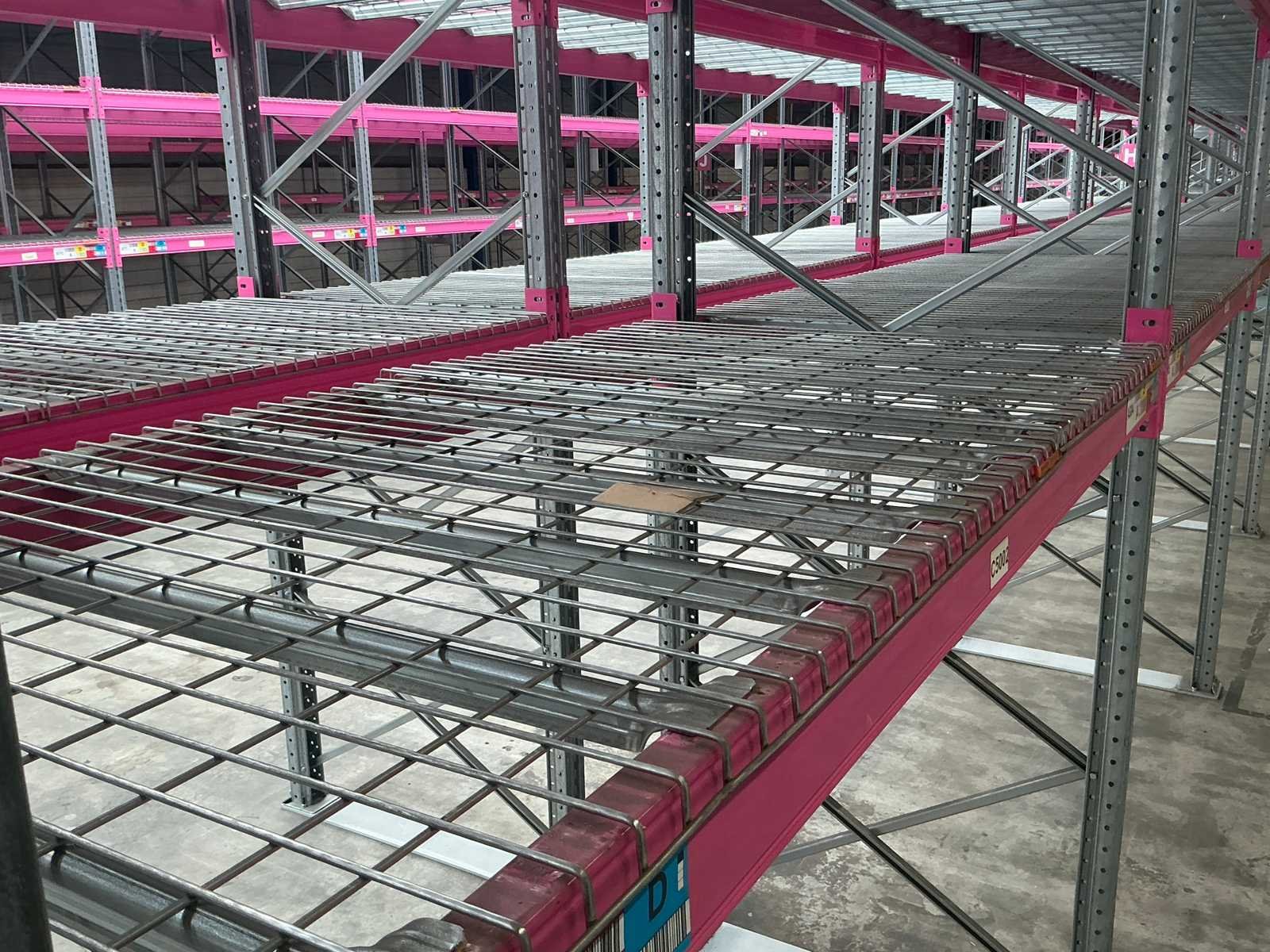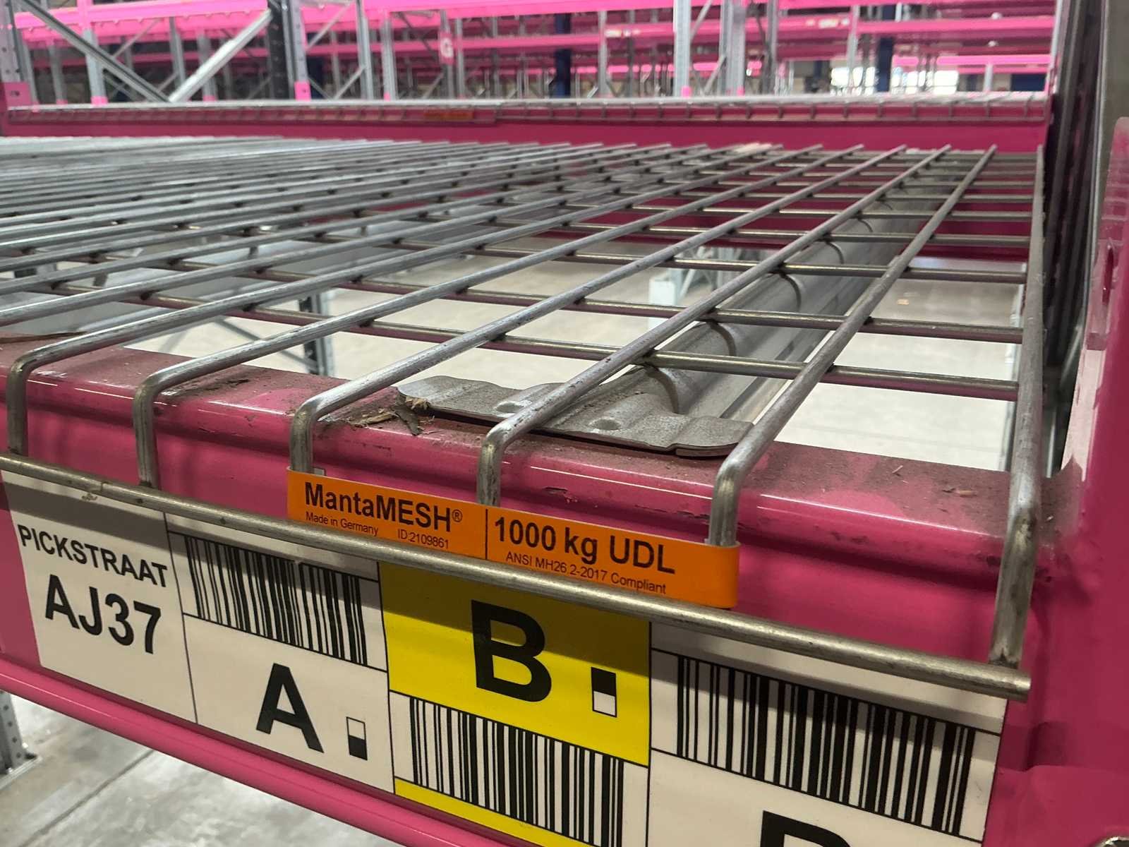 Voorzien van MantaMesh legborden in 750/1000/1250 kg UDL dit kan per sectie verschillen, Ligger type A1240 2225mm (228cm totaal) Elke sectie bestaande uit 3 niveaus (6 liggers + doorvalbeveiliging) Nee Merk: Rosss Type: 90R Bouwjaar: 2021 Aantal secties: 57 Sectie afm. b: 2225mm Sectie diepte: 1100mm Sectie afm. h: 3900mm Aantal staanders: 58 Aantal liggers: 342 Max. sectiebelasting: 9600kg Totale afmeting Breedte: 140cm Totale afmeting Hoogte: 390cm Breedte: 110cm Hoogte: 390cm