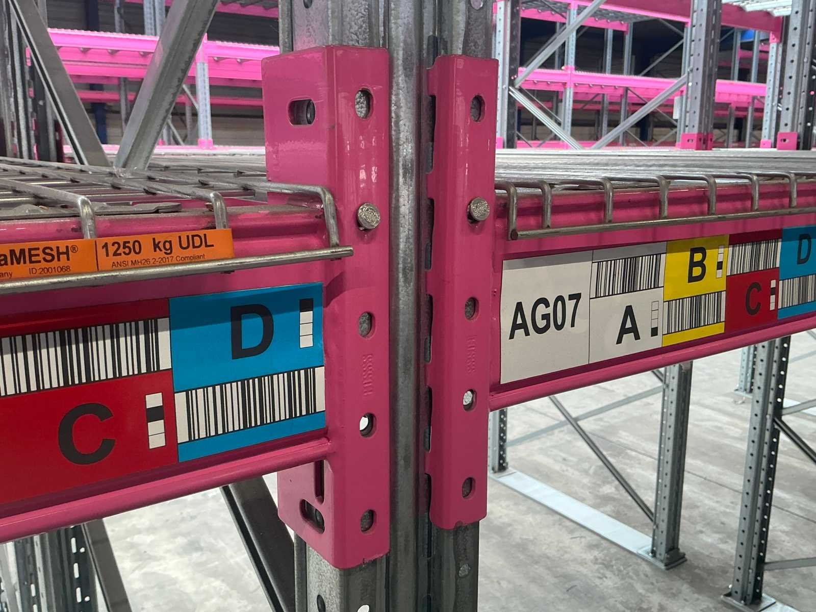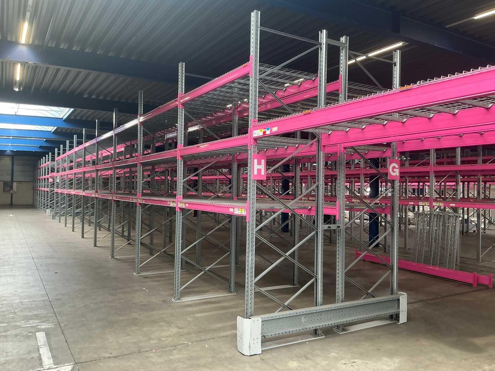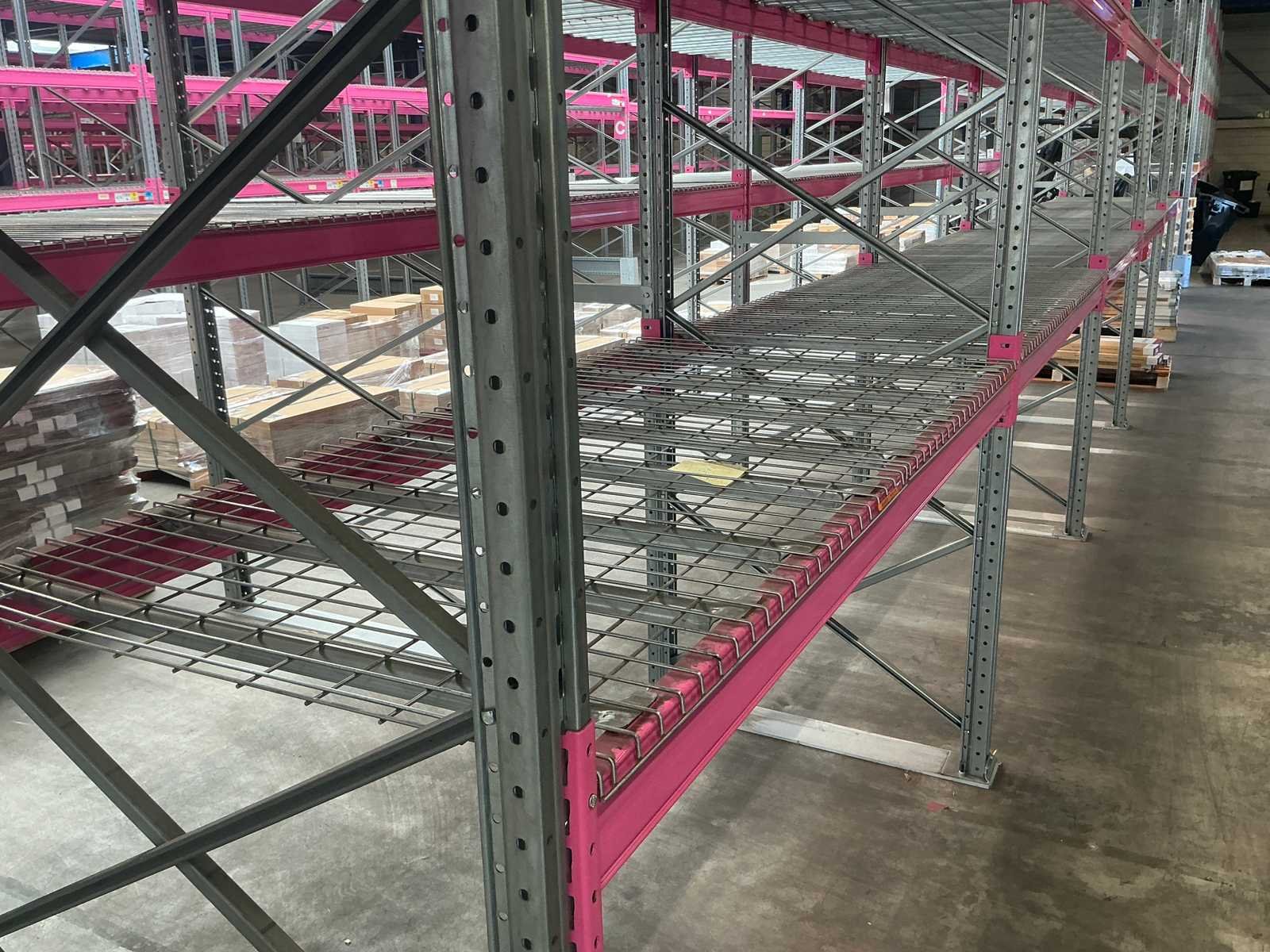 Voorzien van MantaMesh legborden in 750/1000/1250 kg UDL dit kan per sectie verschillen, Ligger type A1240 2225mm (228cm totaal) Elke sectie bestaande uit 3 niveaus (6 liggers + doorvalbeveiliging) Nee Merk: Rosss Type: 90R Bouwjaar: 2021 Aantal secties: 52 Sectie afm. b: 2225mm Sectie diepte: 1100mm Sectie afm. h: 3900mm Aantal staanders: 53 Aantal liggers: 312 Max. sectiebelasting: 9600kg Totale afmeting Breedte: 140cm Totale afmeting Hoogte: 390cm Breedte: 110cm Hoogte: 390cm