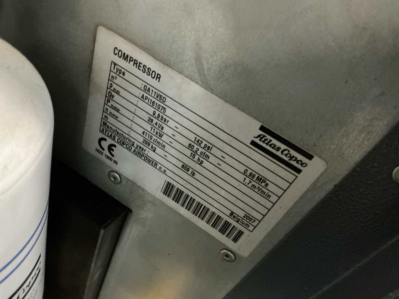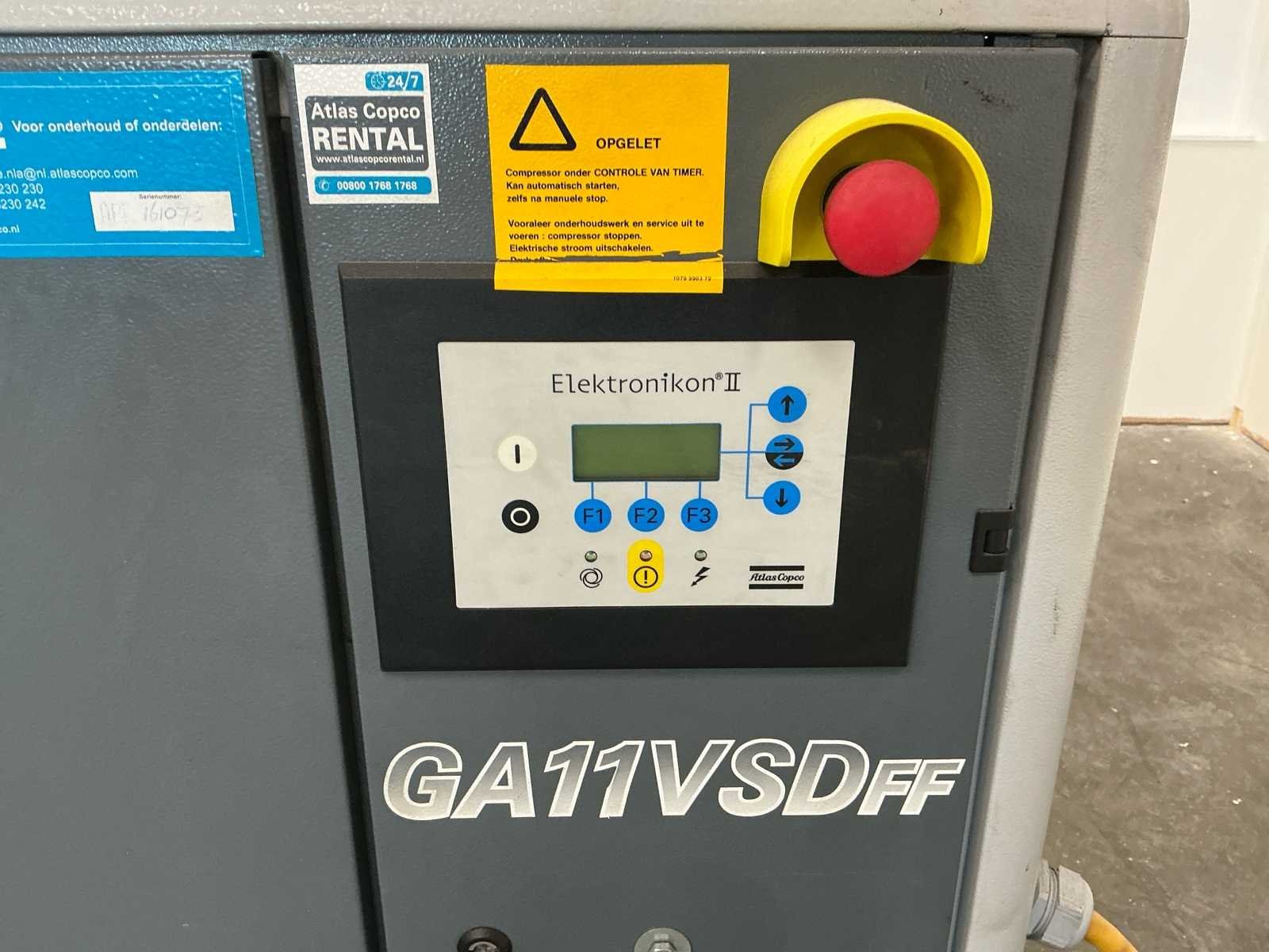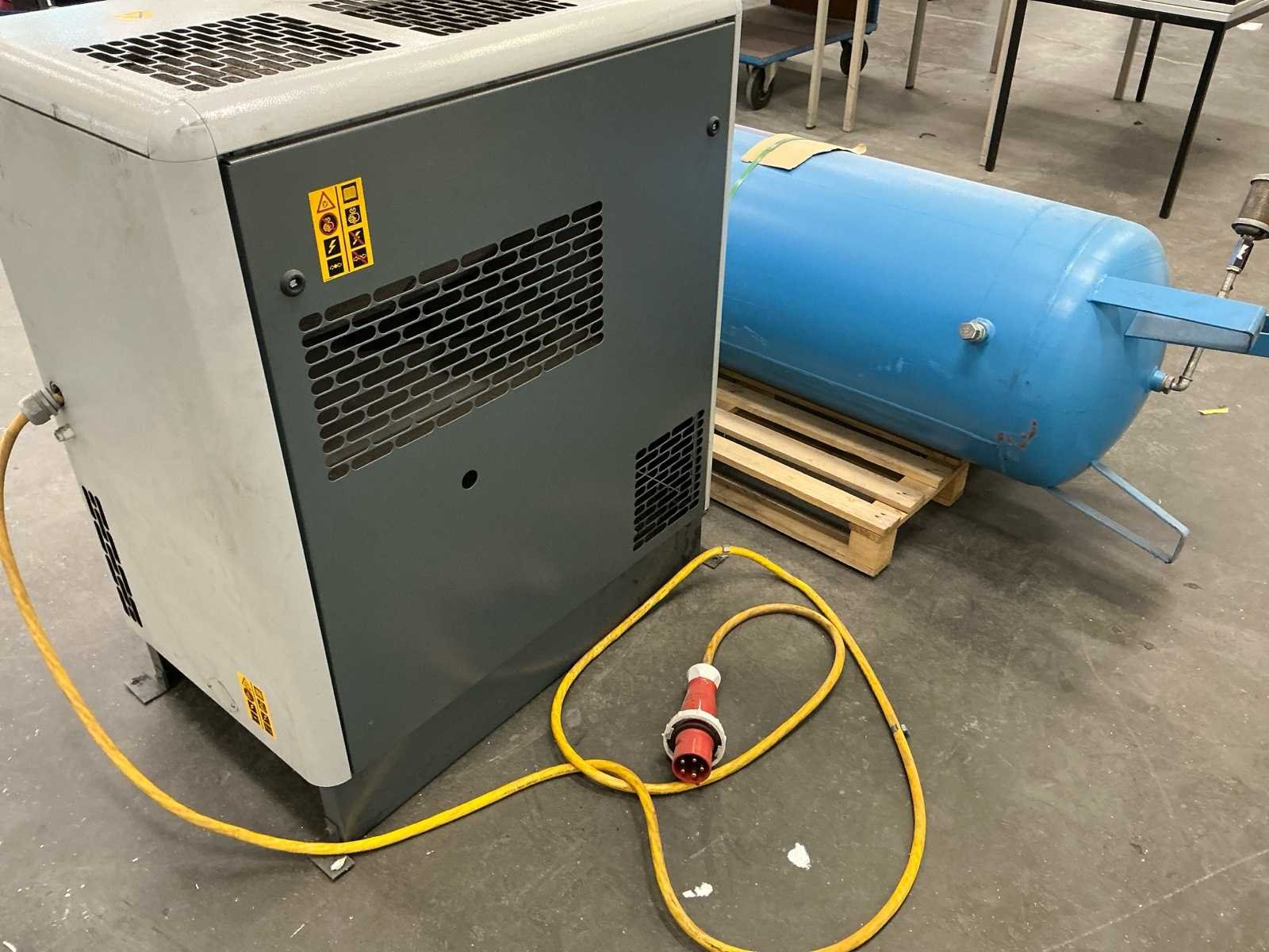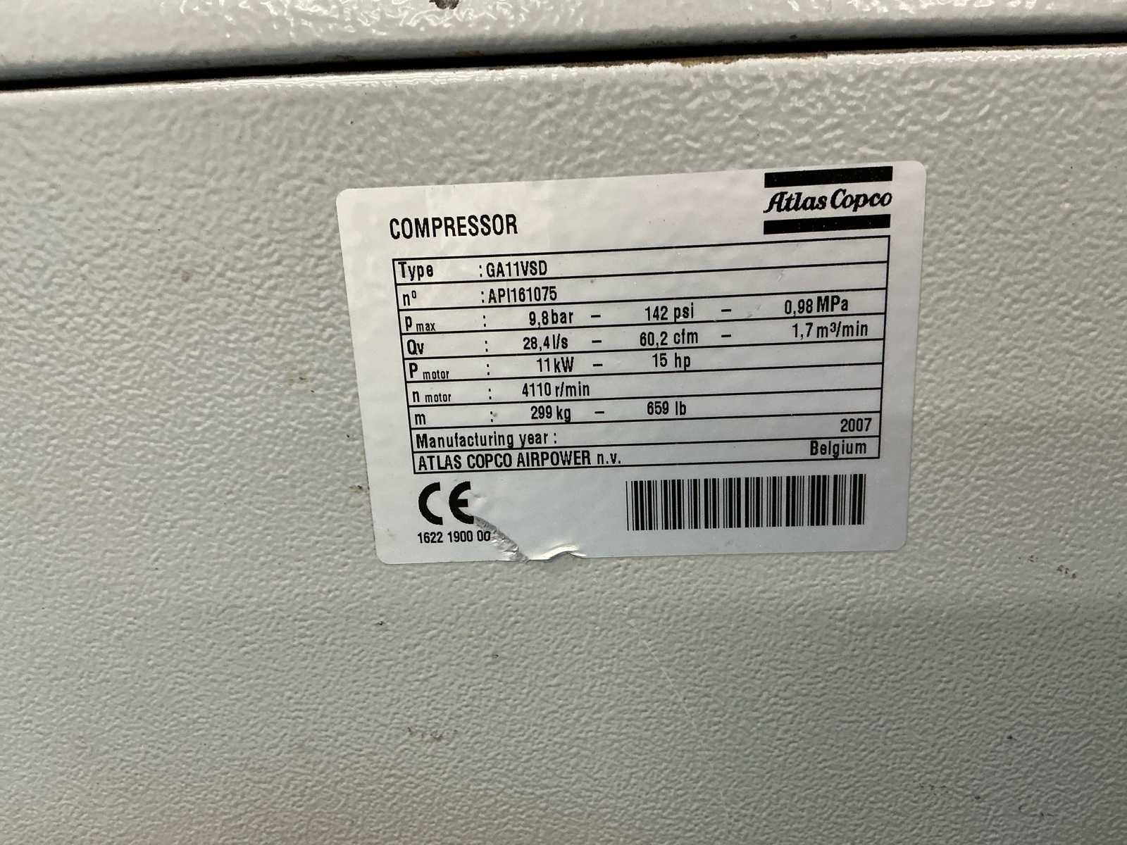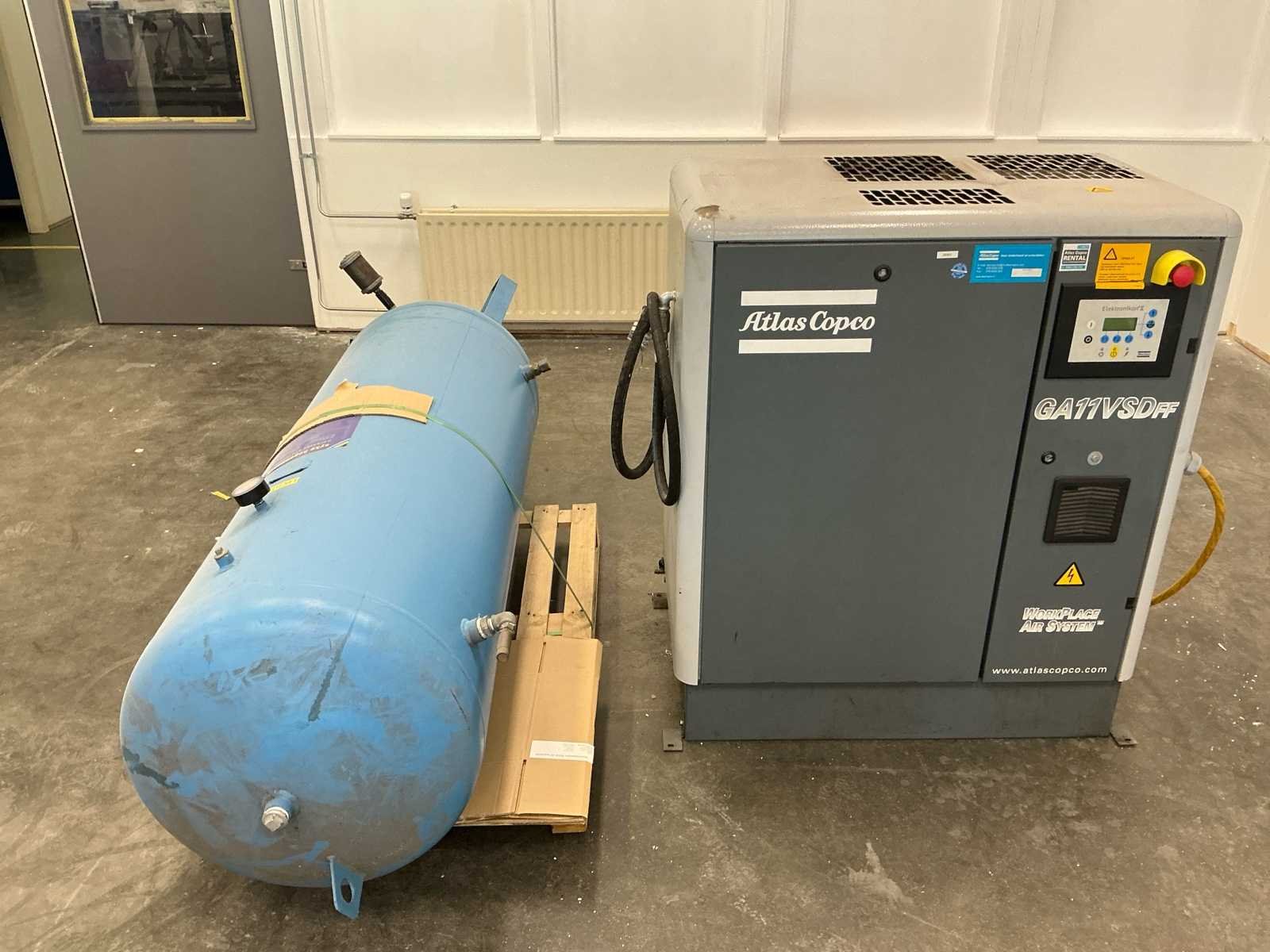 Atlas Copco GA11VSD+FF schroefcompressor Inclusief: 500 liter buffertank Bouwjaar compressor: 2007 Afmeting compressor: 100 x 800 x 600 cm Afmeting staande buffertank: 205 x 60 cm Werkend gedemonteerd, urenstand niet bekend Nee Merk: Atlas Copco Type: GA11VSDff Bouwjaar: 2007 Serienummer: API161075 Capaciteit.: 10bar Vermogen: 11kW Buffertank inhoud: 500l Aansluiting: 380V Totale afmeting L: 600mm Totale afmeting Breedte: 800mm Totale afmeting Hoogte: 1000mm