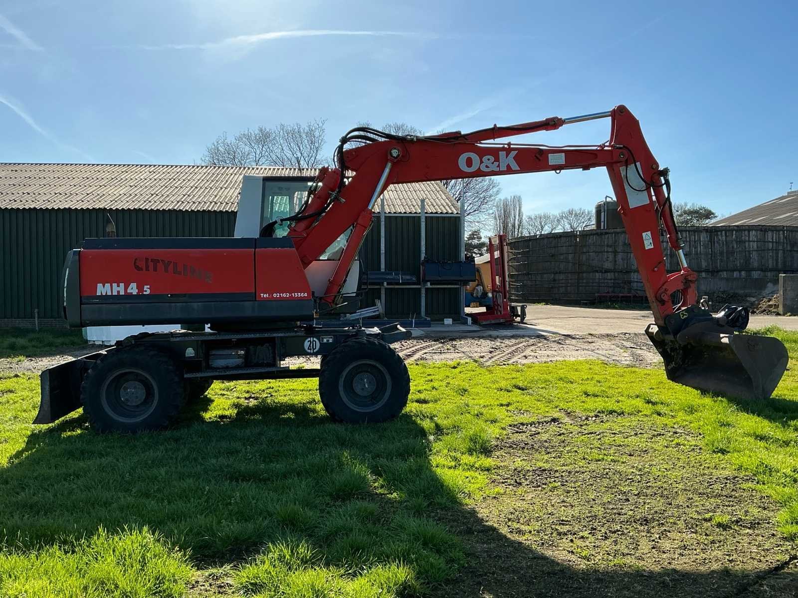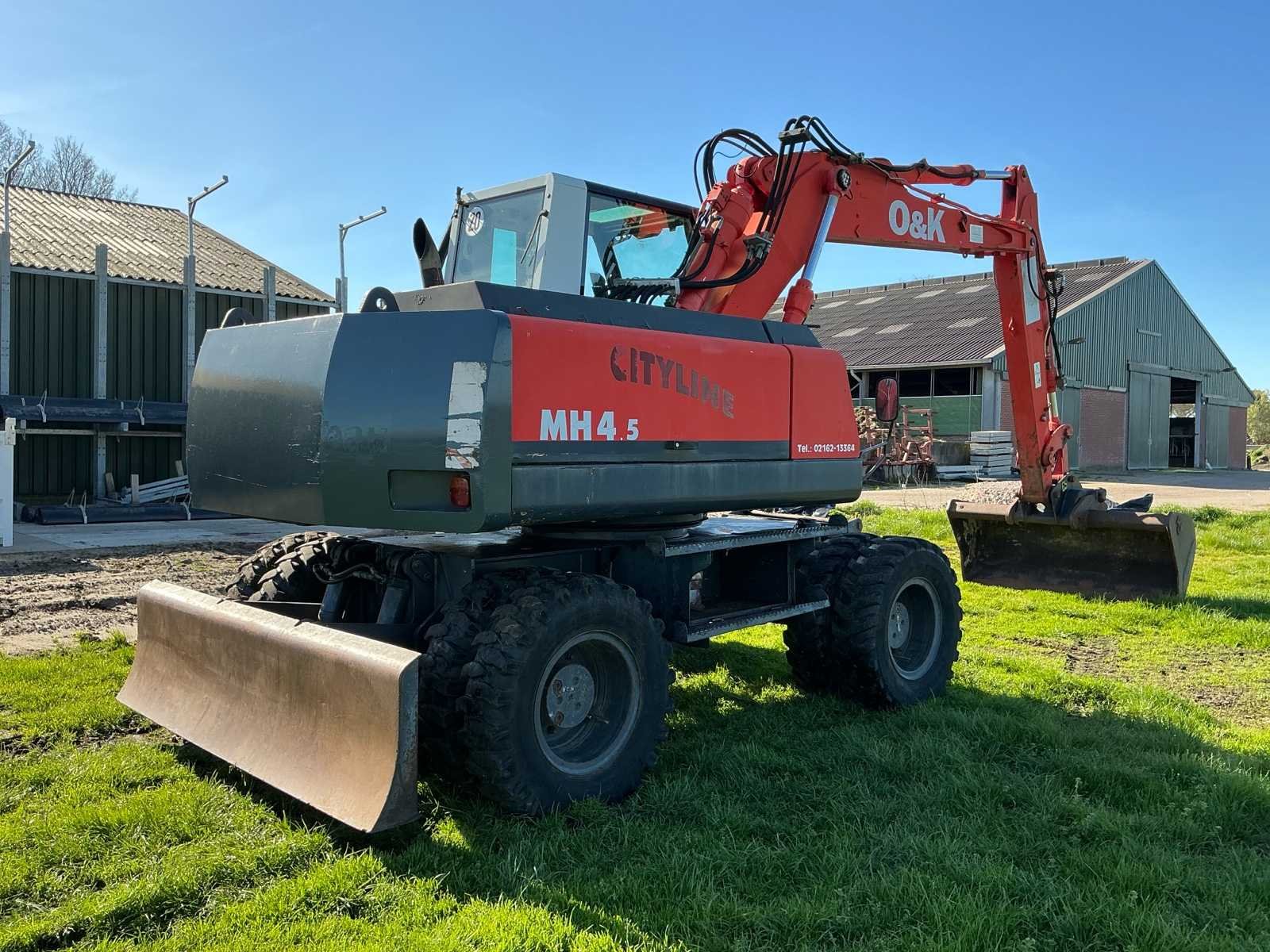 Voorzien van: stelgiek, hydraulische snelwissel (Eurosteel HCWG2), 4x4 aandrijving, extra hydraulische functie op giek, luchtgeveerde stoel, schuifblad, 6 cilinder Deutz dieselmotor, graafbak, werkverlichting, opbergvak zijkant Nee Merk: O&K Type: MH4.5 Bouwjaar: 2001 Serienummer: 297870 Merk motor: Deutz Motorvermogen (kW): 61kW Aantal cilinders: 6 Brandstof: Diesel Bedrijfsgewicht: 13500kg Met graafbak: true Graafbak afm. l: 100mm Graafbak afm. b: 200mm Graafbak afm. h: 600mm Bandenmaat: 10.00-20 SKL800 Cabine: true Afgelezen urenstand: 10272 Eigen gewicht: 13500kg Totale afmeting L: 8400mm Totale afmeting Breedte: 2500mm Totale afmeting Hoogte: 3200mm
