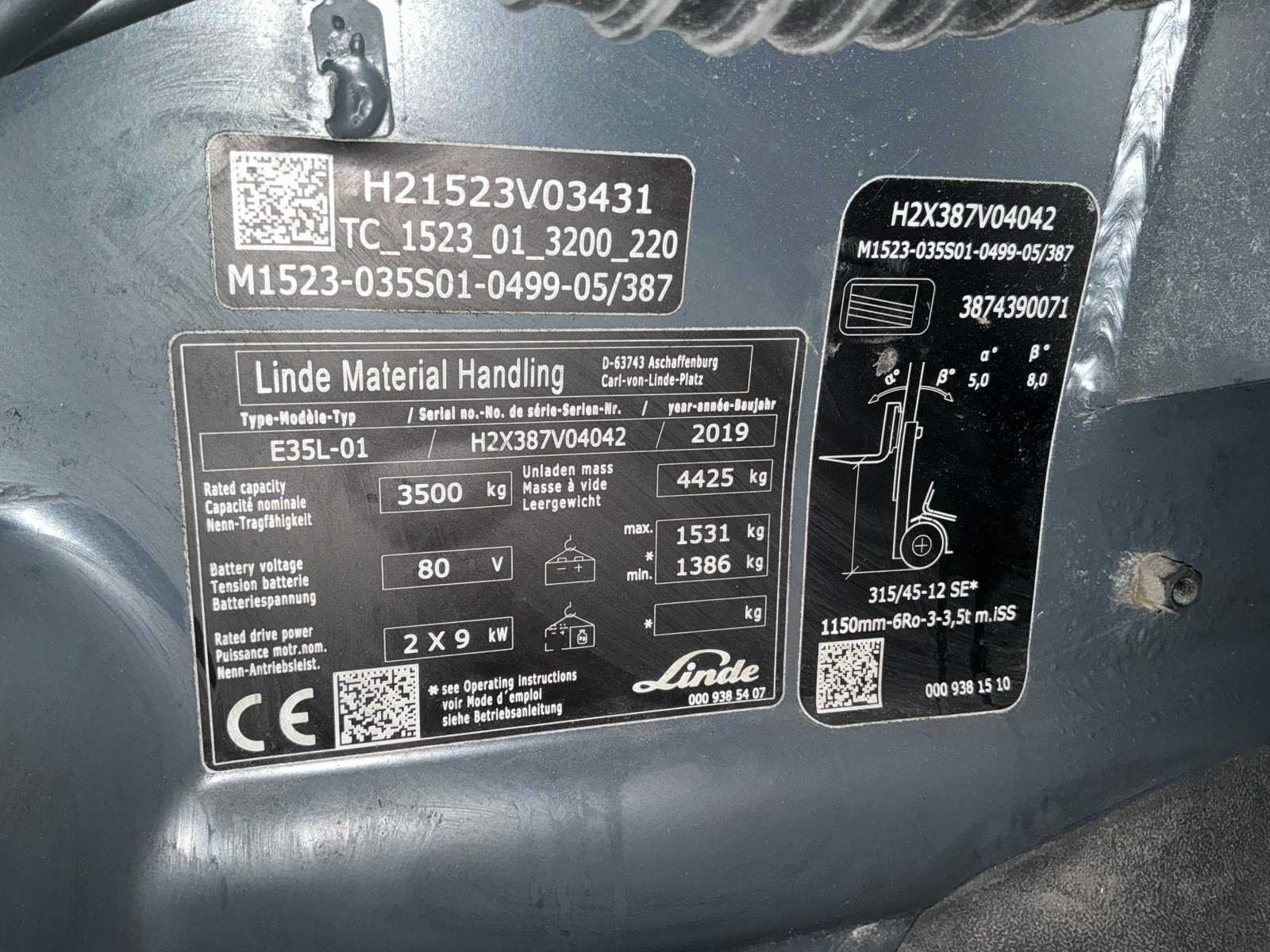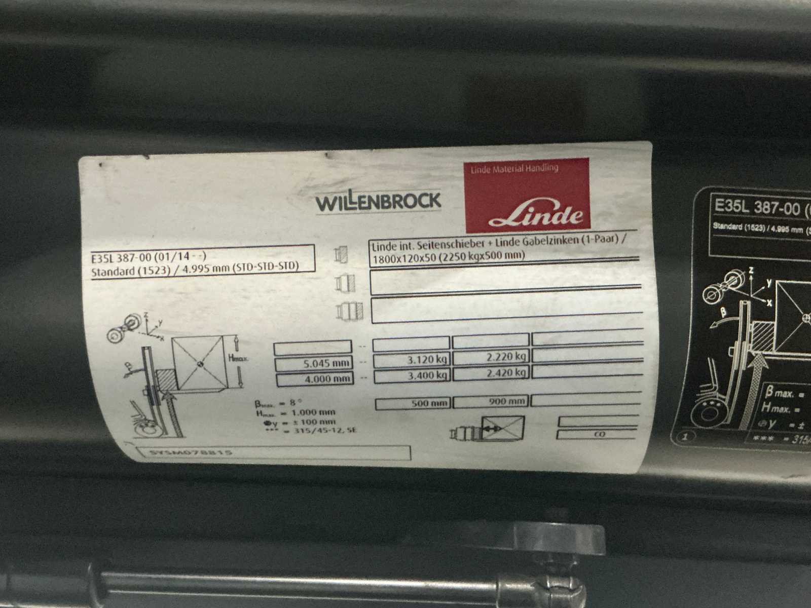 Nee Merk: Linde Type: E35L-01 Bouwjaar: 2019 Serienummer: H2X387V04042 Brandstof: Elektrisch Mast: Duplex Soort band: Volrubber banden Aantal wielen: 4 Afgelezen urenstand: 3212 Side-shift: true Duplex mast: true Eigen gewicht: 5800kg Hefvermogen: 3500kg Lepellengte: 1800mm Max. hefhoogte: 5045mm Vol rubber banden: true Totale afmeting L: 3700mm Totale afmeting Breedte: 1300mm Totale afmeting Hoogte: 3100mm