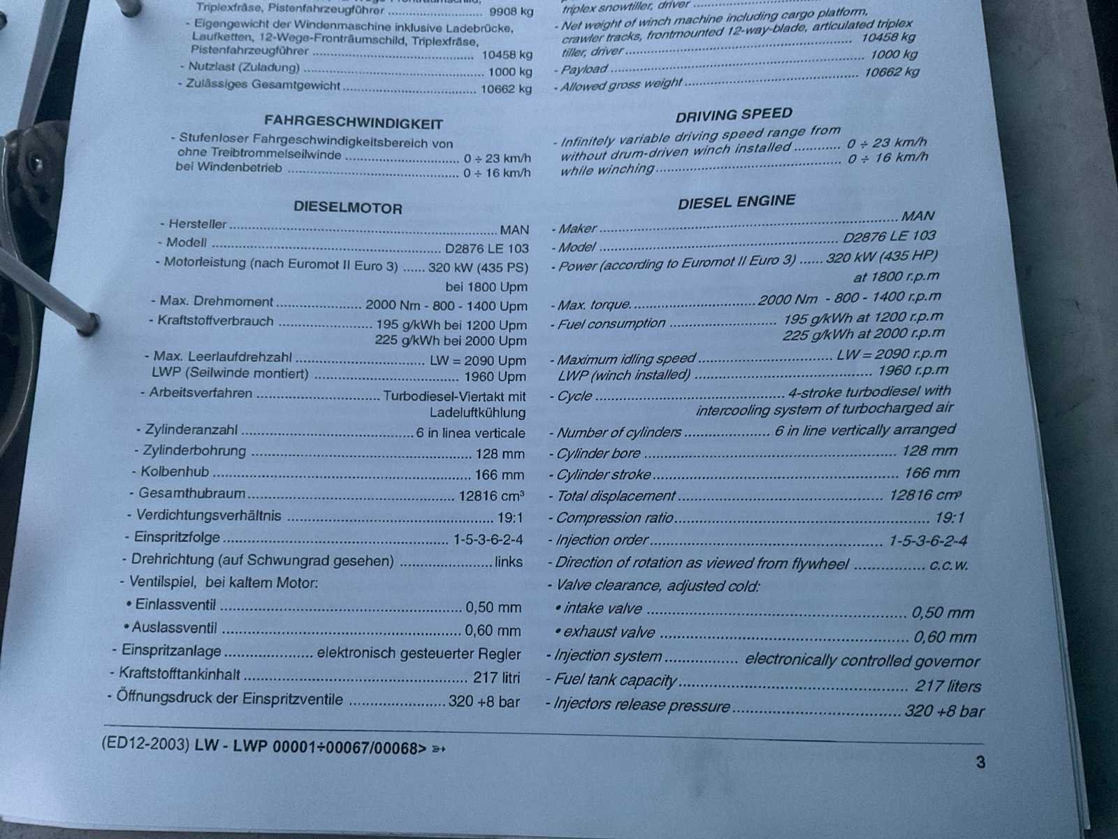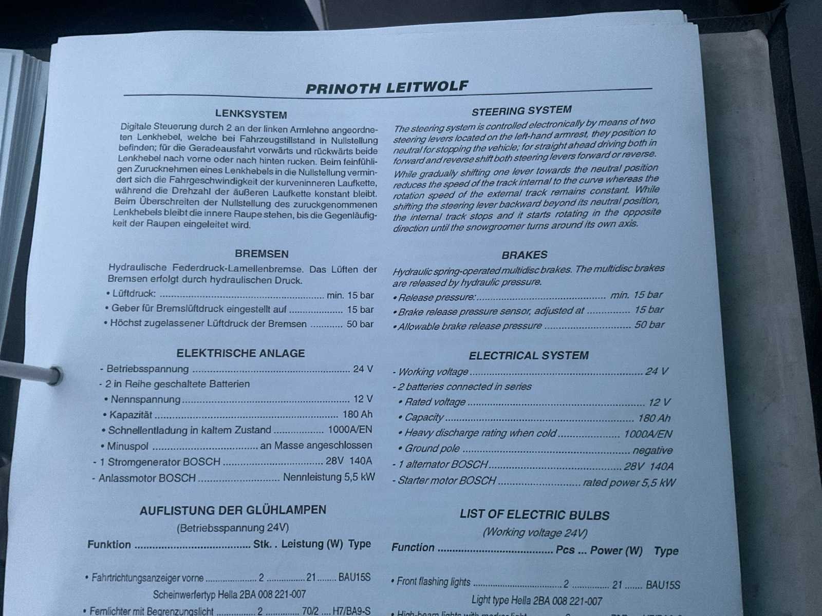 Kilometerstand: km, rupsbreedte: 1720mm, voorzien van: Leitwolf Sneeuwfrees (4400mm), schuif voorzijde (uitklapbaar tot 5300mm), hefinrichting voor, hefinrichting achter, 3-persoons cabine, automatische rupsenspanner, hydraulische functies op achterzijde, MAN D2876 LE 103 6-cilinder turbo dieselmotor, digitaal display, (urenstand niet afleesbaar, versprongen naar 0, geschatte urenstand: 6000), Nee Merk: Leitwolf Type: Prinoth S-W1200m Bouwjaar: 2003 Serienummer: LWP00031 Motorvermogen (kW): 320kW Versnellingsbaktype: Hydrostaat Fronthefinrichting: true Cabine: true Totale afmeting L: 6550mm Totale afmeting Breedte: 4350mm Totale afmeting Hoogte: 2750mm