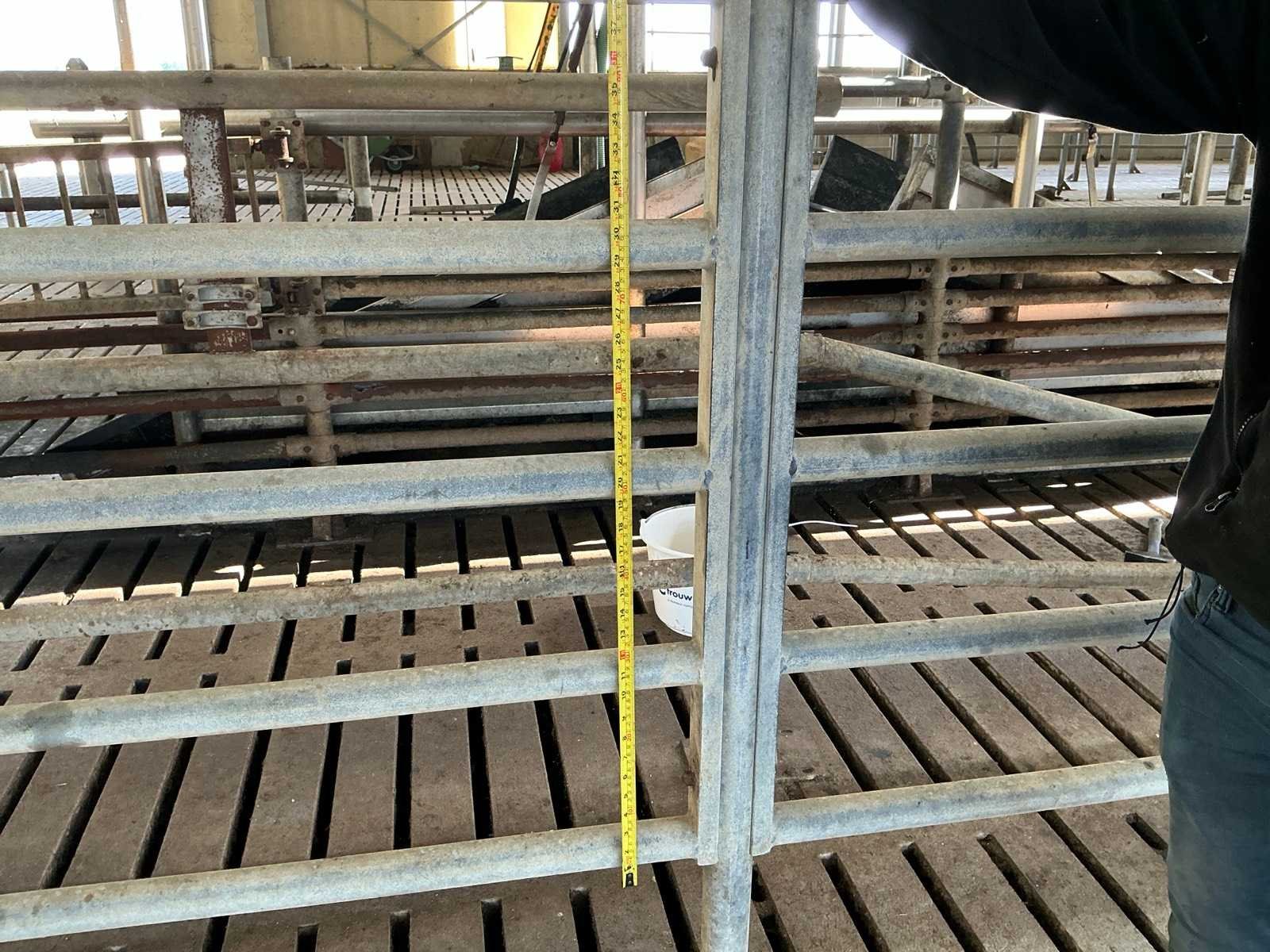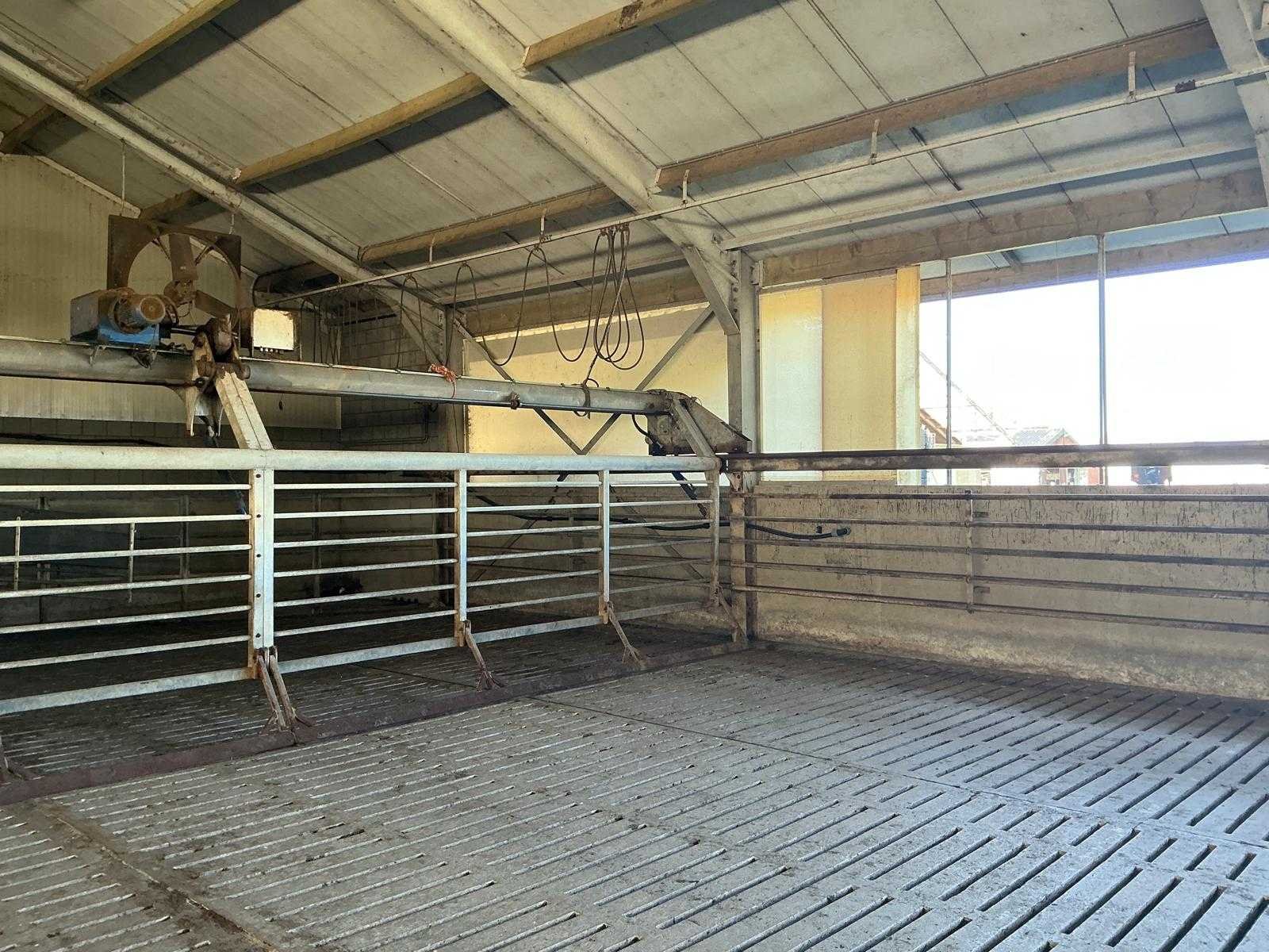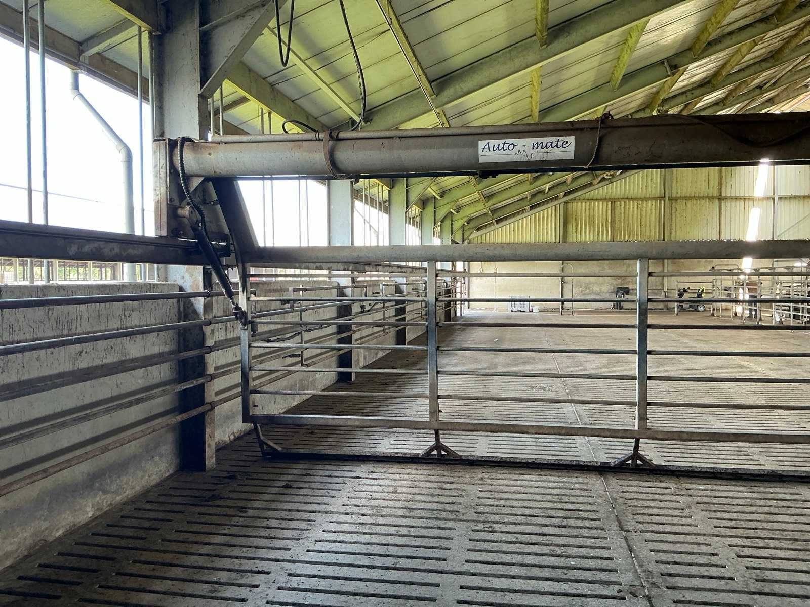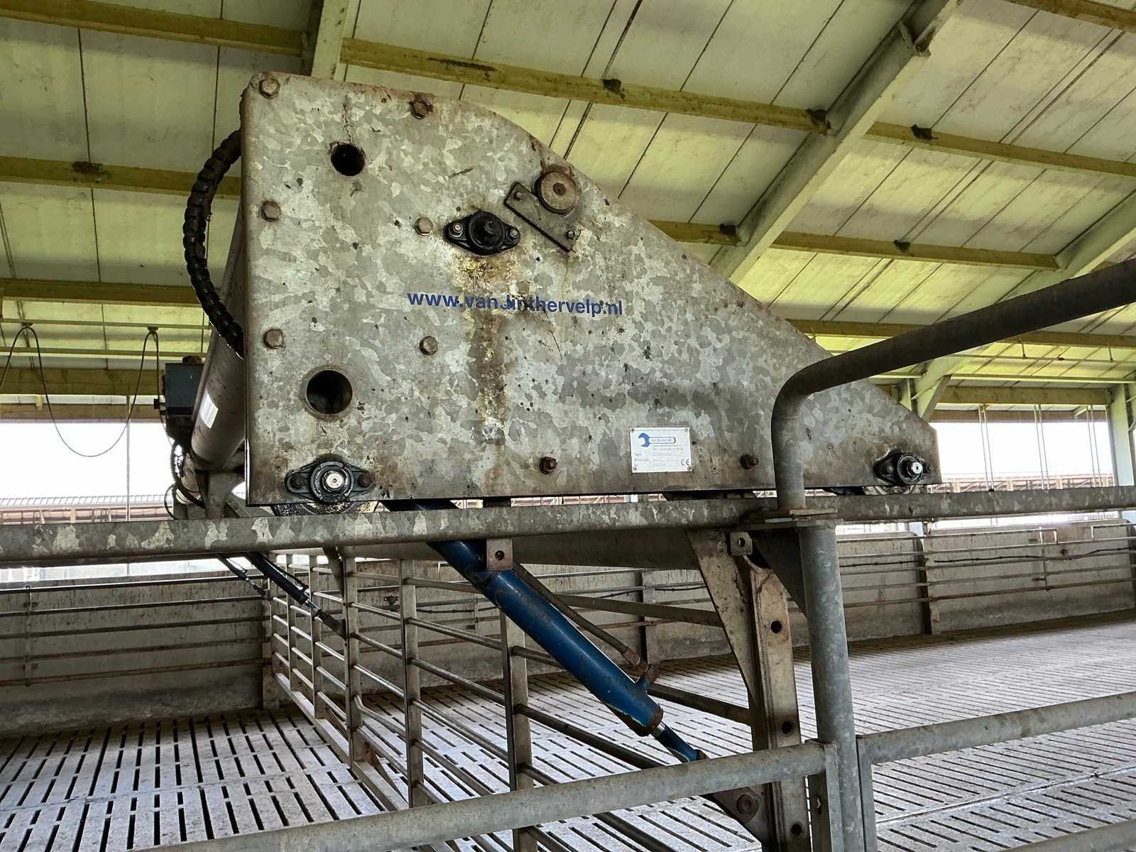 Bestaat uit: opdrijfhek 10200 breed, hoogte 1900mm, rubber strip onderzijde voor mestafvoer, elektrisch aangedreven, hoogte railbaan 1960mm, een zijde op gegalvaniseerde poten met schetsplaat, een zijde montage aan spanten, doorloop hoogte onder rek omhoog 2000mm, 2 bedienings kasten, sectie hekken op poten 1500mm h.o.h., totaal lengte 36200mm, reeds gedemonteerd, Nee Merk: Van Dinther Type: Opdrijfhek auto-mate Bouwjaar: 2011