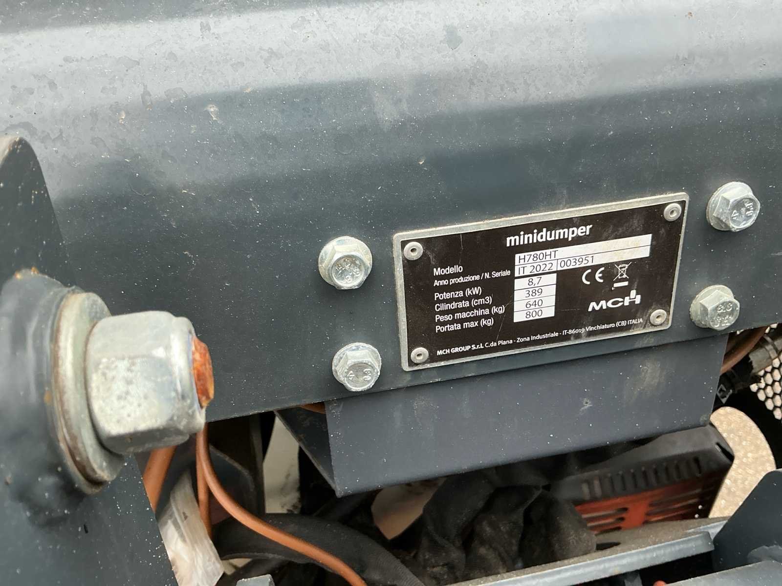 Voorzien van: noodstop, bedieningspaneel, externe brandstoftank, rupsband maat 18 cm, hydraulische kiepbak, schep, hoogkieper, Nee Merk: MCH Type: H780HT Serienummer: IT2022003951 Bouwjaar: 2022 Merk motor: Honda GX 390 Brandstof: Benzine Bedrijfsgewicht: 640kg Laadvermogen: 800kg Totale afmeting L: 1850mm Totale afmeting Breedte: 820mm Totale afmeting Hoogte: 1550mm