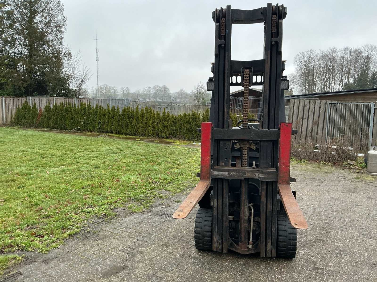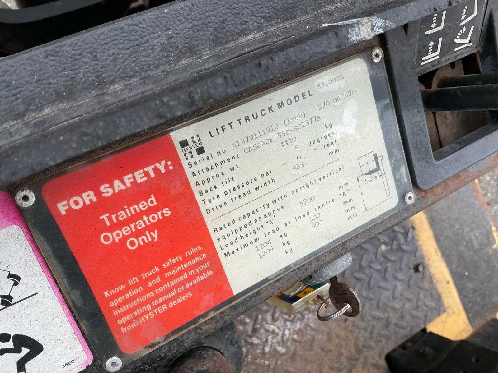 Voorzien van: werkverlichting, derde functie Nee Merk: Hyster Type: S3.00XL Bouwjaar: 1988 Serienummer: A187V1119IJ Brandstof: Lpg Mast: Triplex Soort band: Volrubber Aantal wielen: 4 Afgelezen urenstand: 3322 Free-lift: true Triple mast: true Eigen gewicht: 4440kg Hefvermogen: 1204kg Lepellengte: 1060mm Max. hefhoogte: 5700mm Vol rubber banden: true Minimale doorrijhoogte: 2600mm Totale afmeting L: 3360mm Totale afmeting Breedte: 1030mm Totale afmeting Hoogte: 2600mm LPG: true