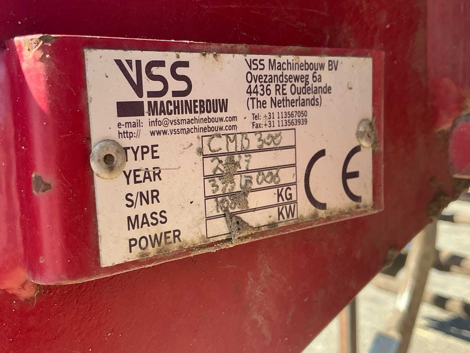 Nee Merk: VSS Type: CMB 300 Bouwjaar: 2017 Serienummer: 333170l6 Werkbreedte: 3000mm Werkdiepte: 400mm Eigen gewicht: 1085kg Totale afmeting L: 3350mm Totale afmeting Breedte: 2500mm Totale afmeting Hoogte: 1500mm
