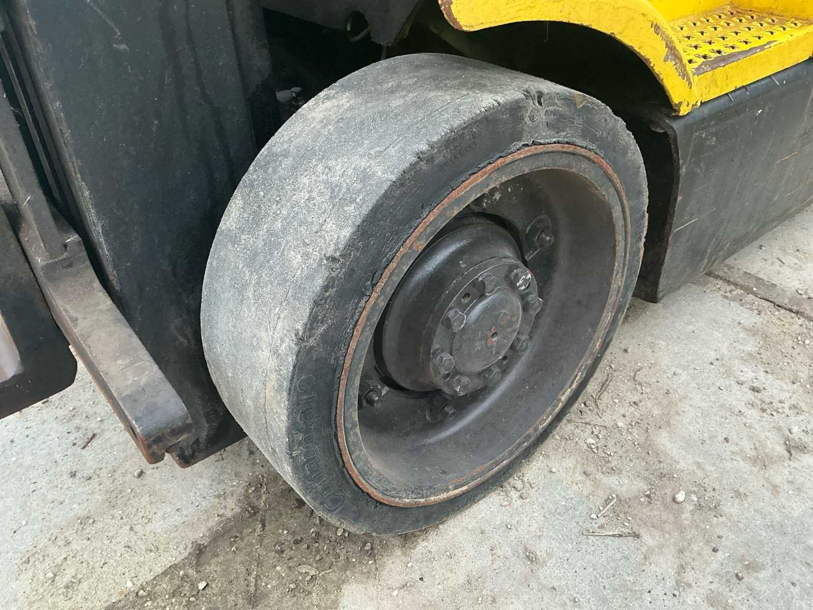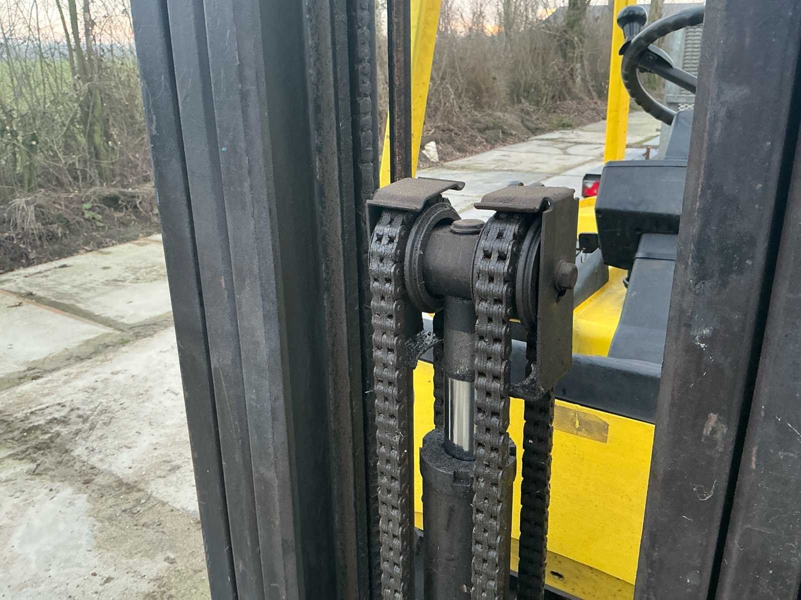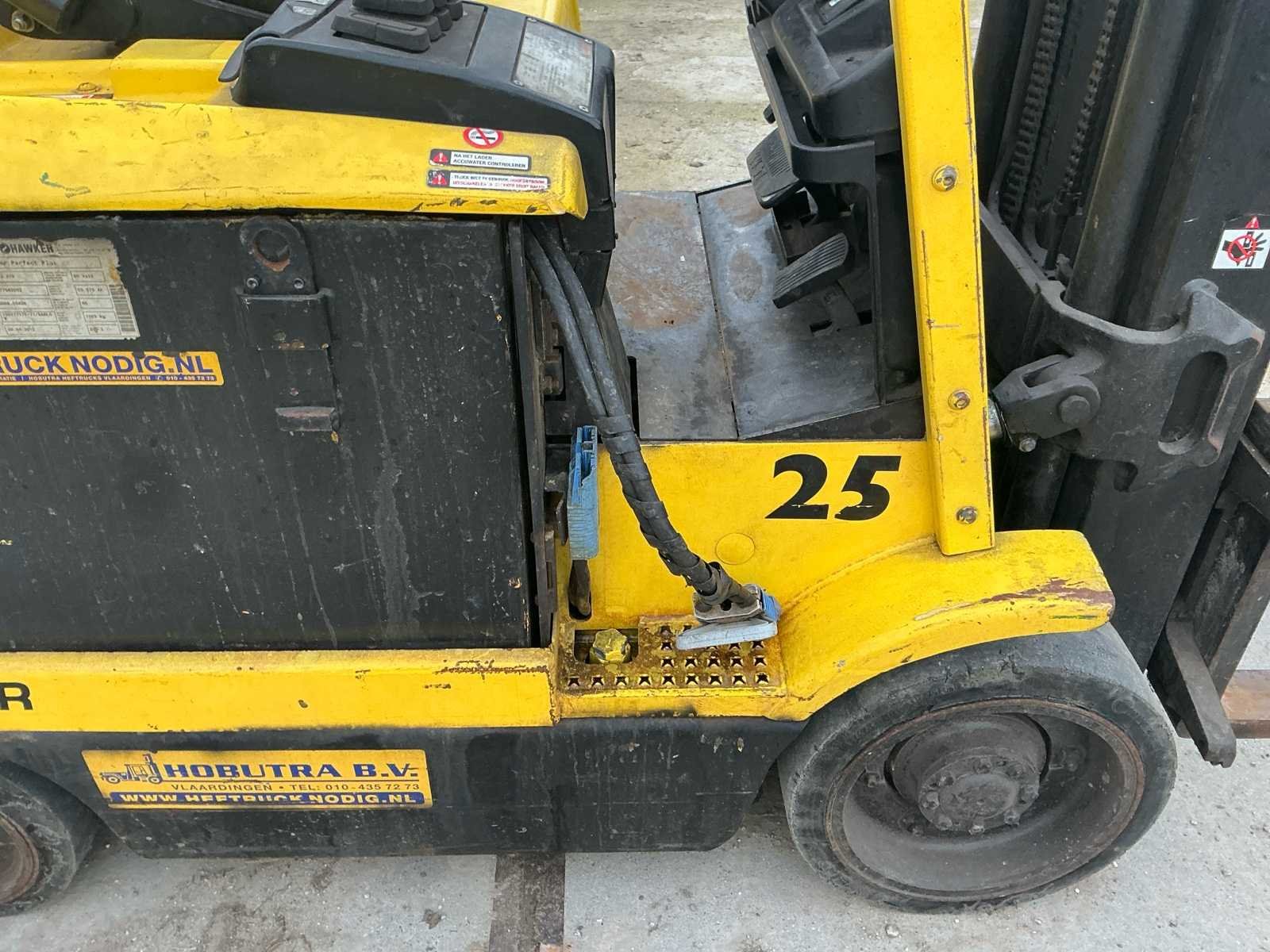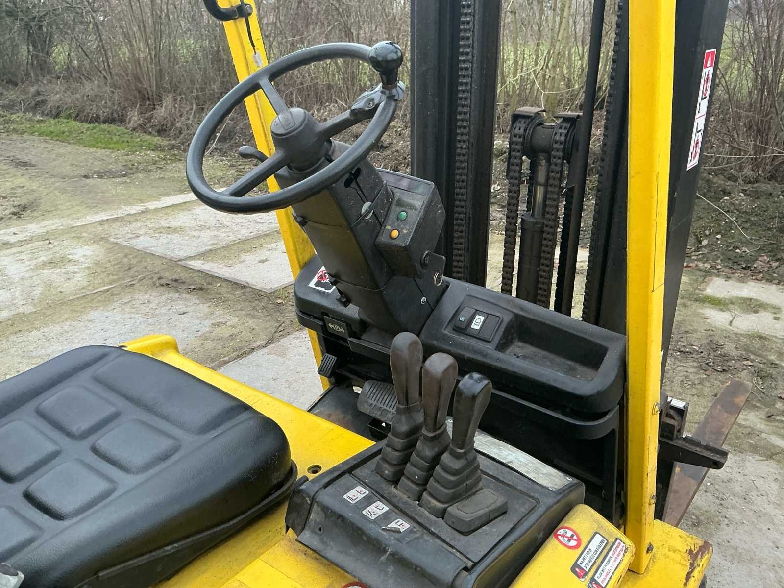 Voorzien van: accu lader, verstelbare stuurkolom, trekhaak, werklamp, Nee Merk: Hyster Type: E2.50XM Bouwjaar: 1998 Serienummer: F108AO3408V Brandstof: Elektrisch Mast: Triplex Soort band: Volrubber Aantal wielen: 4 Duplex mast: false Triple mast: true Eigen gewicht: 4905kg Hefvermogen: 1769kg Lepellengte: 1200mm Vol rubber banden: true Minimale doorrijhoogte: 2400mm Totale afmeting L: 3300mm Totale afmeting Breedte: 1100mm Totale afmeting Hoogte: 2400mm