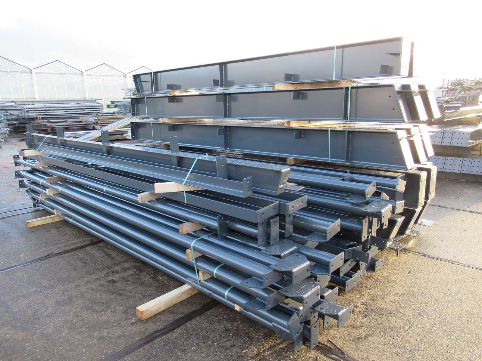 Nederlandse productie; vrije overspanning; spanten h.o.h. 5000mm; staalberekeningen; staaltekeningen; montagetekeningen; ankerplan; staal genummerd volgens montageplan; dakhelling 20 graden; 11 sets tussenspanten IPE360/300; 2 sets eindspanten IPE 200/180 met windstijlen waarvan 1 set voorzien is van een deursparing; voorzien van drukkokers; windverbanden; gordinglippen; bouten en moeren; meestort ankers; staalconstructie volgens productnorm EN1090 (Certificaat na aankoop verkrijgbaar); kavel ligt netjes transportklaar en dient met 2 trailers opgehaald te worden; kavel wordt gratis met een heftruck geladen No Materiaal: Gepoedercoat staal antraciet Bouwjaar: 2026 Totaal oppervlakte: 1500m² Nok hoogte: 9550mm Goot hoogte: 5000mm Totale afmeting L: 60000mm Totale afmeting Breedte: 25000mm