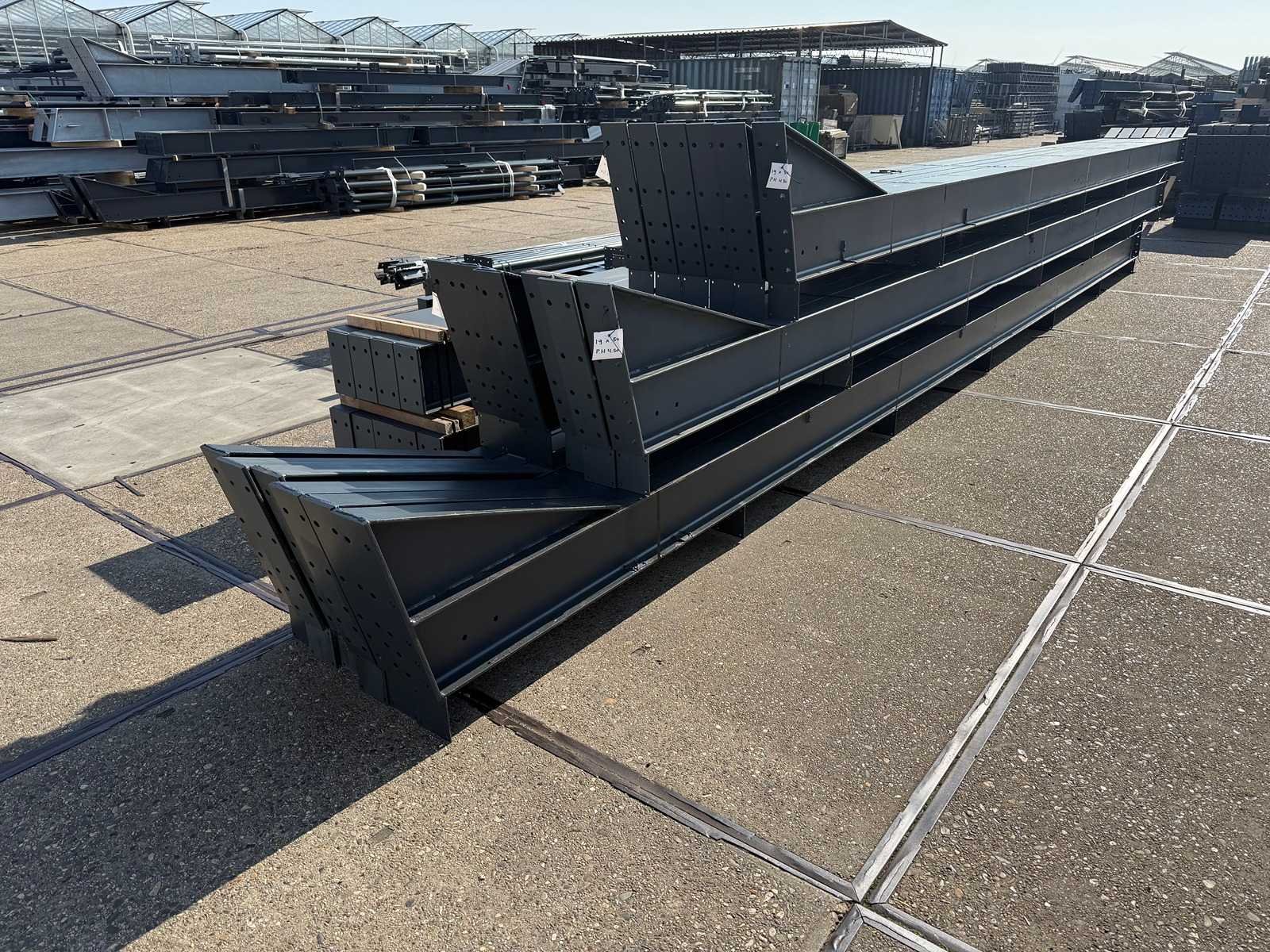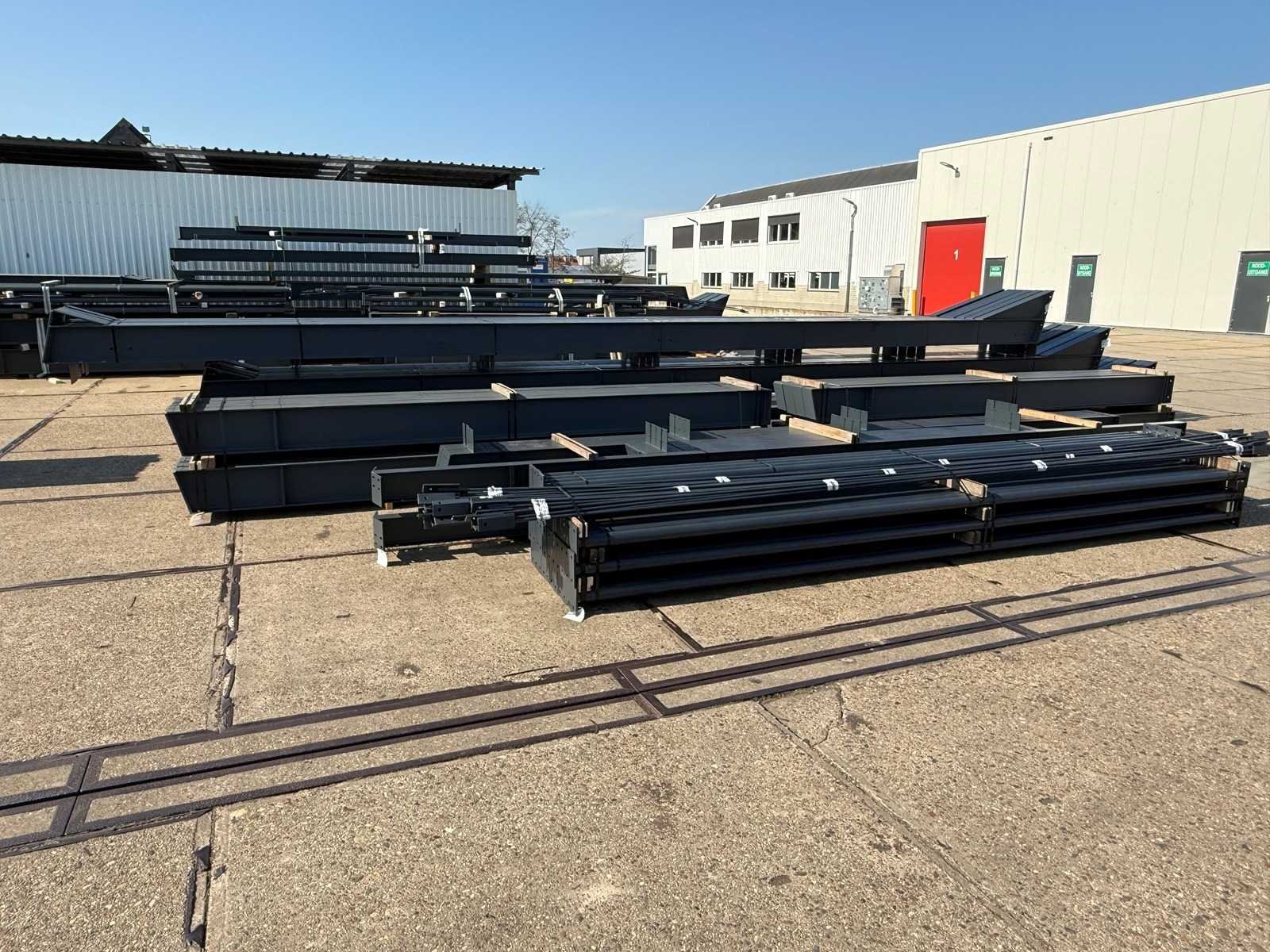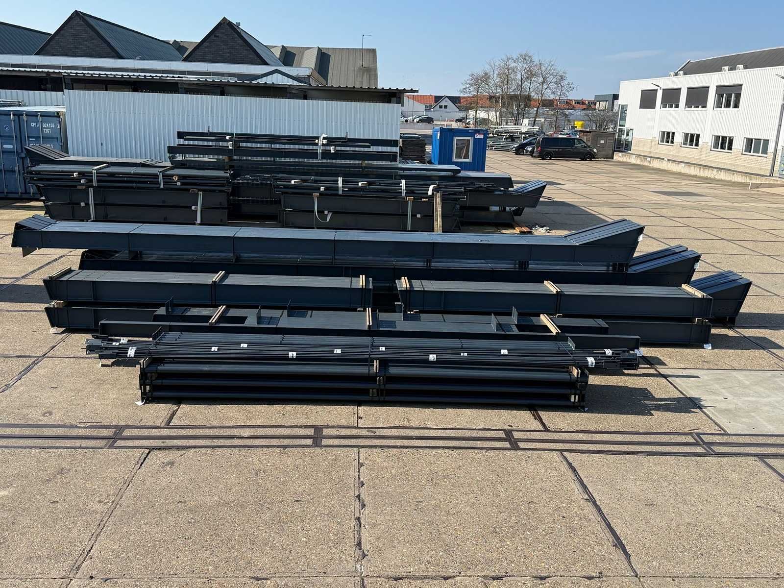 Vrije overspanning; spanten h.o.h. 5000mm; dakhelling 15 graden; 9 sets tussenspanten IPE300/270; 2 sets eindspanten IPE180 met windstijlen; staaltekening; 3D-tekening; voorzien van drukkokers; windverbanden; kruisschoren; gordinglippen op de spanten; kavel ligt netjes transportklaar en dient met 1 trailer opgehaald te worden; kavel wordt gratis met een heftruck geladen No Materiaal: Geschilderd staal antraciet Totaal oppervlakte: 950m² Nok hoogte: 7000mm Goot hoogte: 4500mm Totale afmeting L: 50000mm Totale afmeting Breedte: 19000mm
