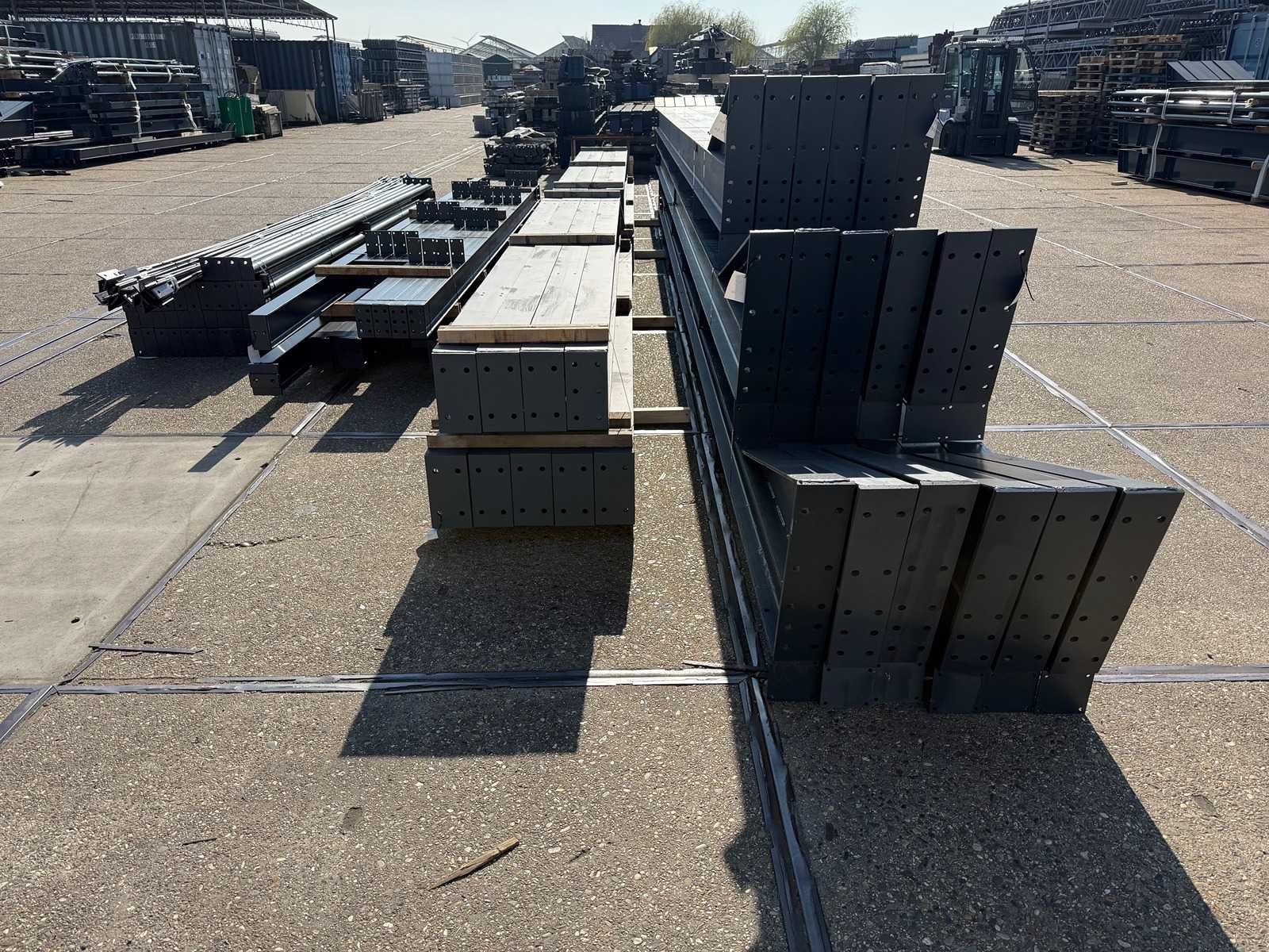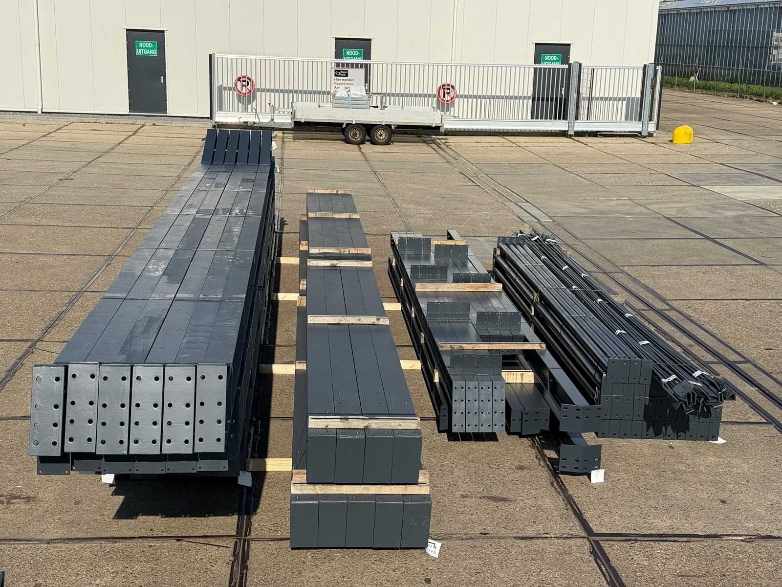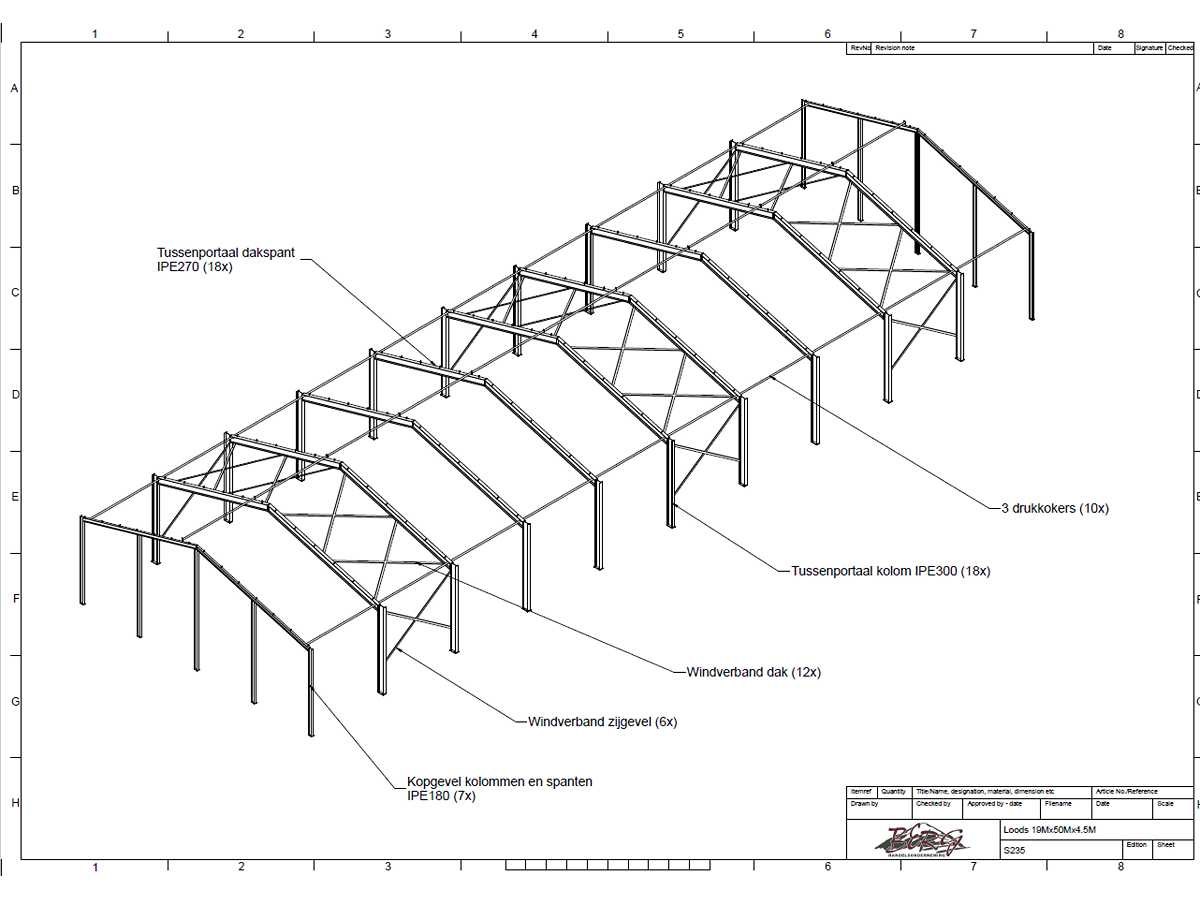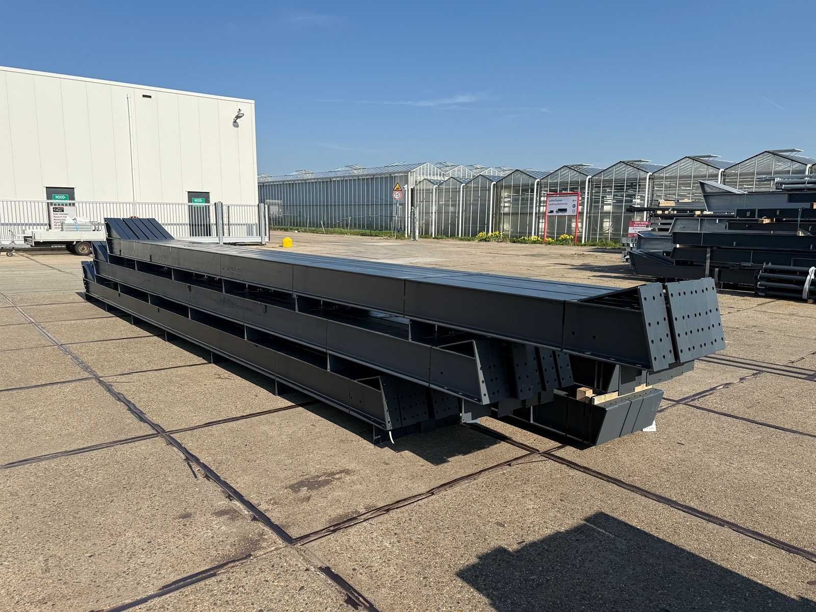 Vrije overspanning; spanten h.o.h. 5000mm; dakhelling 15 graden; 9 sets tussenspanten IPE300/270; 2 sets eindspanten IPE180 met windstijlen; staaltekening; 3D-tekening; voorzien van drukkokers; windverbanden; kruisschoren; gordinglippen op de spanten; kavel ligt netjes transportklaar en dient met 1 trailer opgehaald te worden; kavel wordt gratis met een heftruck geladen No Materiaal: Geschilderd staal antraciet Totaal oppervlakte: 950m² Nok hoogte: 7000mm Goot hoogte: 4500mm Totale afmeting L: 50000mm Totale afmeting Breedte: 19000mm