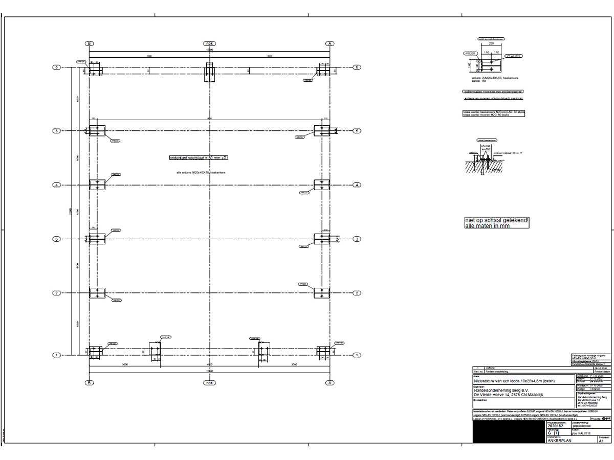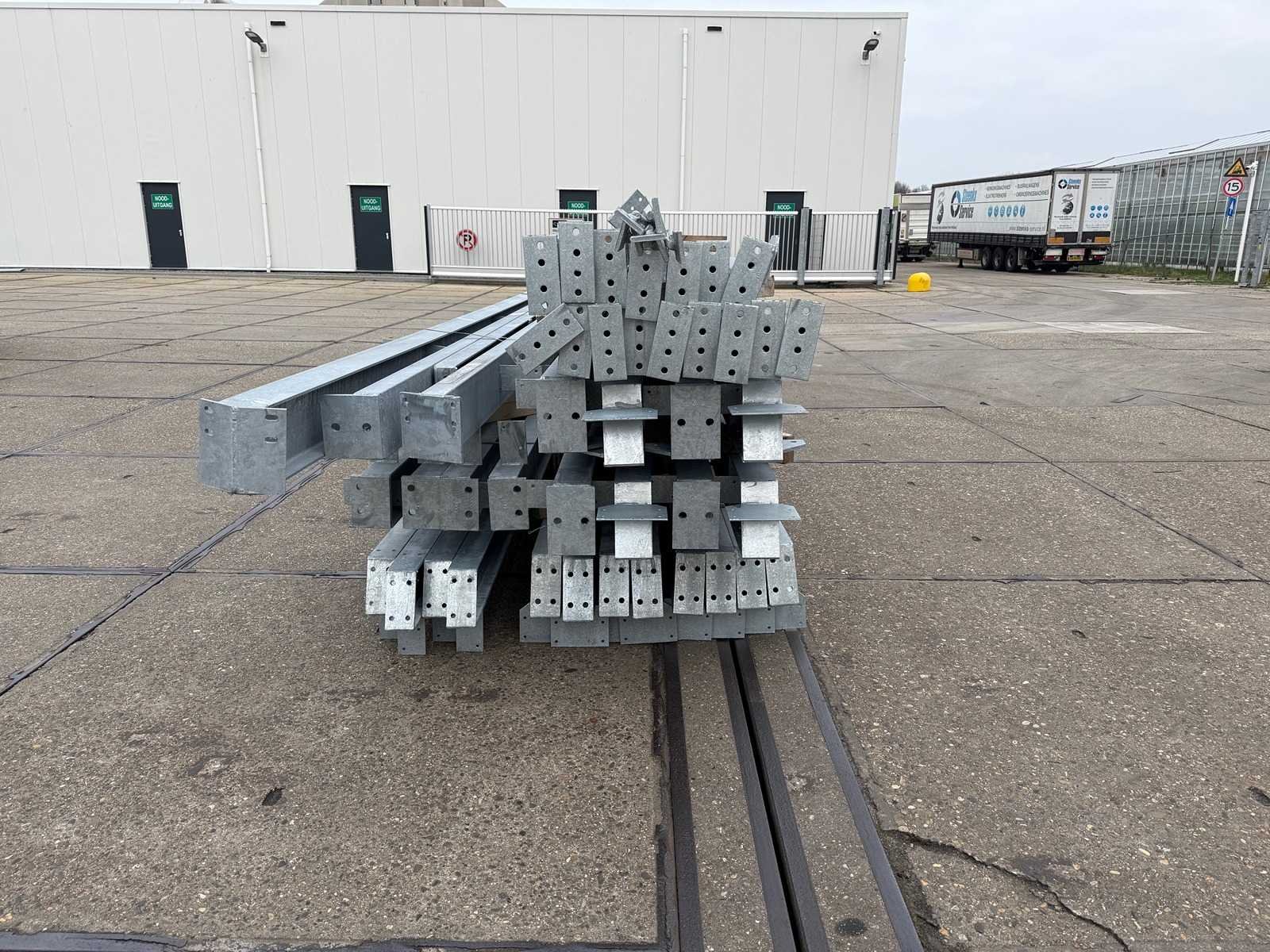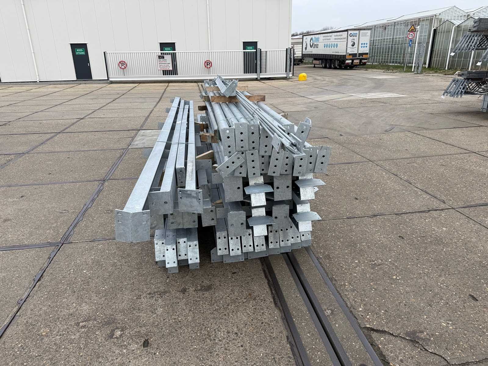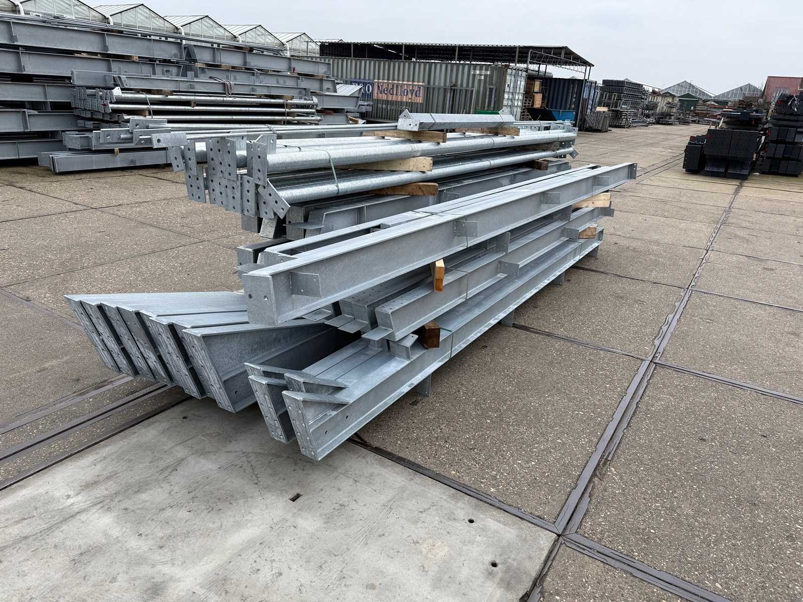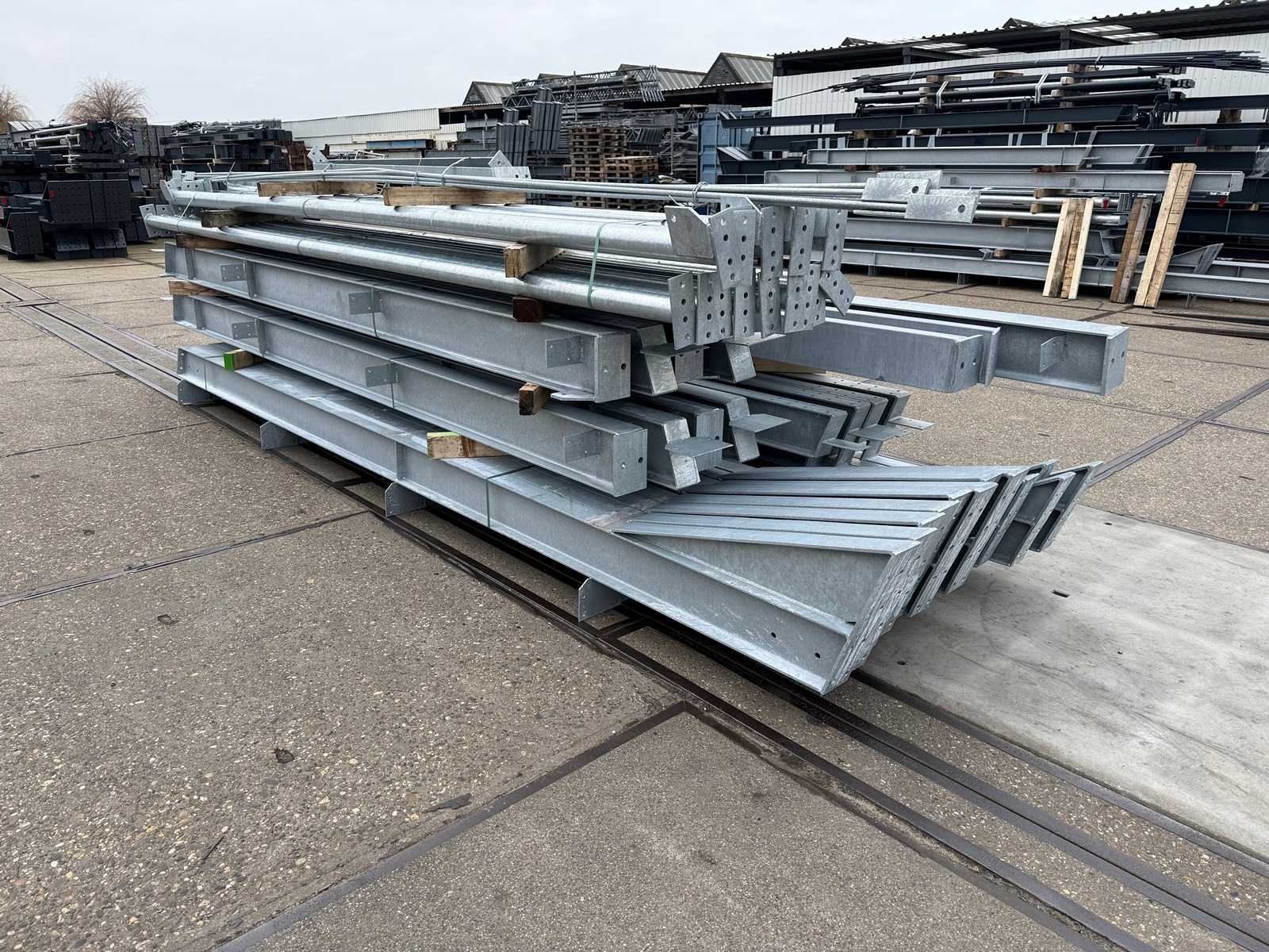 Nederlandse productie; vrije overspanning; spanten h.o.h. 5000mm; staalberekeningen; staaltekeningen; montagetekeningen; ankerplan; staal genummerd volgens montageplan; dakhelling 20 graden; 4 sets tussenspanten IPE 220/200; 2 sets eindspanten IPE 180 met windstijlen waarvan 1 set voorzien is van een deursparing; voorzien van drukkokers; windverbanden; gordinglippen; bouten en moeren; meestort ankers; staalconstructie volgens productnorm EN1090 (Certificaat na aankoop verkrijgbaar); kavel ligt netjes transportklaar en dient met 1 trailer opgehaald te worden; kavel wordt gratis met een heftruck geladen No Materiaal: Thermisch verzinkt staal Bouwjaar: 2026 Totaal oppervlakte: 250m² Nok hoogte: 6320mm Goot hoogte: 4500mm Totale afmeting L: 25000mm Totale afmeting Breedte: 10000mm