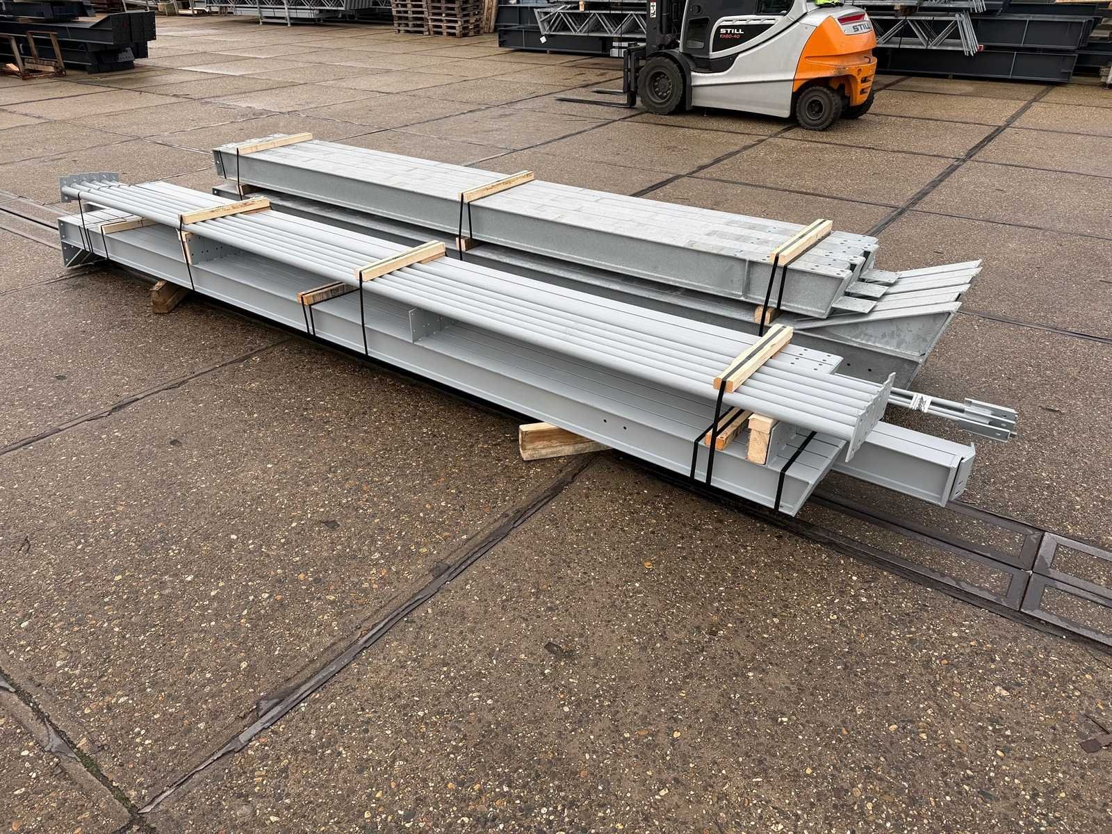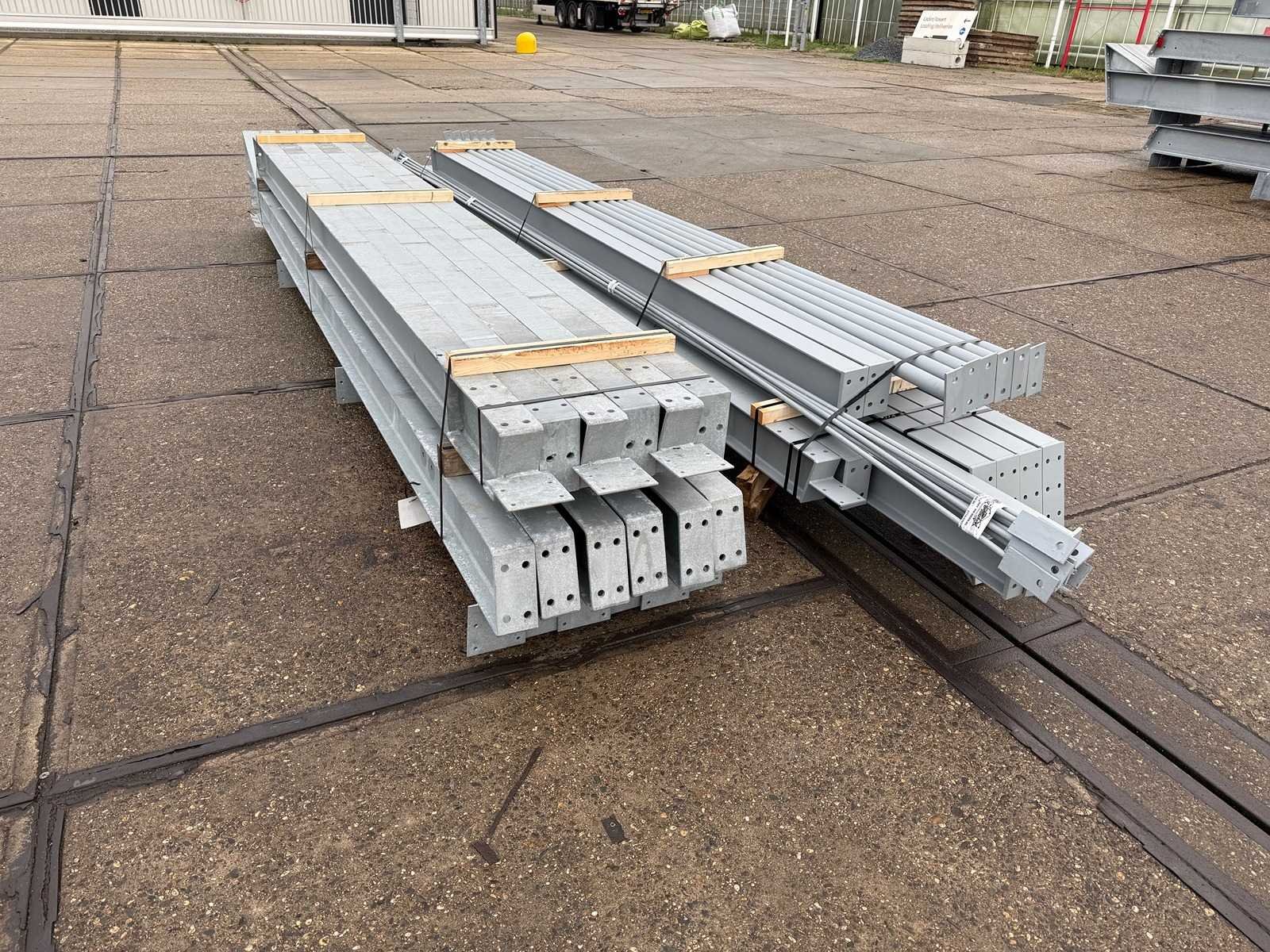 Vrije overspanning, spanten h.o.h. 5000mm, bestaande uit 3 sets tussenspanten IPE200, 2 sets eindspanten met windstijlen IPE160, voorzien van windverbanden, drukkokers, gordinglippen op de spanten, detailtekening tussenspanten, staalconstructie ligt netjes transportklaar en dient met 1 trailer opgehaald te worden, kavel wordt gratis geladen met een heftruck No Materiaal: Thermisch verzinkt en geschilder staal Totaal oppervlakte: 200m² Nok hoogte: 5875mm Goot hoogte: 4500mm Totale afmeting L: 2000mm Totale afmeting Breedte: 10000mm