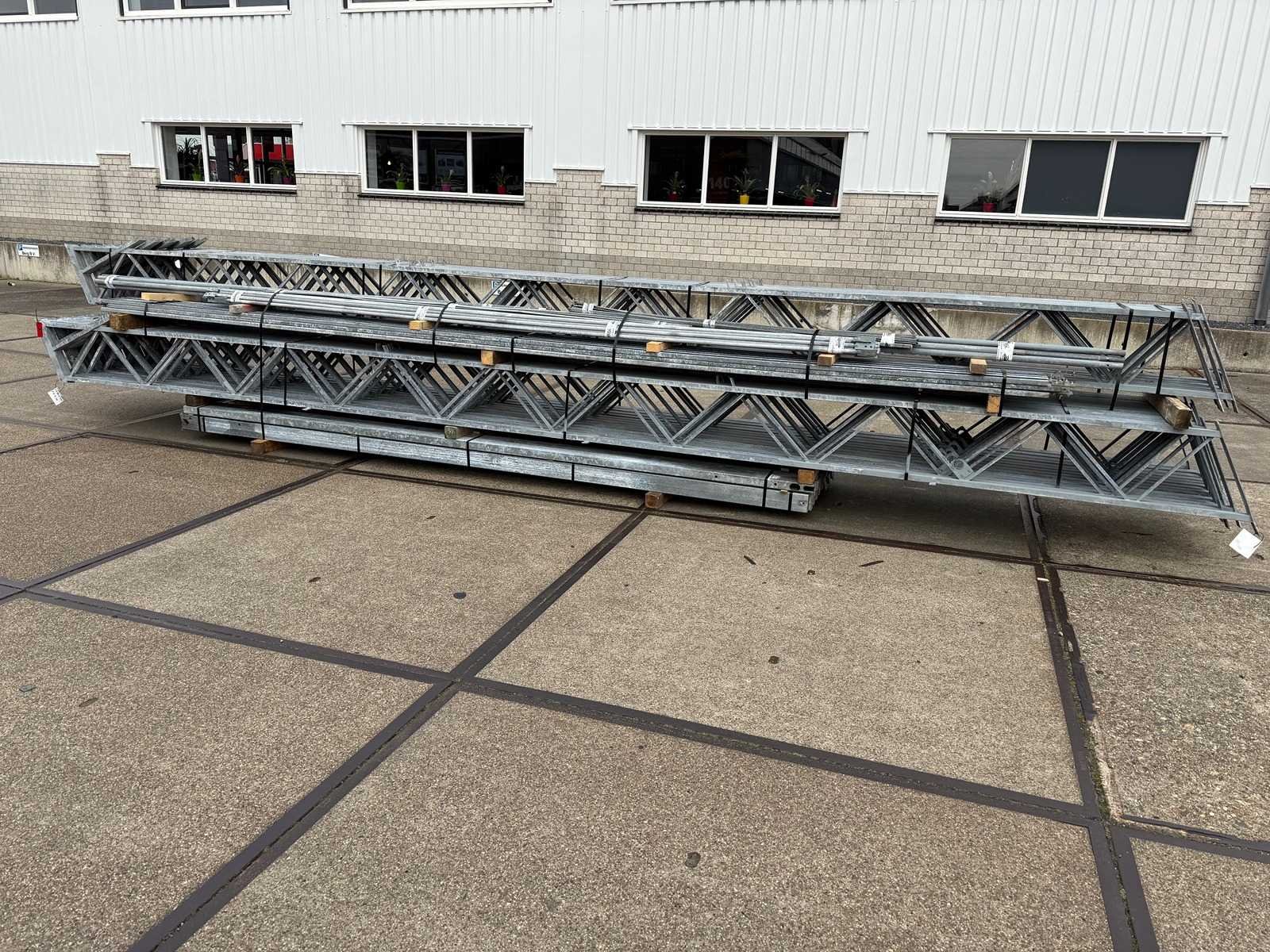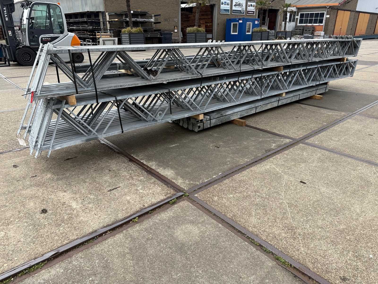Overspanning trekstang tussen de spanten; spanten h.o.h. 4000mm; kokerprofiel als staanders en traliespanten; staaltekening; 3D-tekening; dakhelling 25 graden; 11 sets tussenspanten; voorzien van trekstangen met ophangstrips; windverbanden en kruisschoren; kavel ligt netjes transportklaar en dient met 1 trailer opgehaald te worden; kavel wordt gratis met een heftruck geladen No Materiaal: Gegalvaniseerd staal Totaal oppervlakte: 512m² Nok hoogte: 6600mm Goot hoogte: 4100mm Totale afmeting L: 40000mm Totale afmeting Breedte: 12800mm