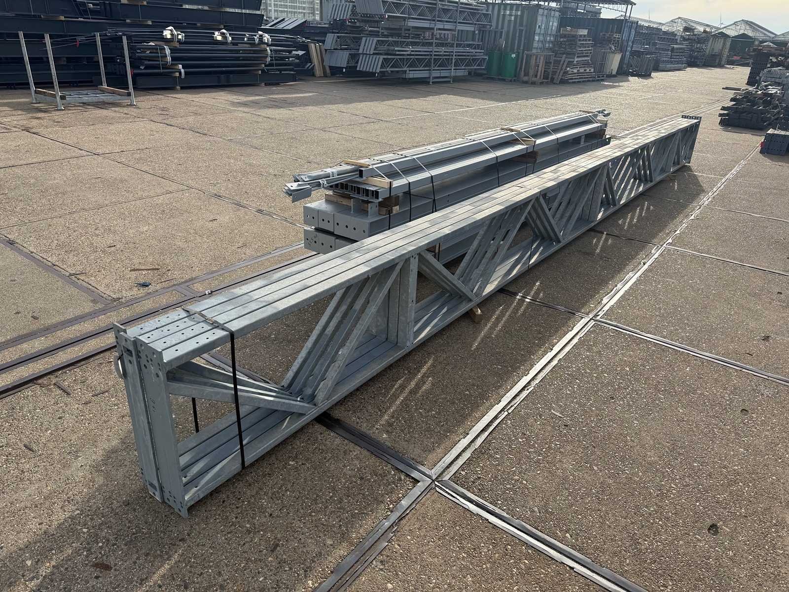 Zware platdak staalconstructie; vrije overspanning; spanten h.o.h. 5000mm; bestaande uit 4 sets tussenspanten zware tralieliggers met HEA140 als staanders; 2 sets eindspanten met windstijlen in IPE140 voorzien van windverbanden en kruisschoren; staalconstructie ligt netjes transportklaar en dient met 1 trailer opgehaald te worden; kavels wordt gratis met een heftruck geladen No Materiaal: Gegalvaniseerd en geschilderd staal Type: Platdak Totaal oppervlakte: 240m² Nok hoogte: 5250mm Goot hoogte: 5250mm Totale afmeting L: 25000mm Totale afmeting Breedte: 9600mm