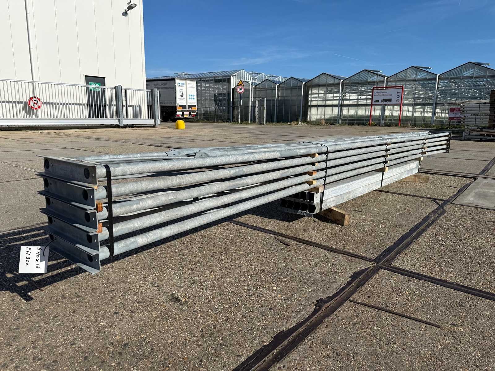 Platdak staalconstructie; vrije overspanning; spanten h.o.h. 4000mm; bestaande uit 5 sets tralieliggers met kokers als staanders; voorzien van windverbanden en kruisschoren; staalconstructie ligt netjes transportklaar en dient met 1 trailer opgehaald te worden; kavels wordt gratis met een heftruck geladen No Materiaal: Gegalvaniseerd staal Type: Platdak Totaal oppervlakte: 102m² Nok hoogte: 3000mm Goot hoogte: 3000mm Totale afmeting L: 16000mm Totale afmeting Breedte: 6400mm
