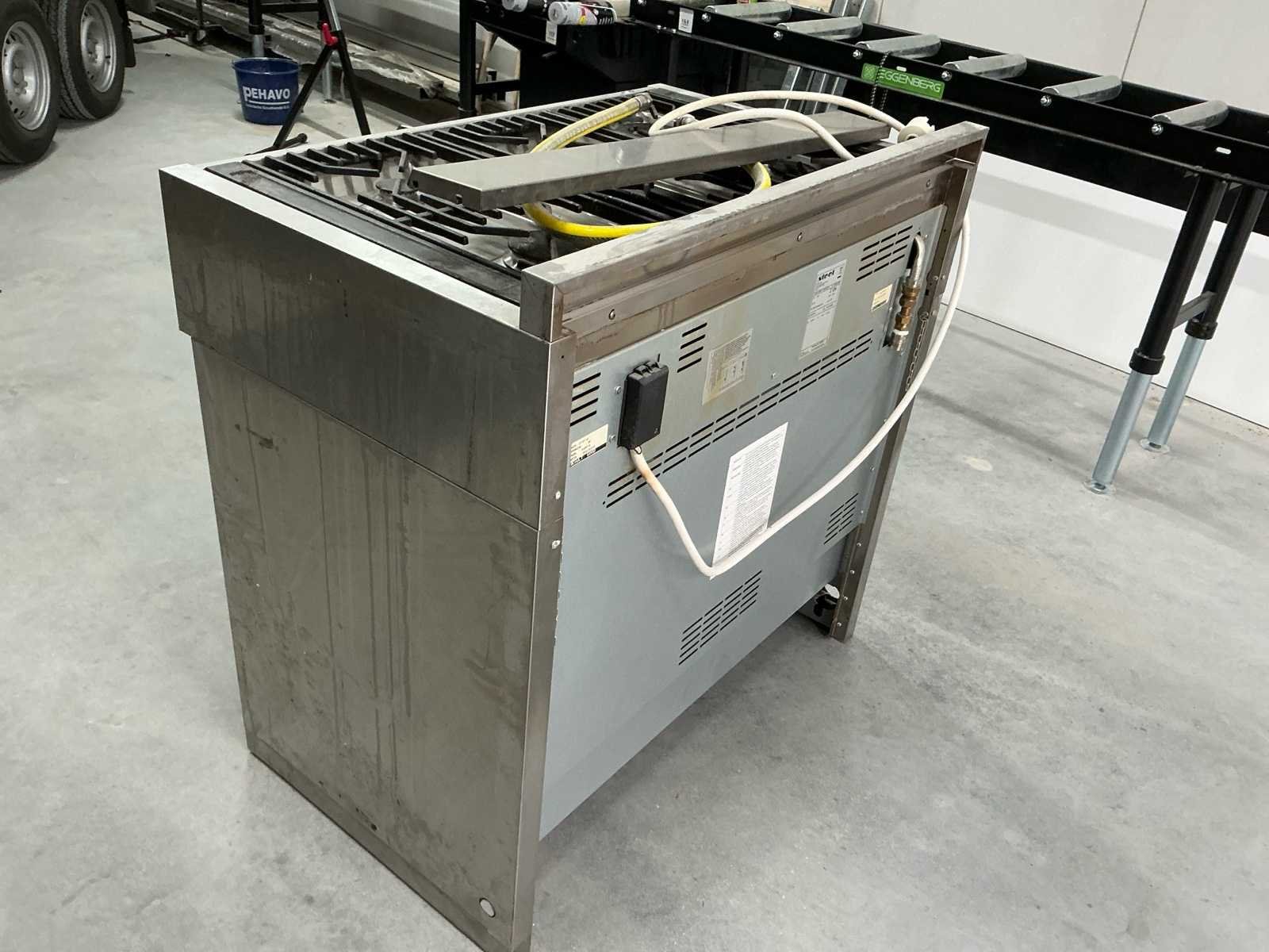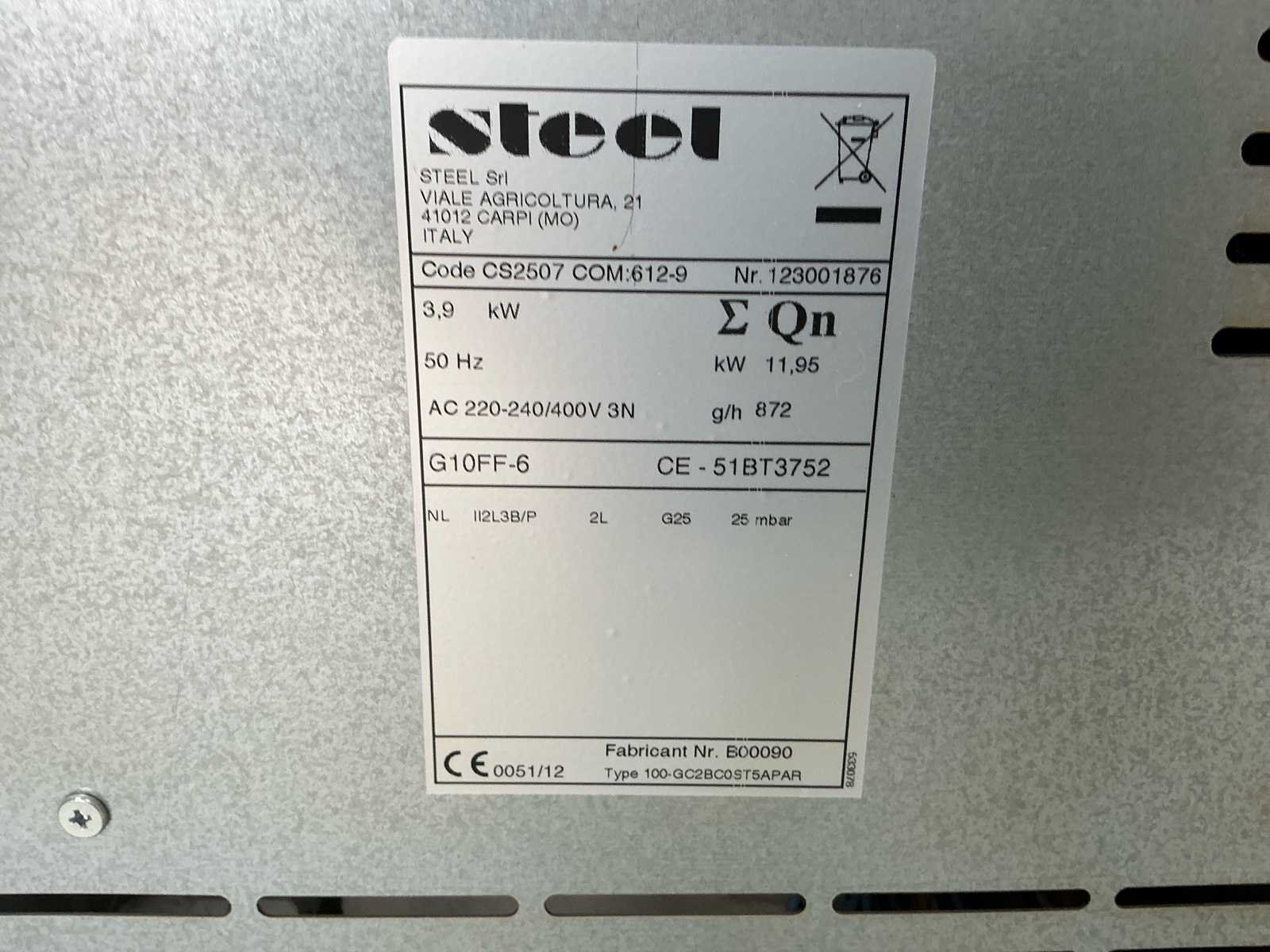 Voorzien van: Steel professioneel fornuis met gas kookplaat en elektrische oven en afzuigkap. , 3-fase aansluiting 380–400V/50Hz met totaal vermogen ±11,85 kW voor de oven en gasbranders bovenop, No Merk: Steel Type: 100-GC2BC0ST5APAR Materiaal: RVS Serienummer: 123001876 Aansluiting: 390V Eigen gewicht: 100kg Gas: true Elektrisch: true Rvs: true Vermogen: 12kW Totale afmeting L: 65cm Totale afmeting Breedte: 100cm Totale afmeting Hoogte: 85cm Bouwjaar: 2012