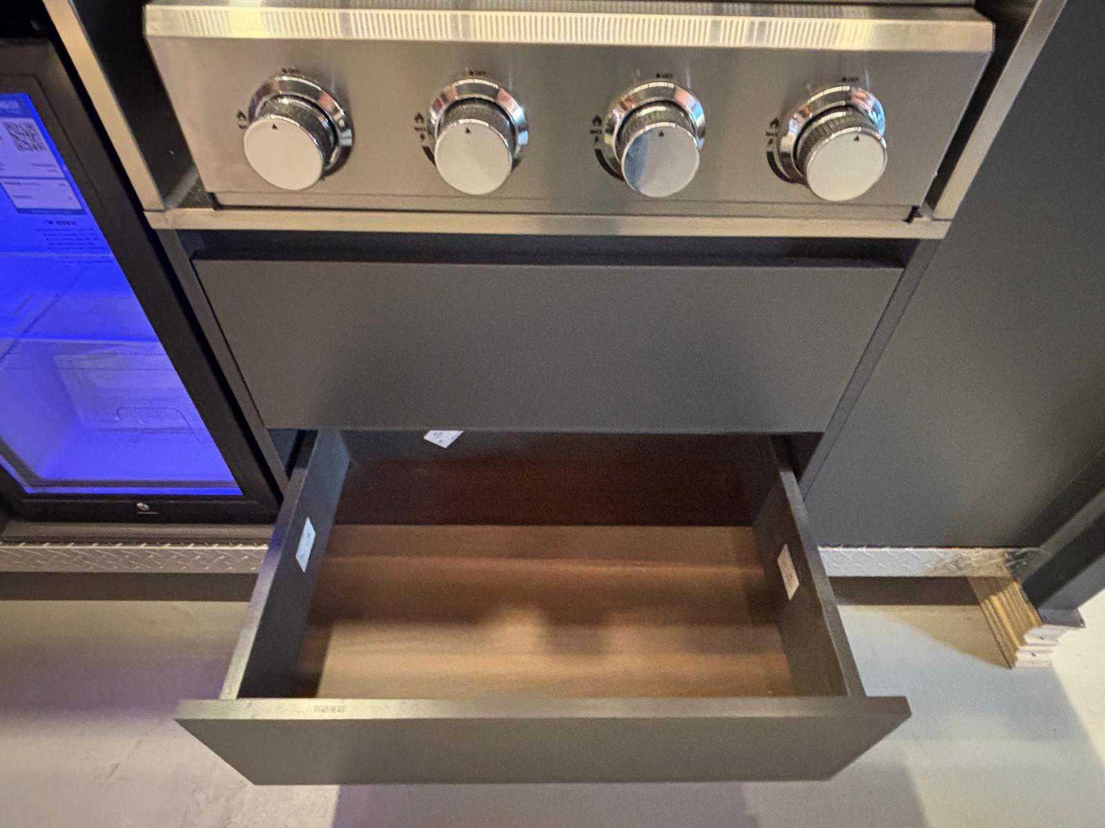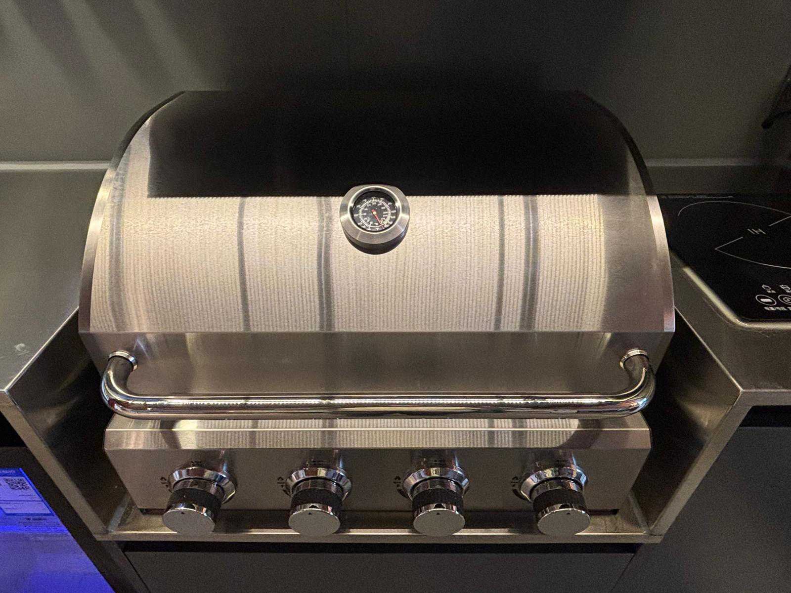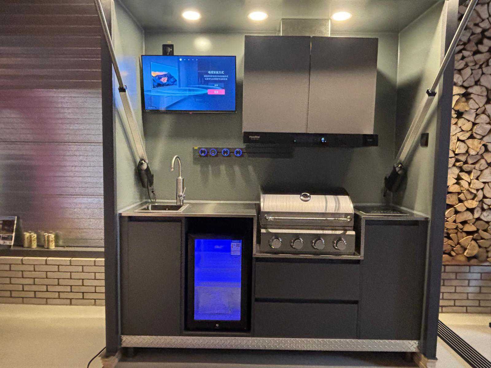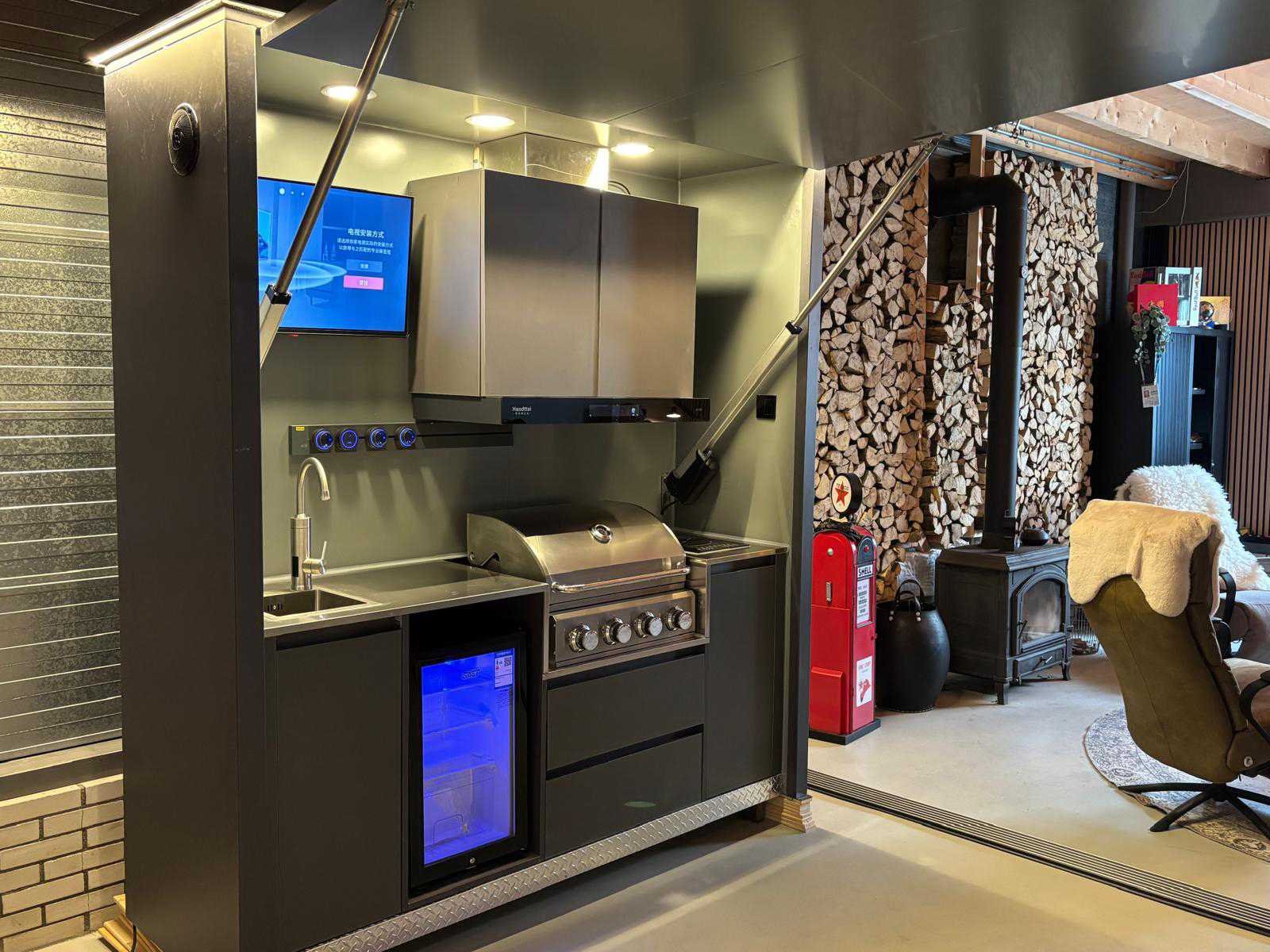 Voorzien van elektrisch bedienbare klep met afstandsbediening Geschikt om af te sluiten en netjes weg te werken wanneer niet in gebruik Uitgeklapt volledig functionele buitenkeuken met uitgebreide voorzieningen Geïntegreerde BBQ/grill met bedieningsknoppen Inductiekookplaat RVS spoelbak met mengkraan Ingebouwde koelkast met glazen deur en verlichting Meerdere opbergkasten en lades Geïntegreerde televisie/display Meerdere stroompunten inclusief 230V stopcontacten USB- en USB-C aansluitingen aanwezig Interne elektrische installatie met zekeringkast Robuuste constructie met metalen afwerking Voorzien van geïntegreerde verlichting in de kap Inclusief afstandsbediening voor bediening van de klep Geschikt voor zowel particulier als professioneel gebruik Visueel in goede en complete staat Nee Lengte: 214cm Breedte: 71cm Hoogte: 244cm