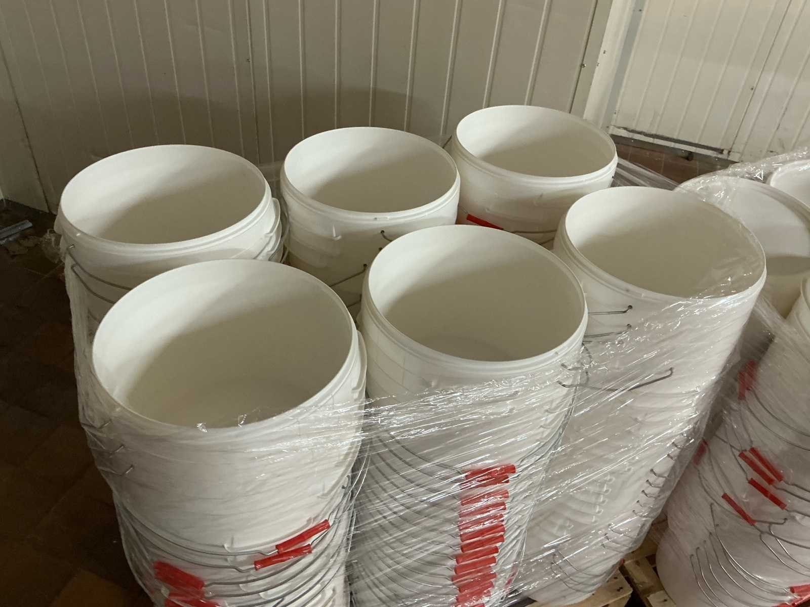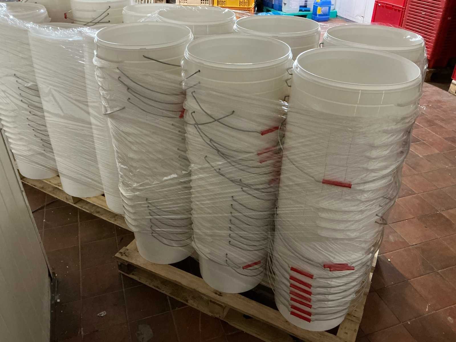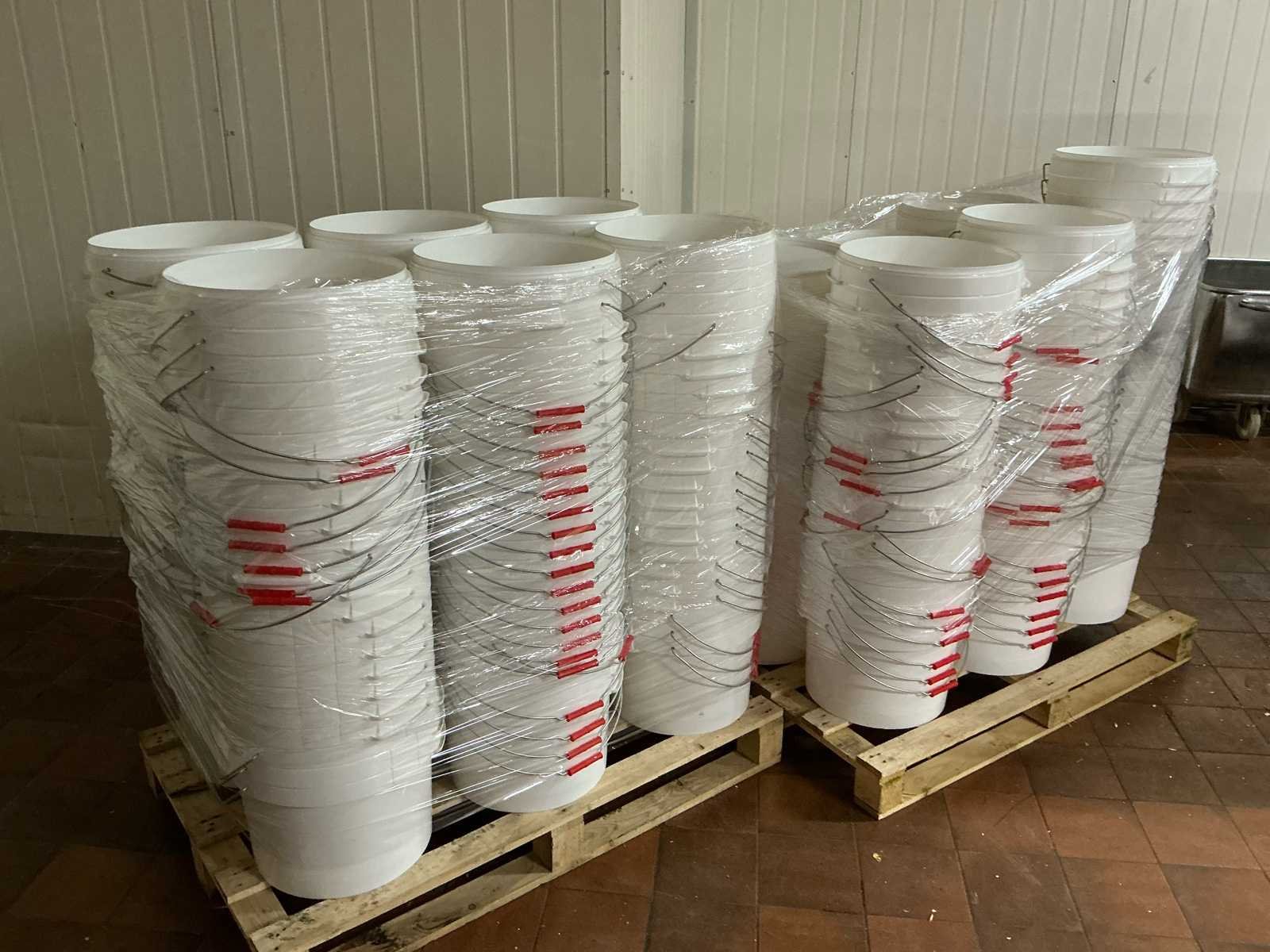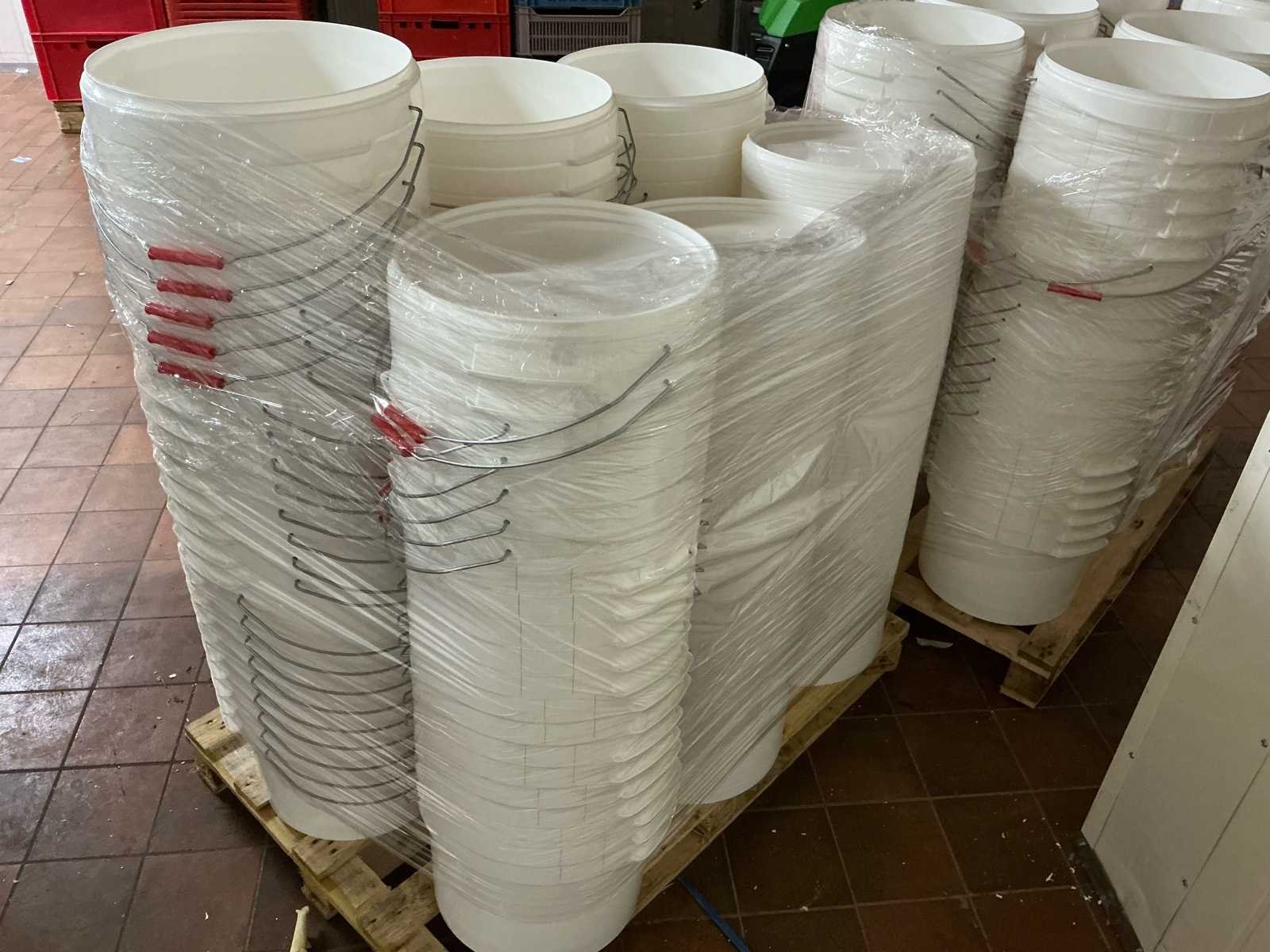 2x pallets met nieuwe Auer emmers Type ER22-375 Geschikt voor levensmiddelen Circa 200 stuks 22 liter inhoud Voorzien van hengsel met grijprol Voorzien van afsluitdeksel 37 cm breed 27 cm hoog Nee Merk: Auer Model: ER22-375 Product type: Emmer met deksek Kleur: Wit Breedte: 37cm Hoogte: 27cm Materiaal: Kunststof