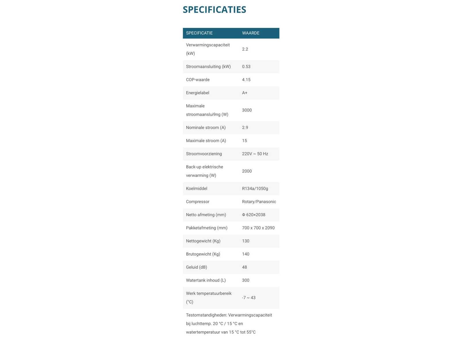 Te bedienen via Wifi, Verwarmingscapaciteit (kW) 2.2, Stroomaansluiting (kW) 0.53, COP-waarde 4.15, Energielabel A+, Maximale stroomaanslui9ng (W) 3000, Nominale stroom (A) 2.9, Maximale stroom (A) 15, Stroomvoorziening 220V ~ 50 Hz, Back-up elektrische verwarming (W) 2000, Koelmiddel R134a/1050g, Compressor Rotary/Panasonic, Netto afmeting (mm) Φ 620×2038, Pakketafmeting (mm) 700 x 700 x 2090, Nettogewicht (Kg) 130, Brutogewicht (Kg) 140, Geluid (dB) 48, Watertank inhoud (L) 300, Werk temperatuurbereik (°C) -7 ~ 43 Nee Merk: Technopump Product type: YT-300 TB1 Gewicht: 140kg Leveringsvoorwaarden: Heftruck aanwezig op locatie!